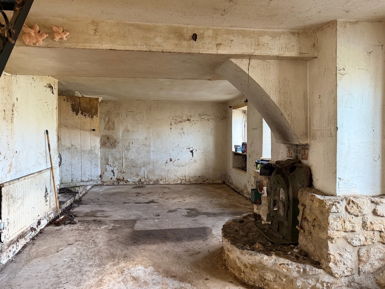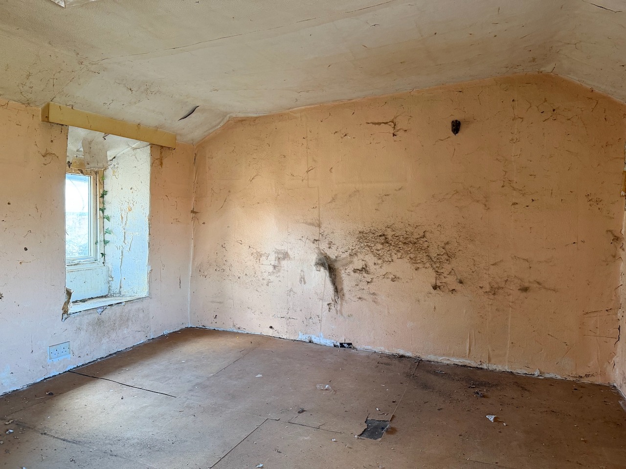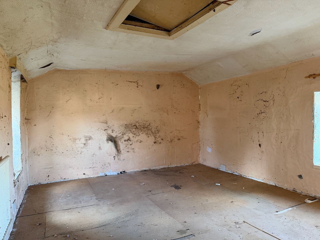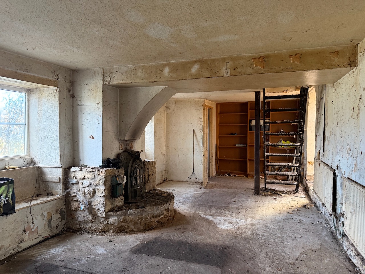 Downstairs, there is a large front room with space for seating and dining areas, with a wood-burning stove in the heart of the room. At the rear, there is a kitchen and bathroom, but it should be noted that this single-storey extension requires demolition.