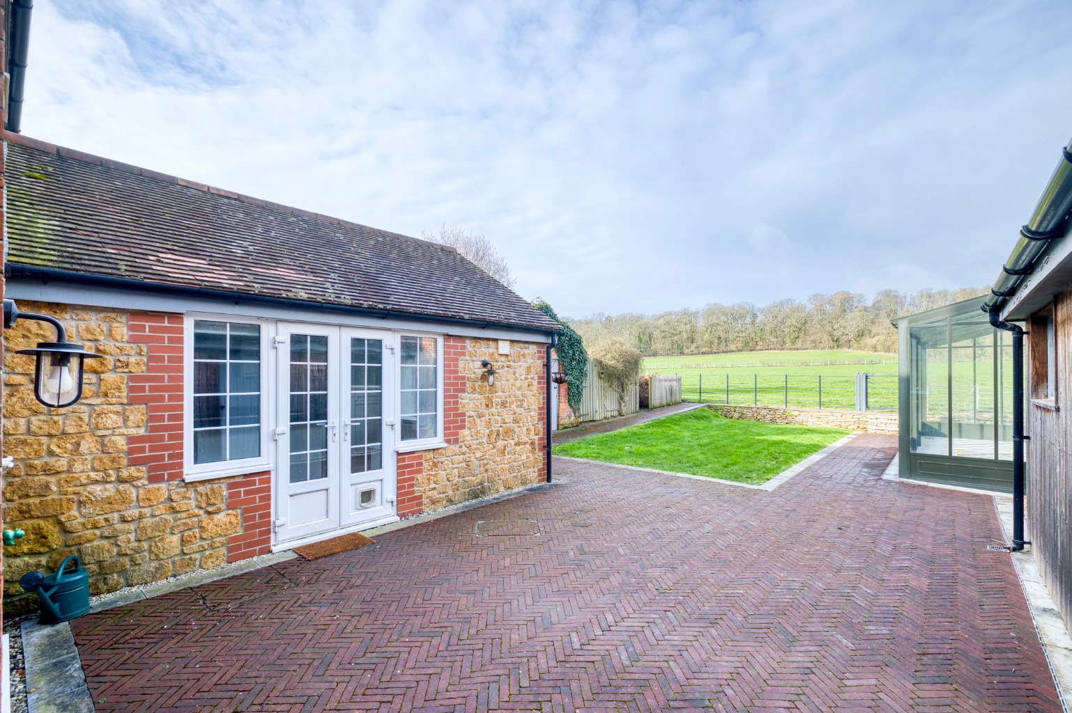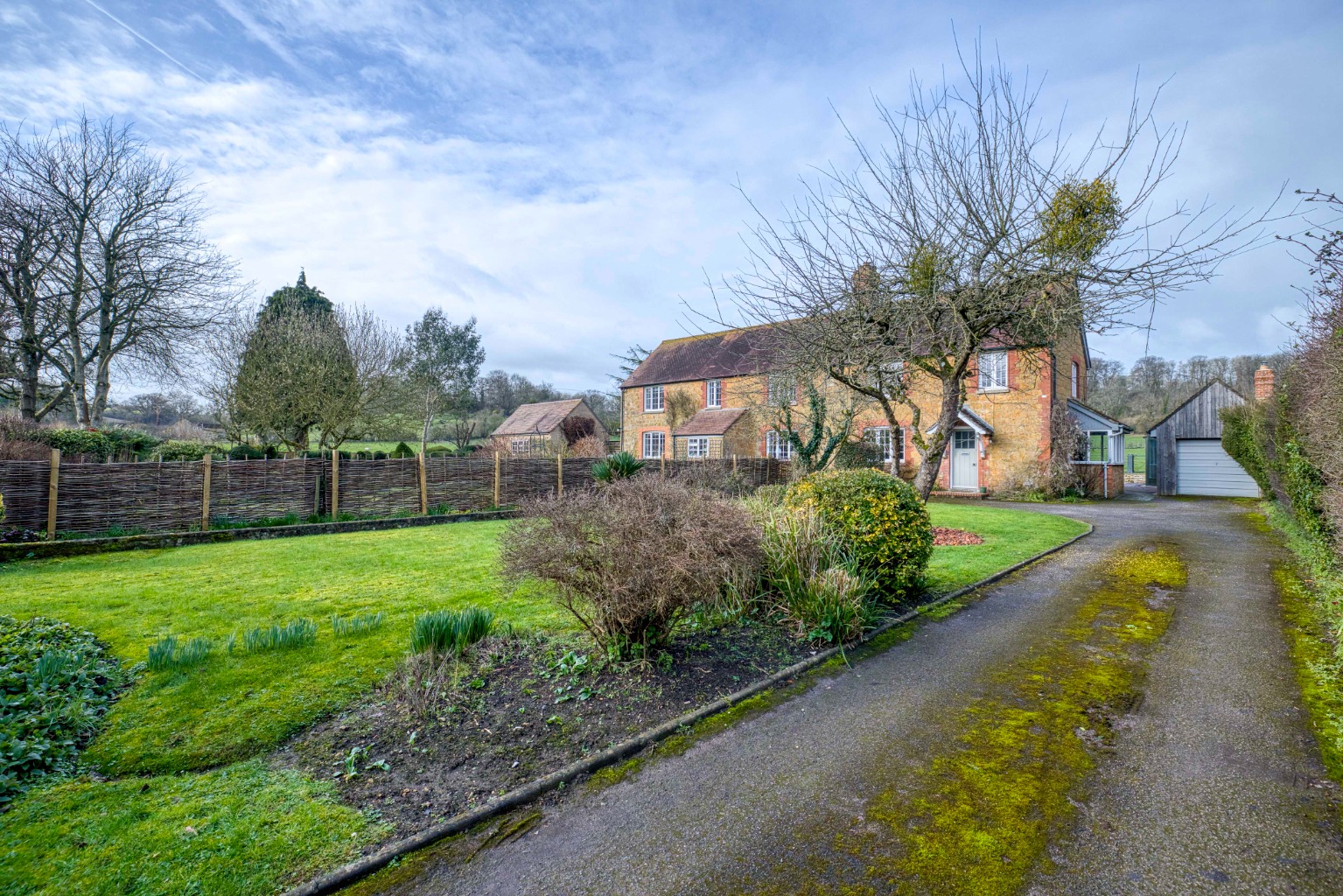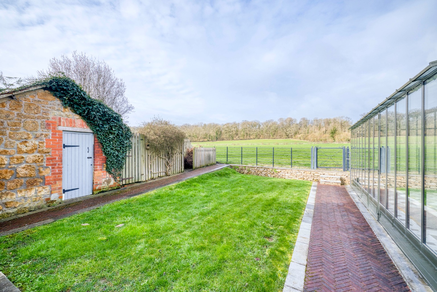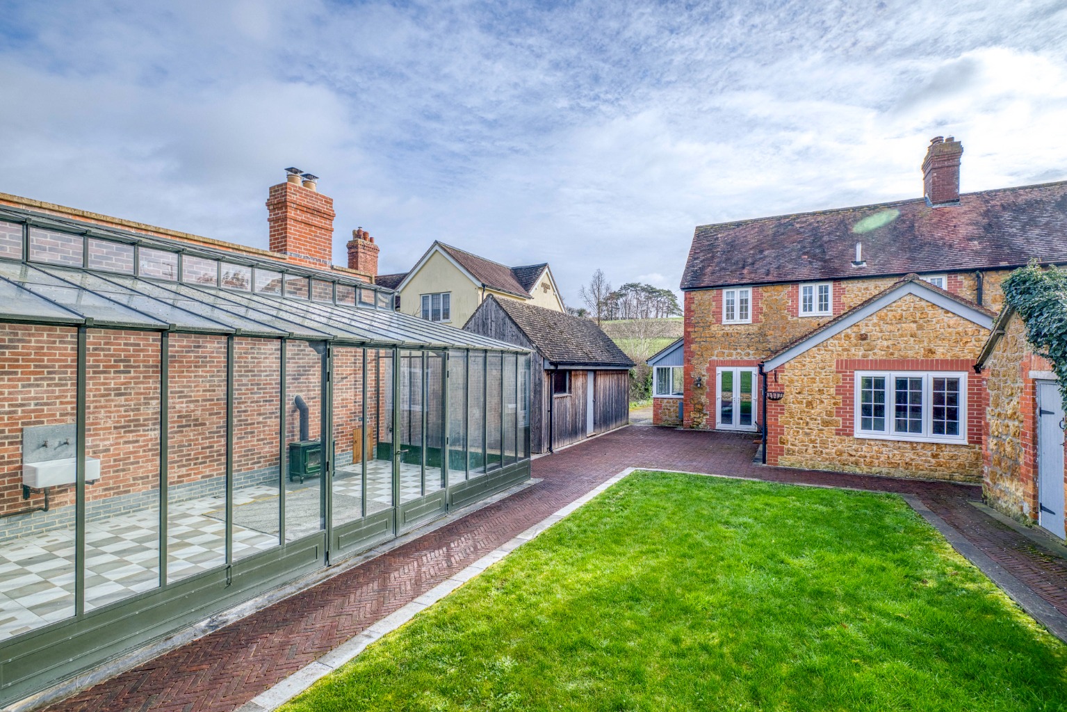 Garage, driveway parking, lawned gardens and bespoke detached glasshouse with wood-burner for year-round use.