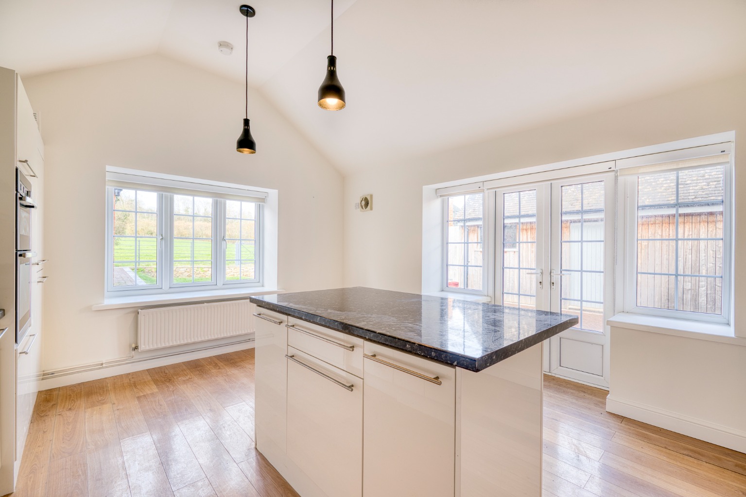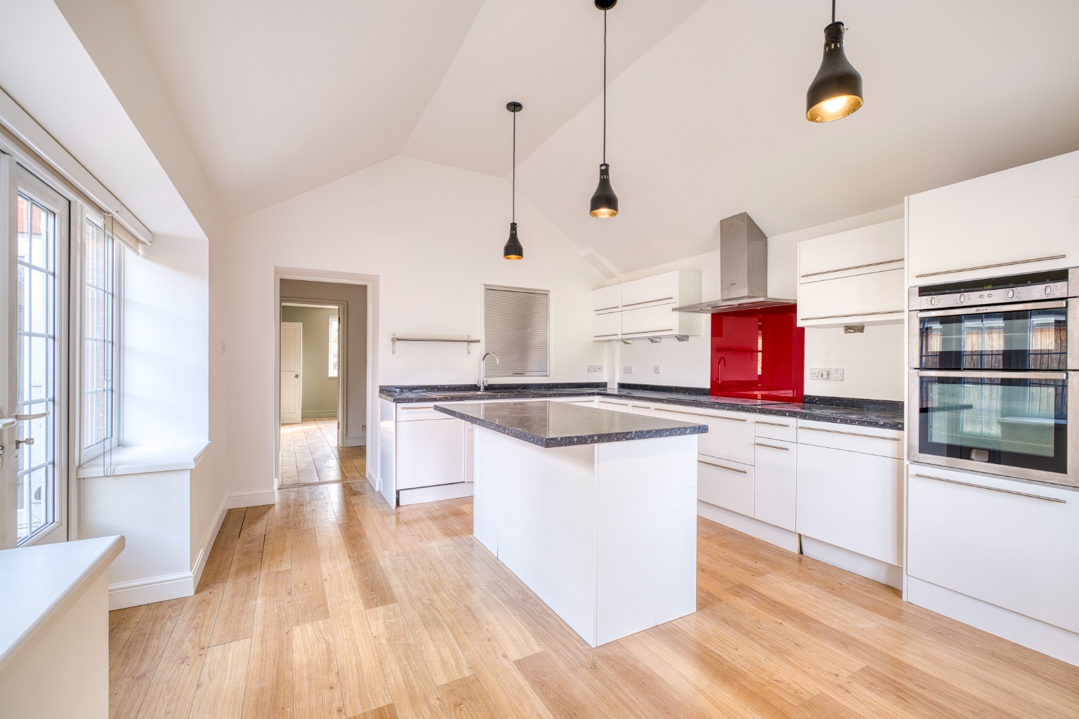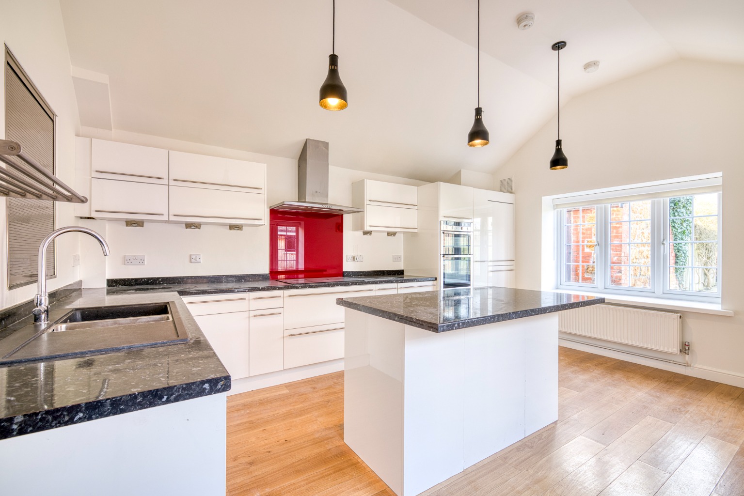 Sitting room with wood burner, contemporary kitchen/dining room with appliances, additional reception room/study