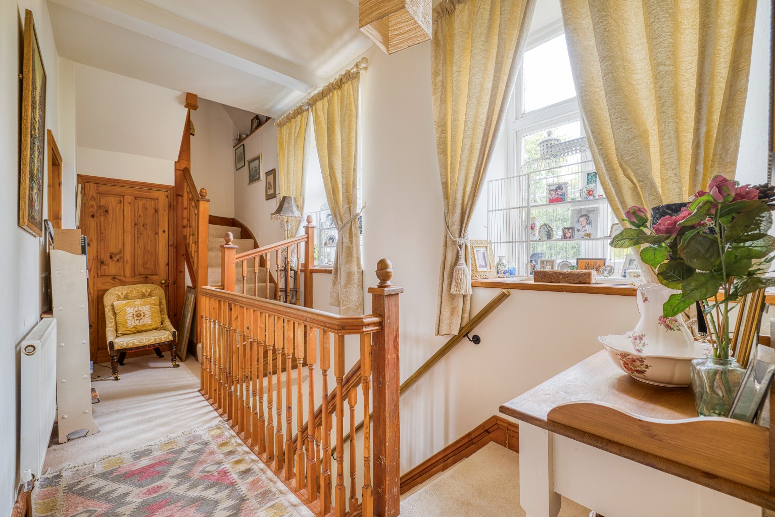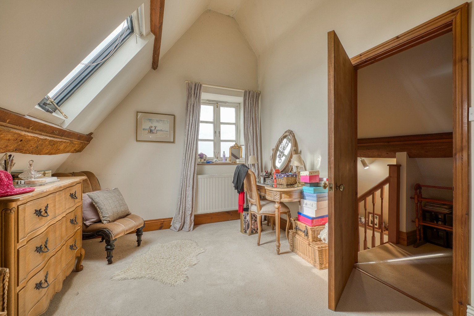 Large second-floor master suite with exposed beams, built-in wardrobes and ensuite shower room
