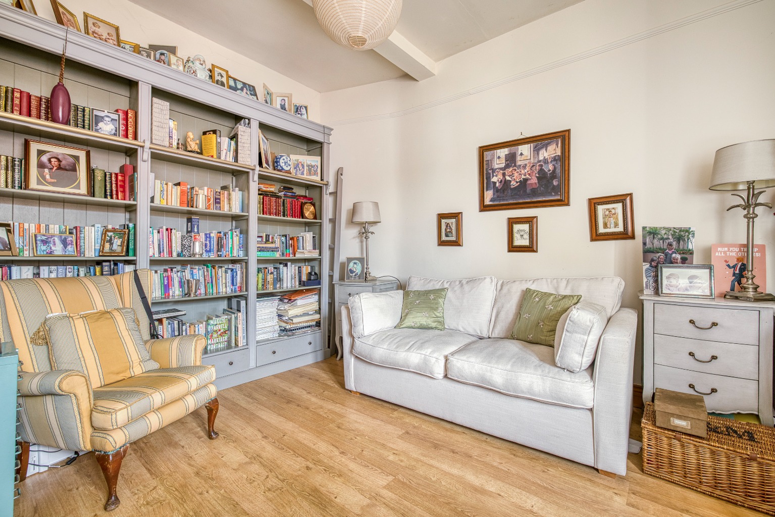 Dual-aspect sitting room featuring a central fireplace with electric wood-effect stove