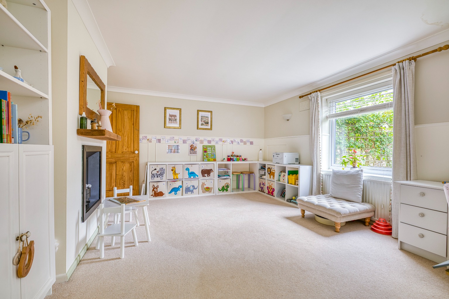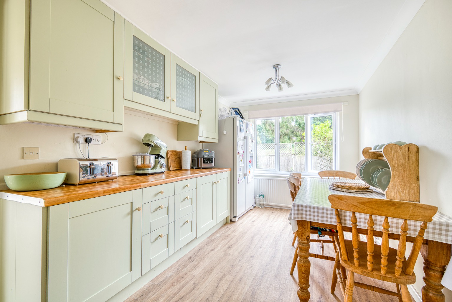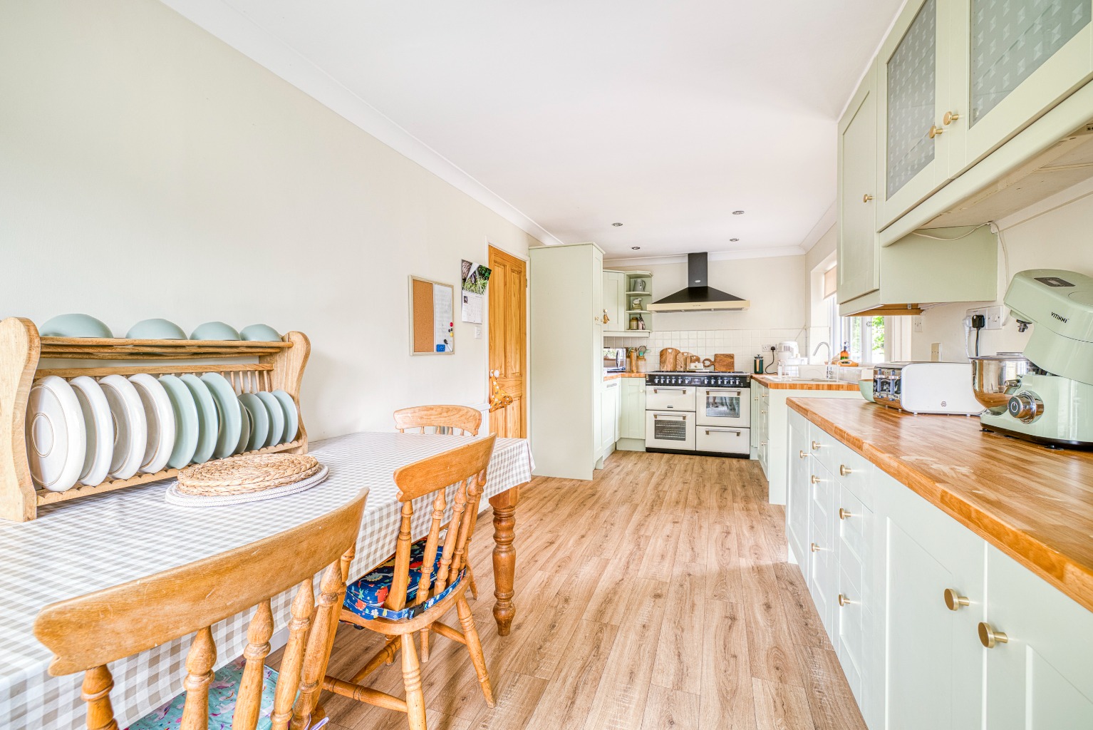 The kitchen is an impressive space, well fitted with a comprehensive range of wall and base units providing excellent storage. The dual aspect windows bring in plenty of natural light and create a bright, welcoming room. Fittings include a built-in dishwasher, a Stoves double oven with extractor hood, and a sink with drainer. There is space for a free-standing double fridge freezer and for a large dining table, making this the real hub of the home.