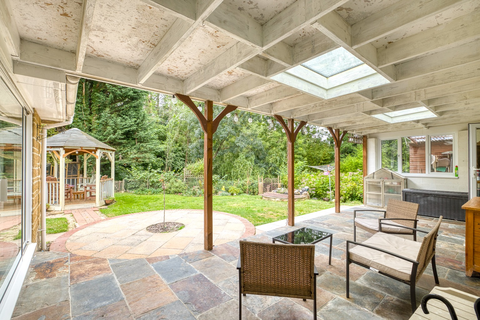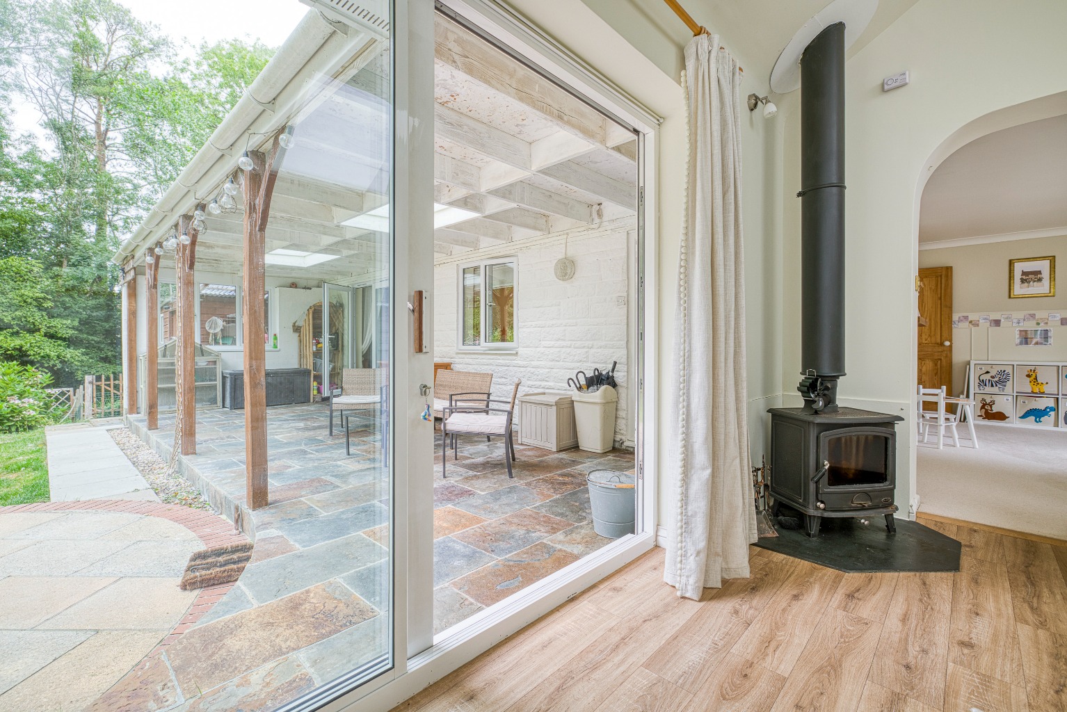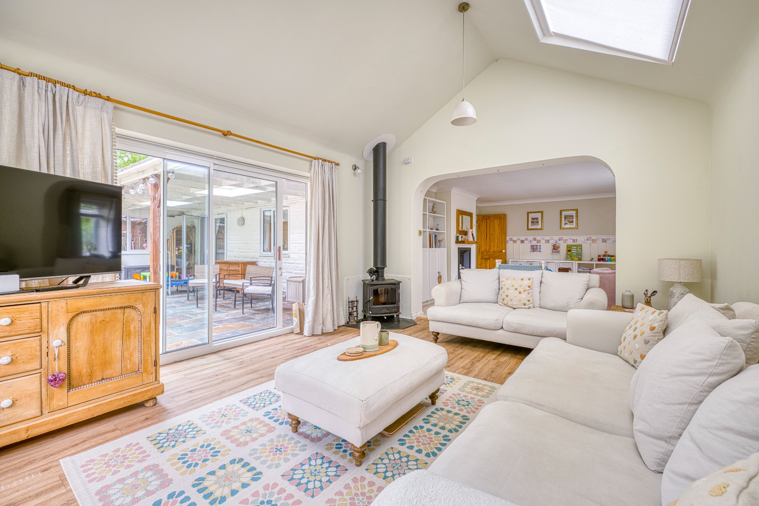 The dining and sitting rooms are arranged in an open-plan style at the rear of the house. The dining room has a coal-effect gas fire, new carpets, smart panelling and a pretty outlook to the side rose garden. This space flows naturally into the sitting room, which is a superb addition to the house. Here, there is a newly fitted log burner, a large feature window overlooking the rear garden, and a vaulted ceiling with Velux windows that fill the room with natural light. Sliding patio doors complete the room and open directly onto...