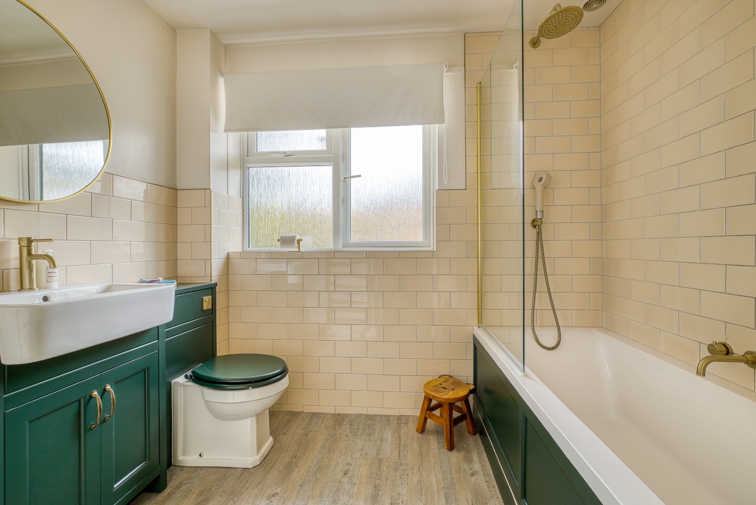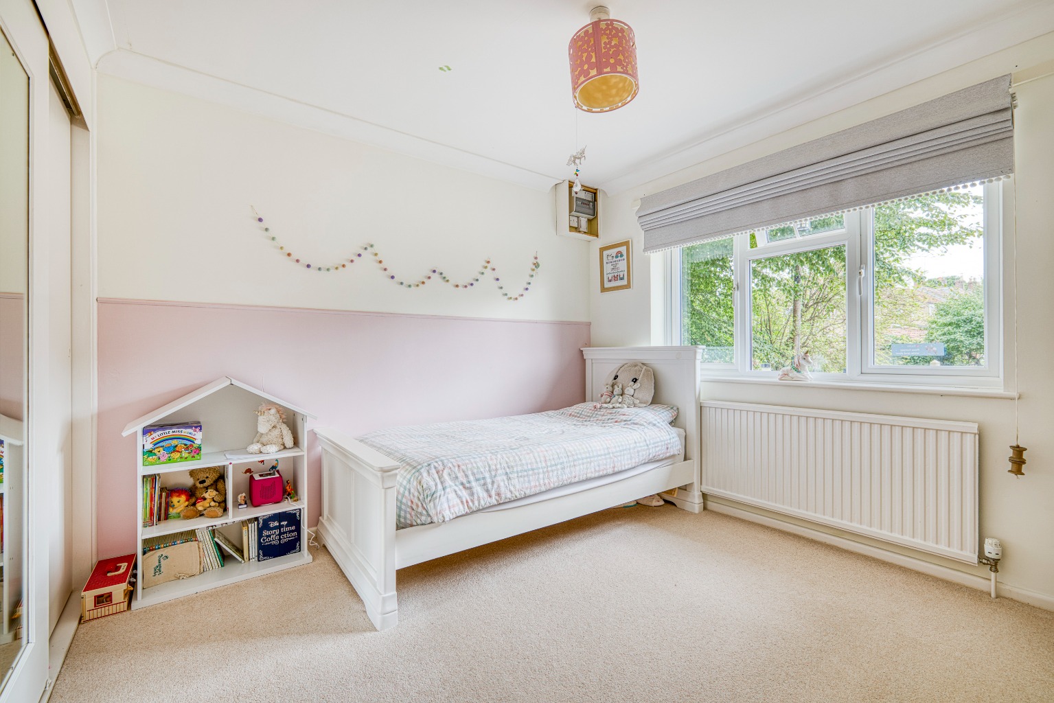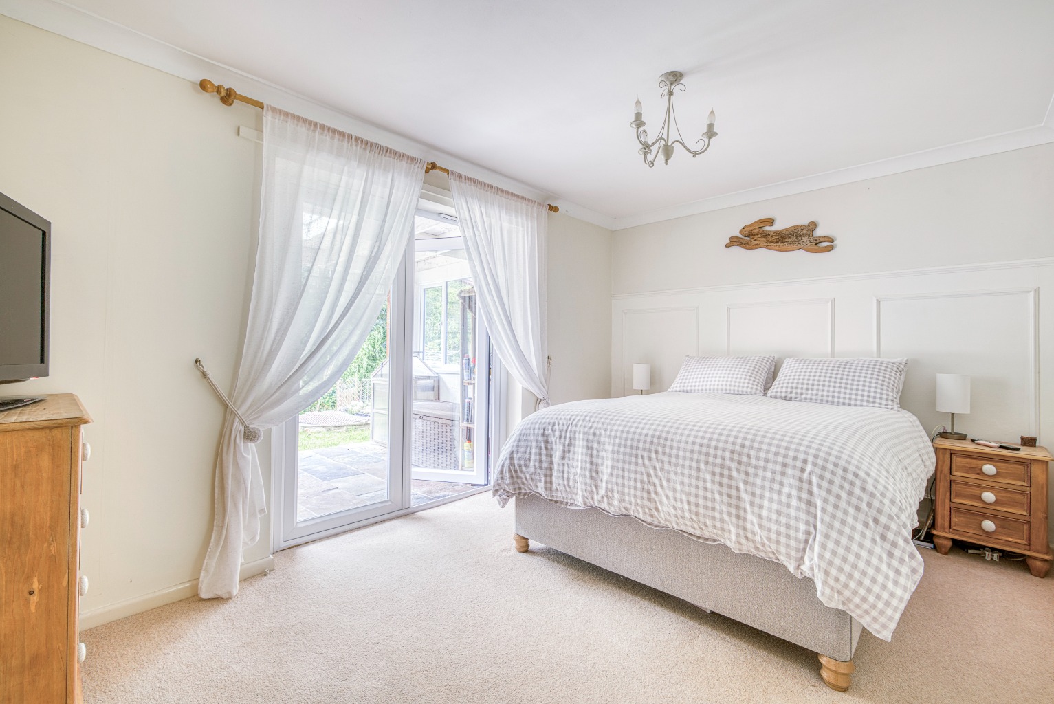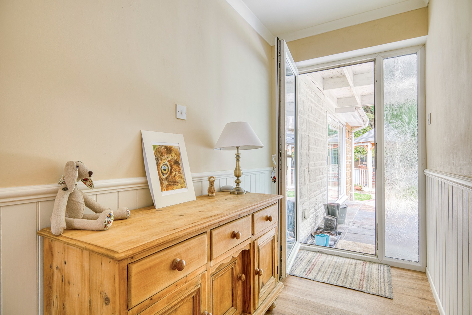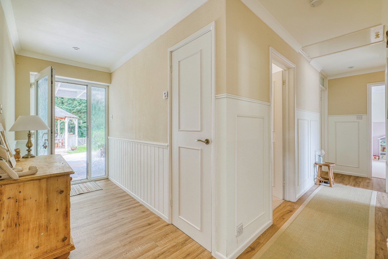 Through the hallway—newly decorated with stylish panelling and wooden flooring—are doors leading to all bedrooms, the bathroom and the main living accommodation.