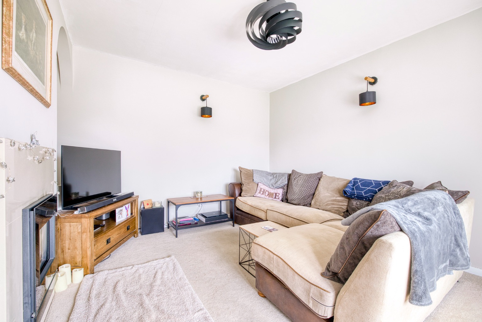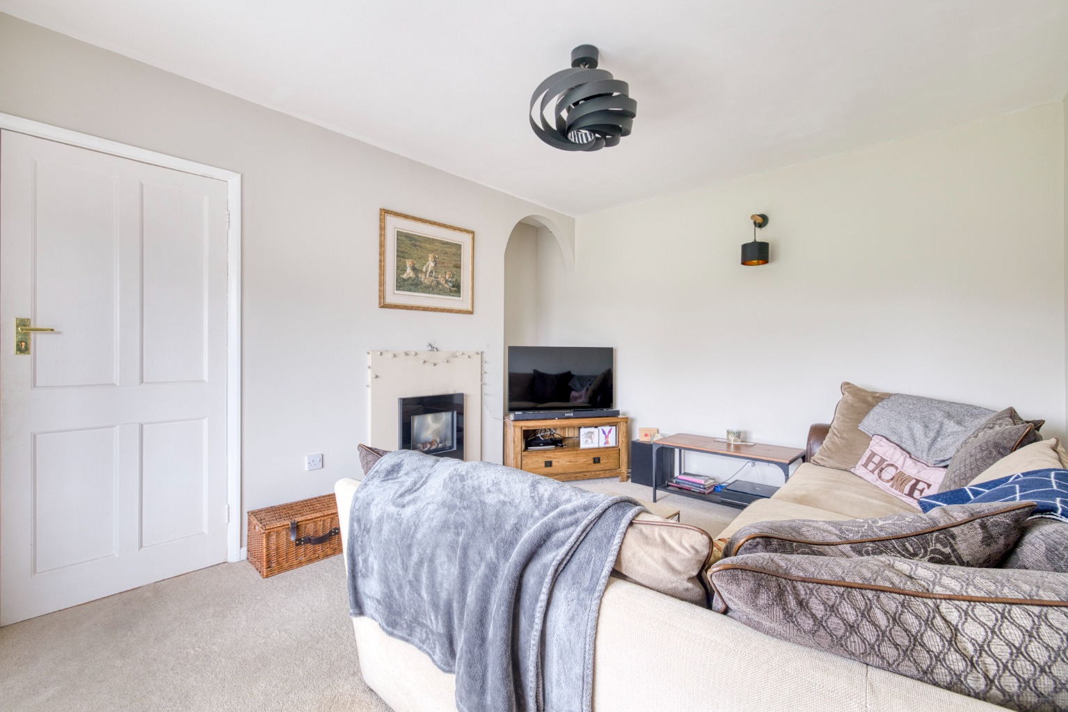The living room is carpeted and benefits from a generous front-facing bay window that allows plenty of natural light to flow in, while a central fireplace keeps the room feeling comfortable and inviting.