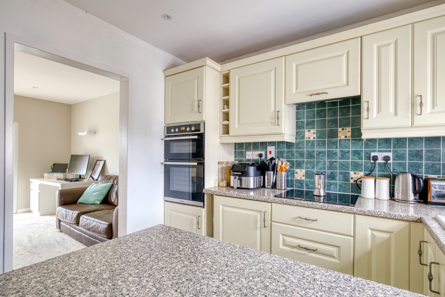 The kitchen is fitted with a range of wall and base units, complemented by a tiled splashback and electric hob with extractor above. A window overlooks the rear garden, while a breakfast bar provides additional workspace and storage. Further features include a head-height oven and doors leading through to the utility room and back into the hallway.