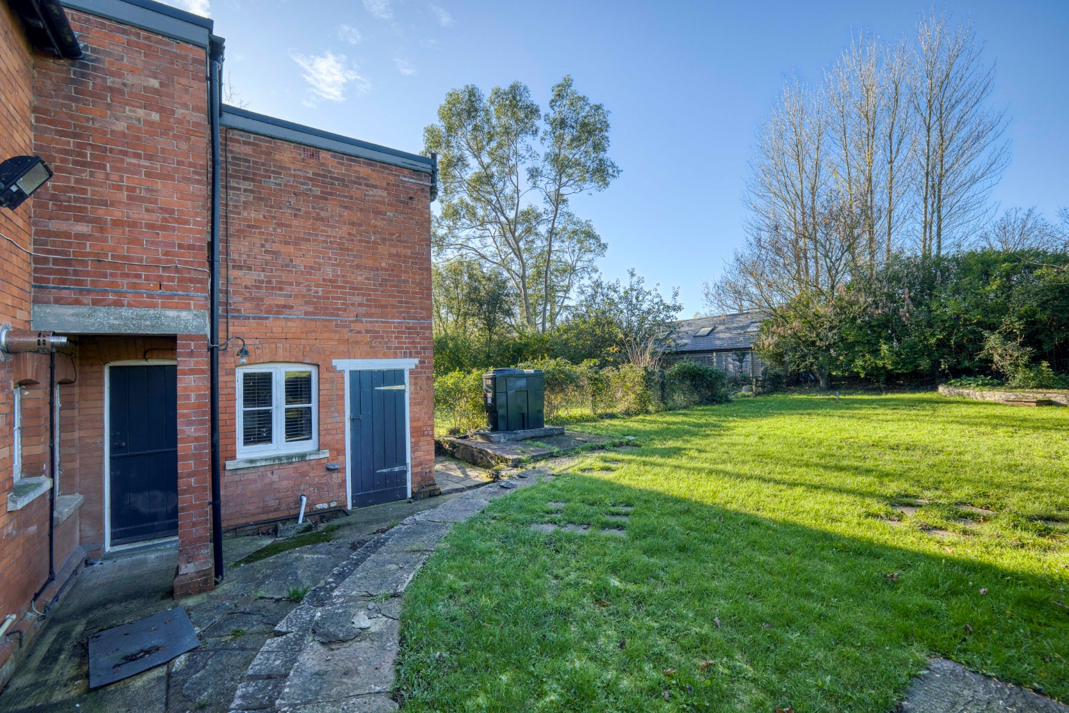 A shared forecourt lies before the cottage’s lawned front garden, with a right of access across it to the parking area and garage.