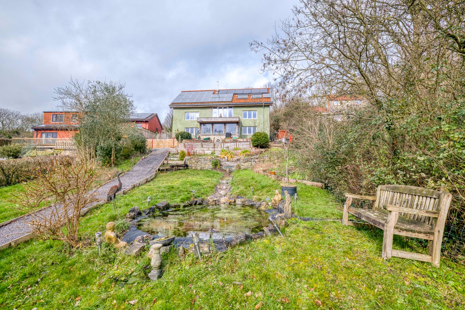 Raised beds and garden with pond and mature trees