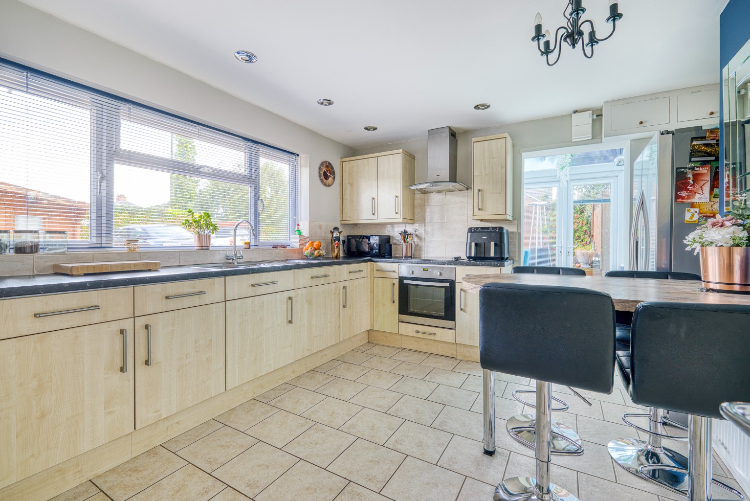 The kitchen is well fitted with a good range of wall and base units, finished with granite-effect worktops and an inset one-and-a-half bowl sink. Appliances include an integrated dishwasher, electric oven, and hob with a cooker hood above. There is also plumbing and space for a washing machine and fridge/freezer. A utility cupboard provides additional storage, while a window to the front offers a pleasant view over the front garden.