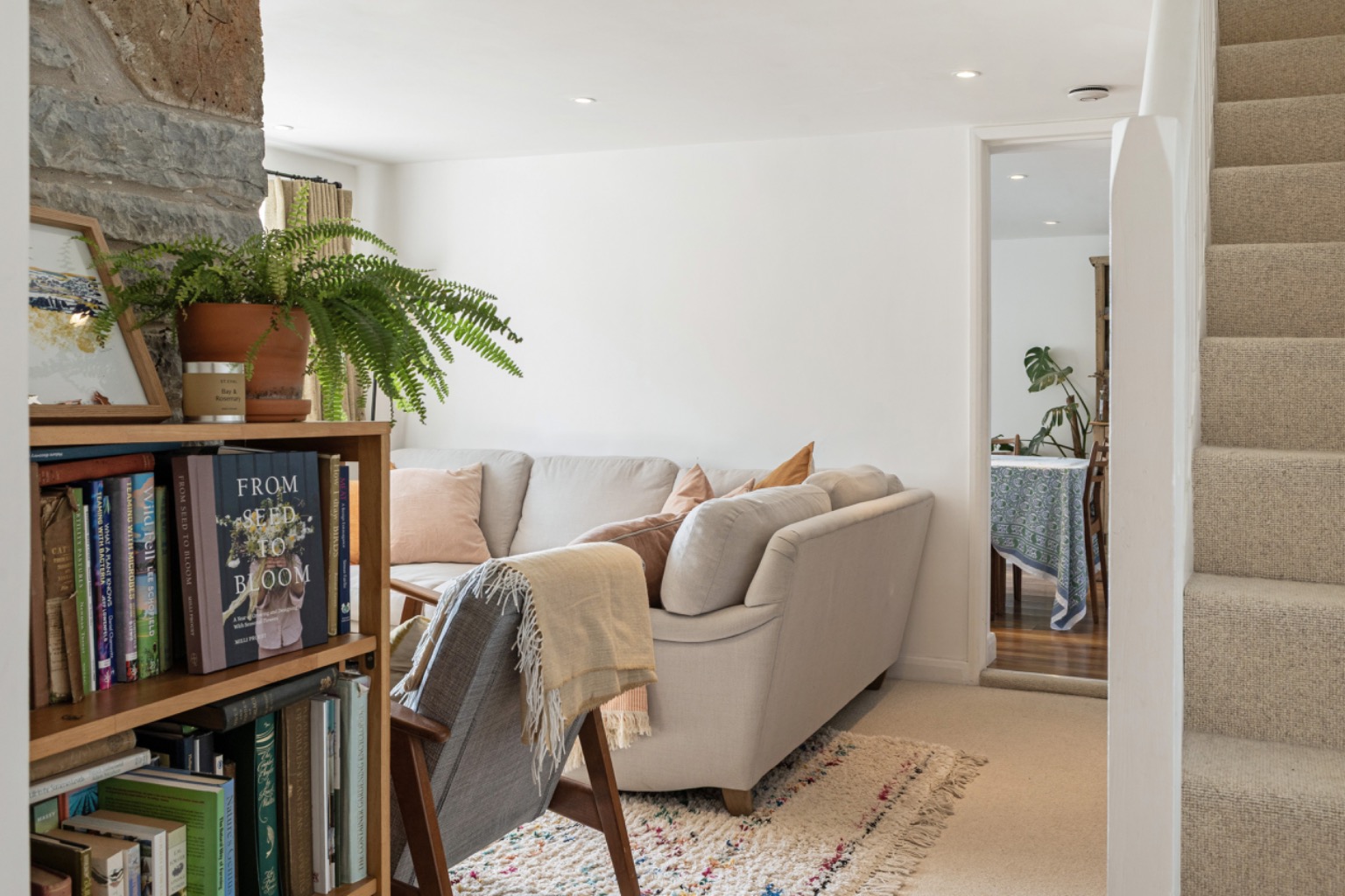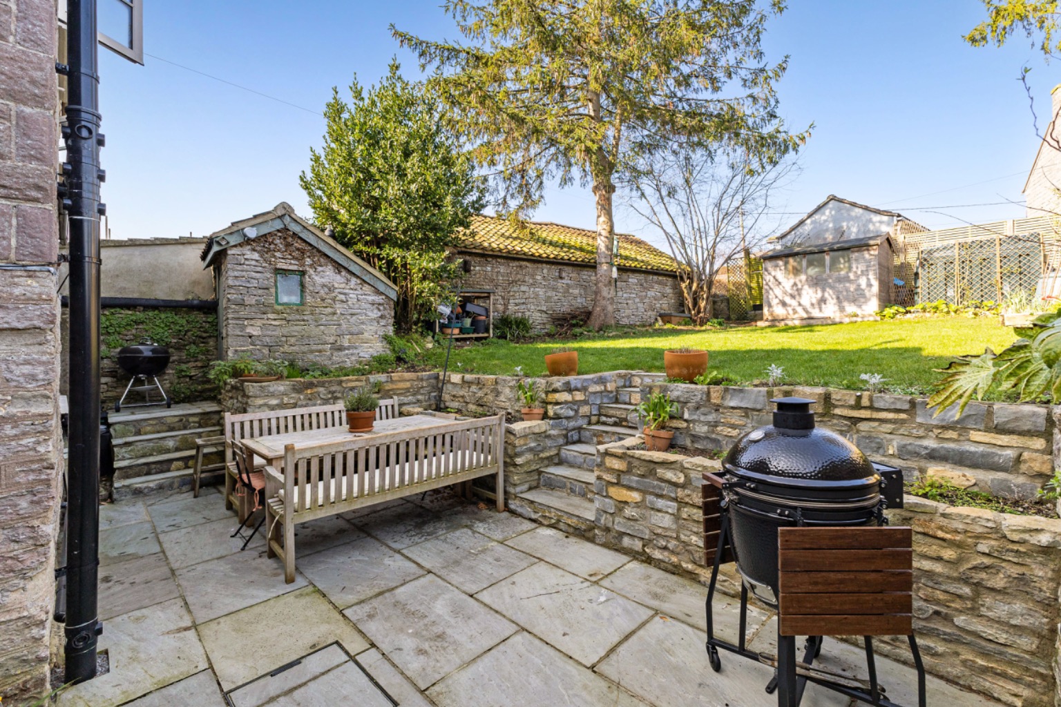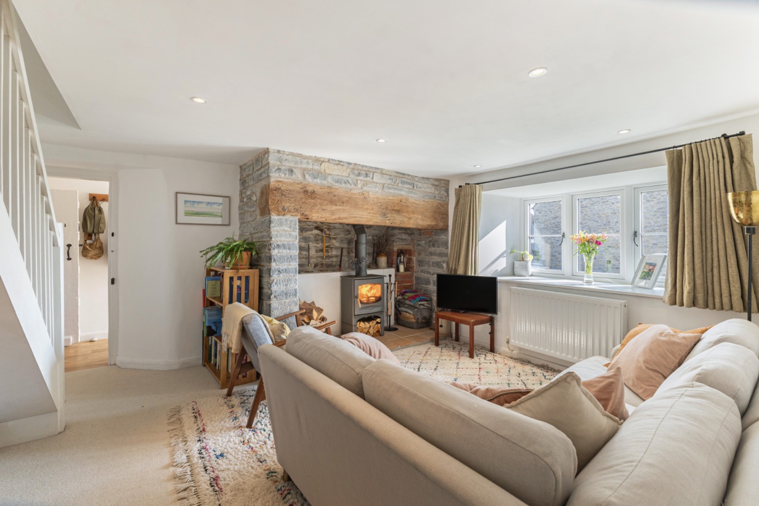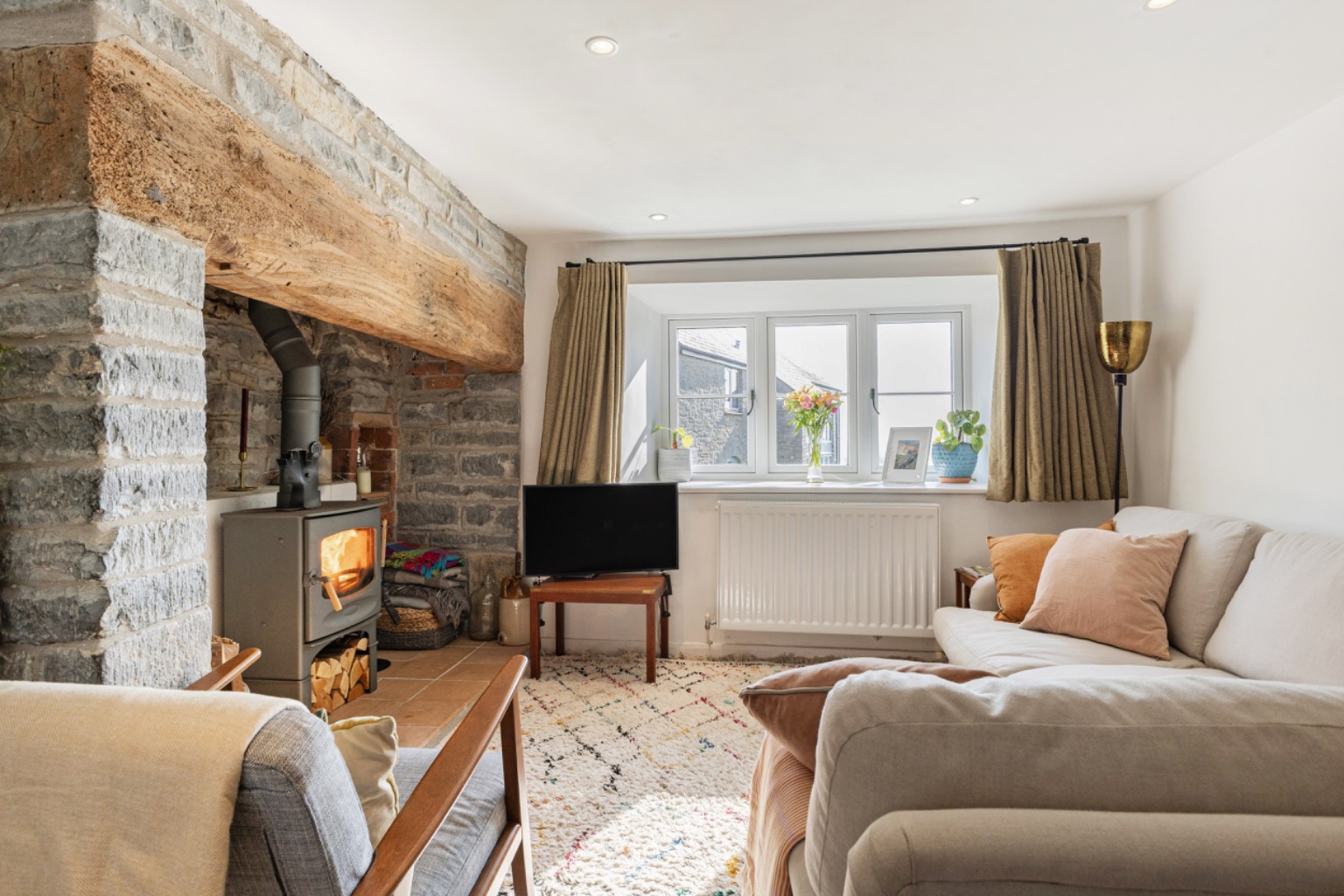 This charming stone cottage retains a wealth of character features including a generous inglenook-style fireplace with beam over and cast-iron wood-burning stove, timber latch doors and exposed natural stone walls, all of which create a warm and inviting atmosphere.