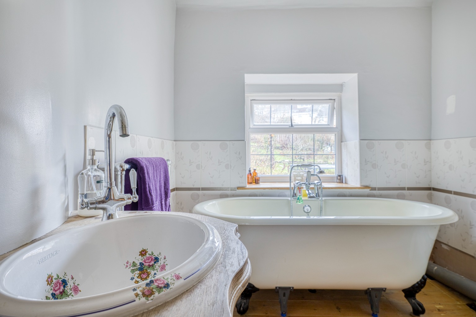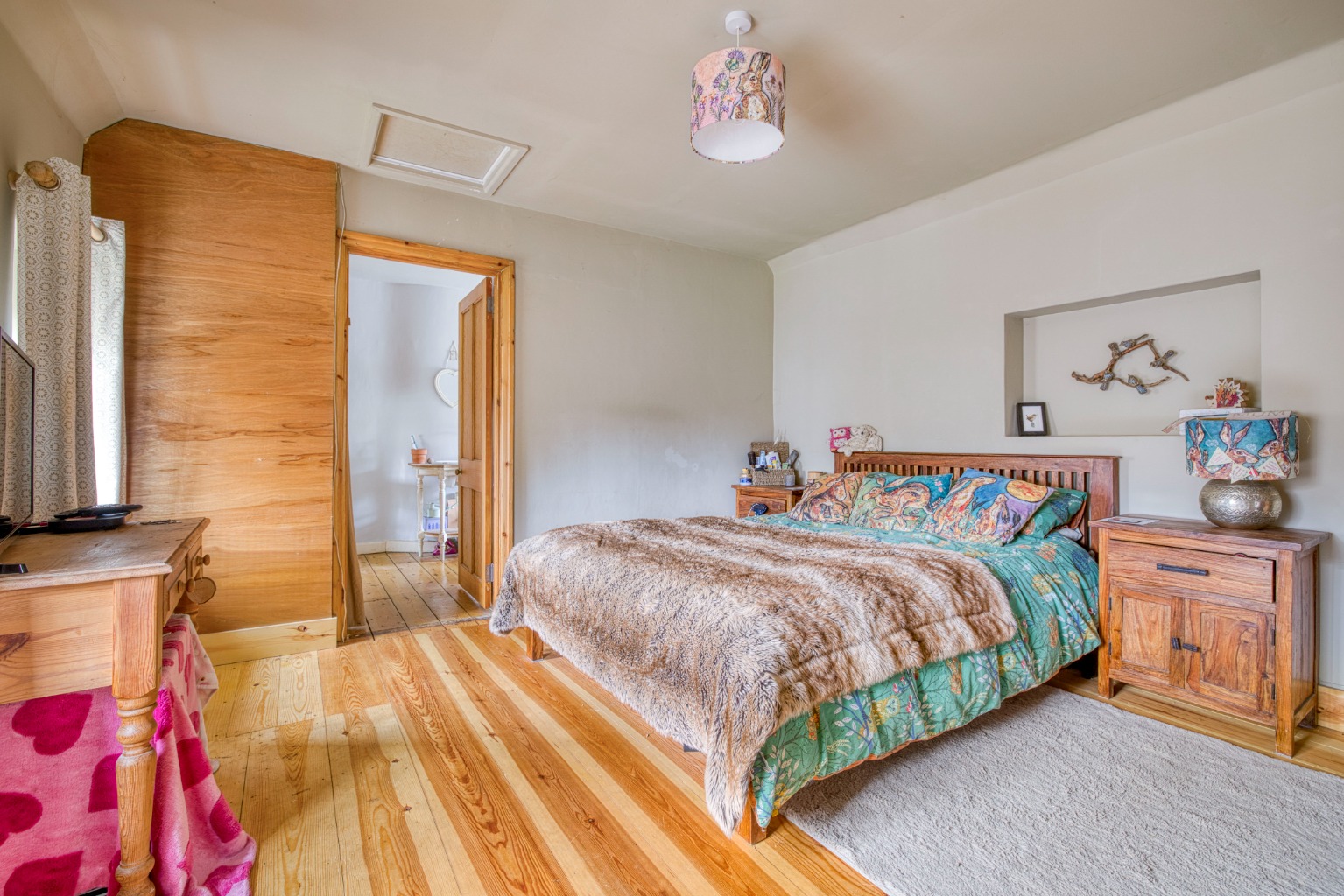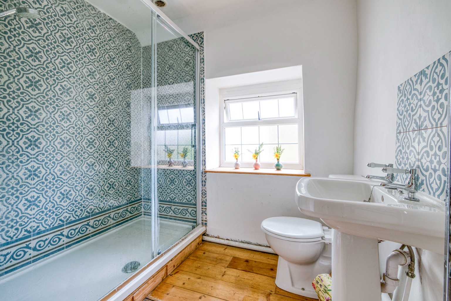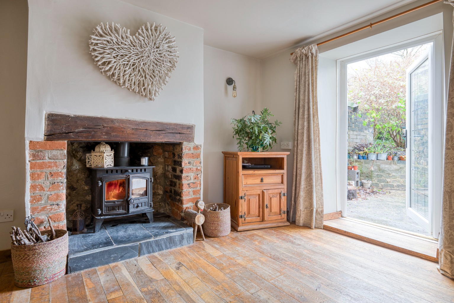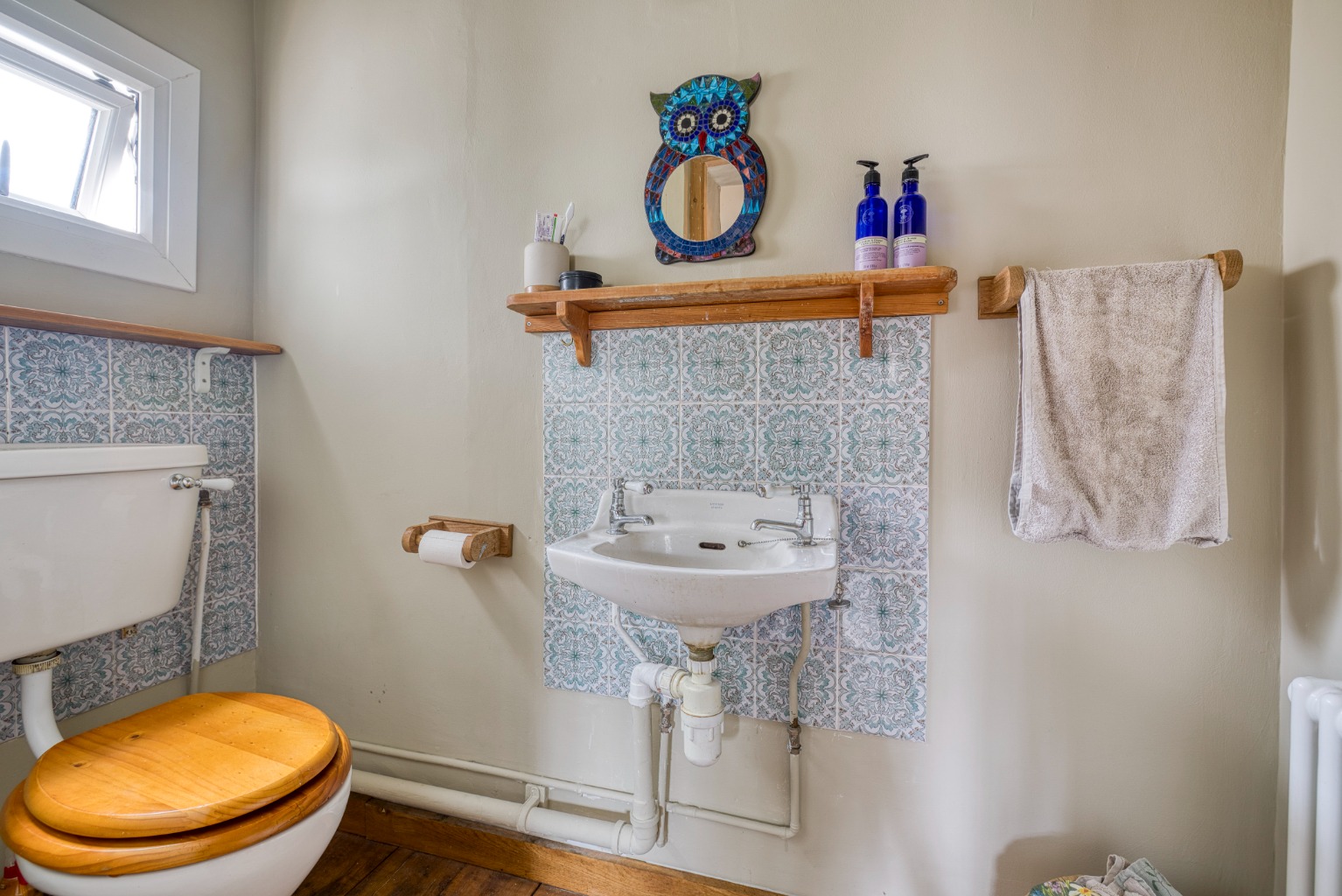 The sitting room is a particularly attractive space, centred around an inglenook fireplace with a brick surround, a wood-burning stove, and a flagstone hearth. There are windows to both front and rear, solid oak flooring, and French doors opening directly onto the rear patio and garden. The owners have also taken great care to uncover the lovely stone wall and repoint it with lime to make a fabulous feature wall. There is also a study with an inglenook and built in pine shelving. A cloakroom completes the ground-floor accommodation.