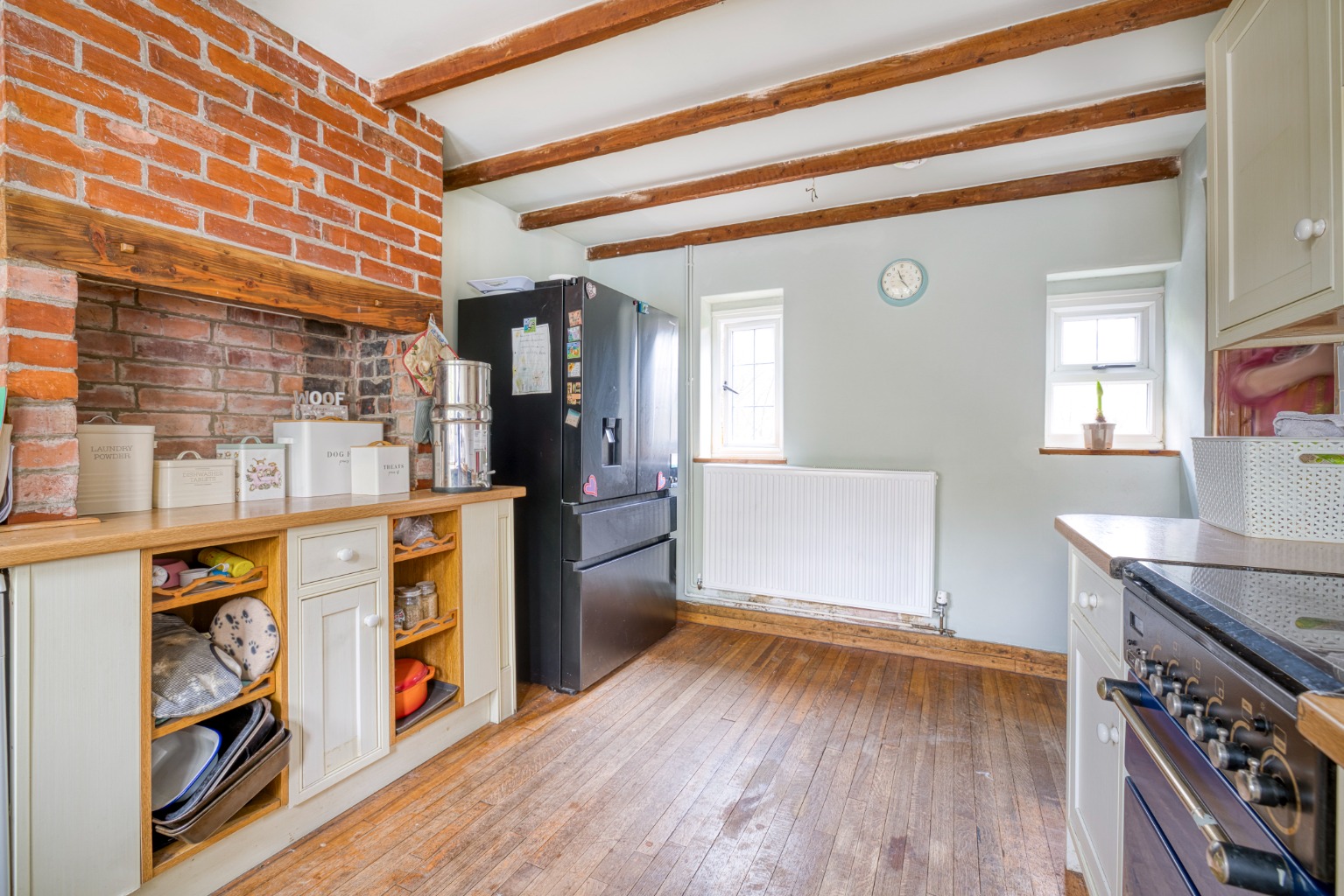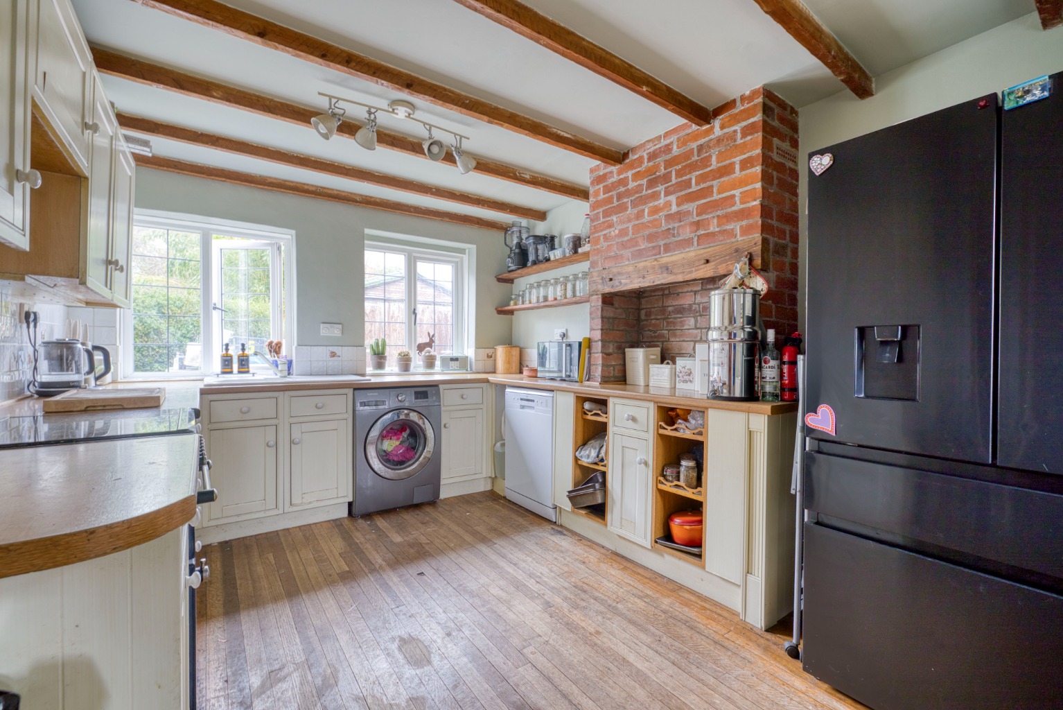 The kitchen/breakfast room is fitted with Shaker-style wall and base units with timber-effect work surfaces, space and services for appliances, exposed ceiling beams and solid oak flooring. Windows to both front and rear provide excellent natural light.