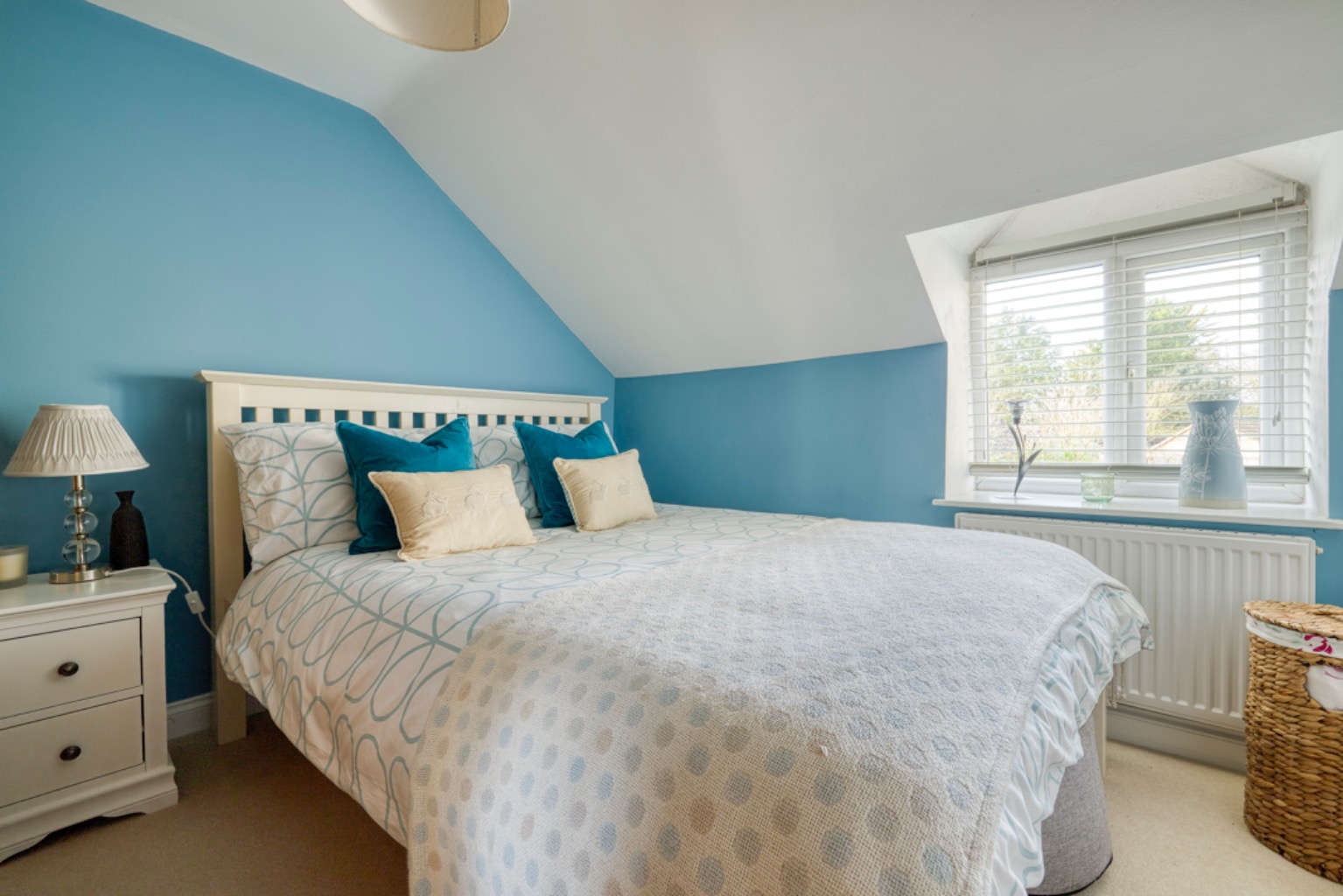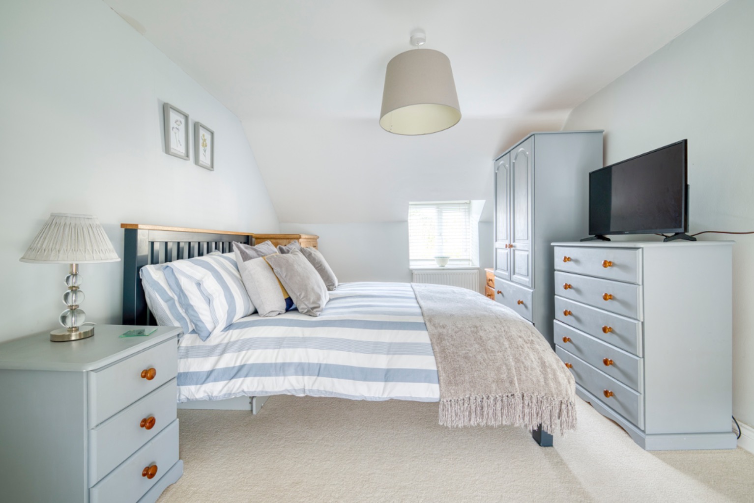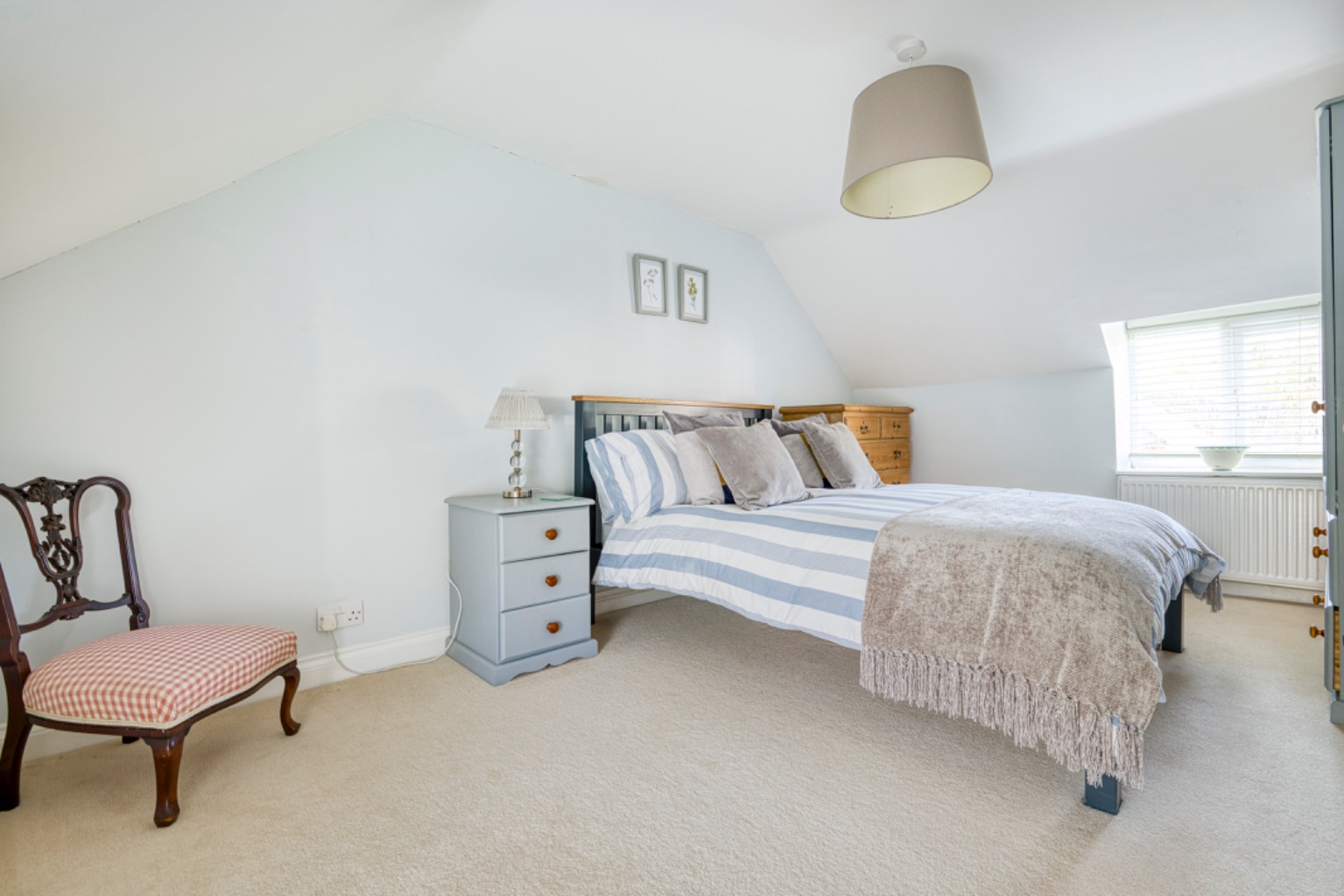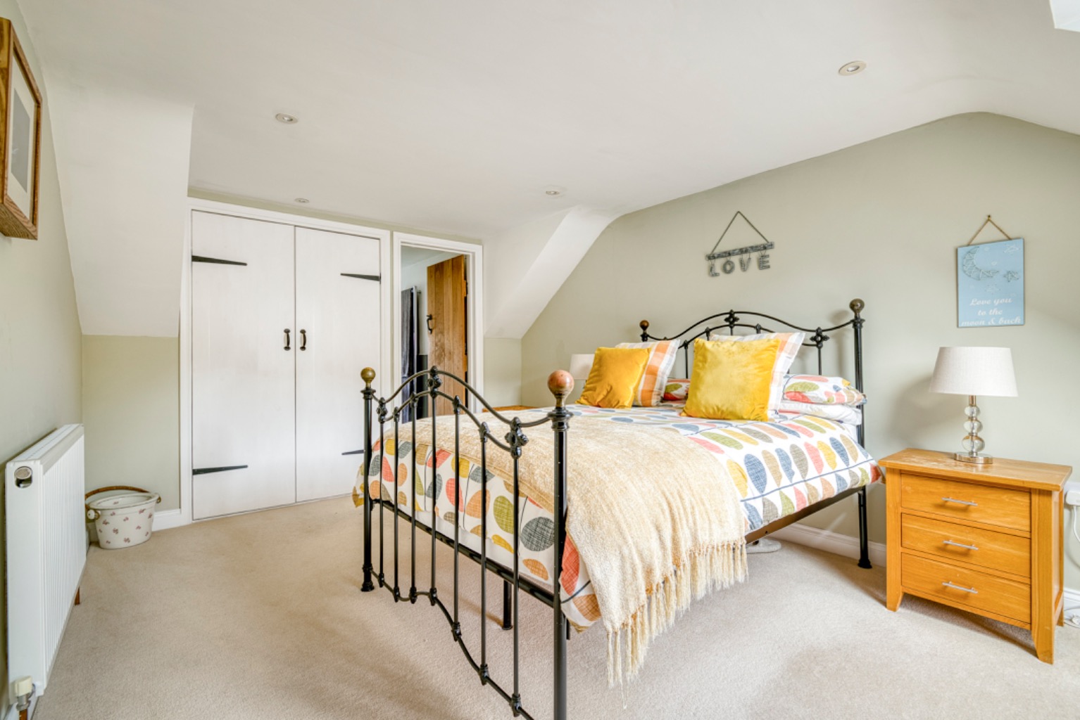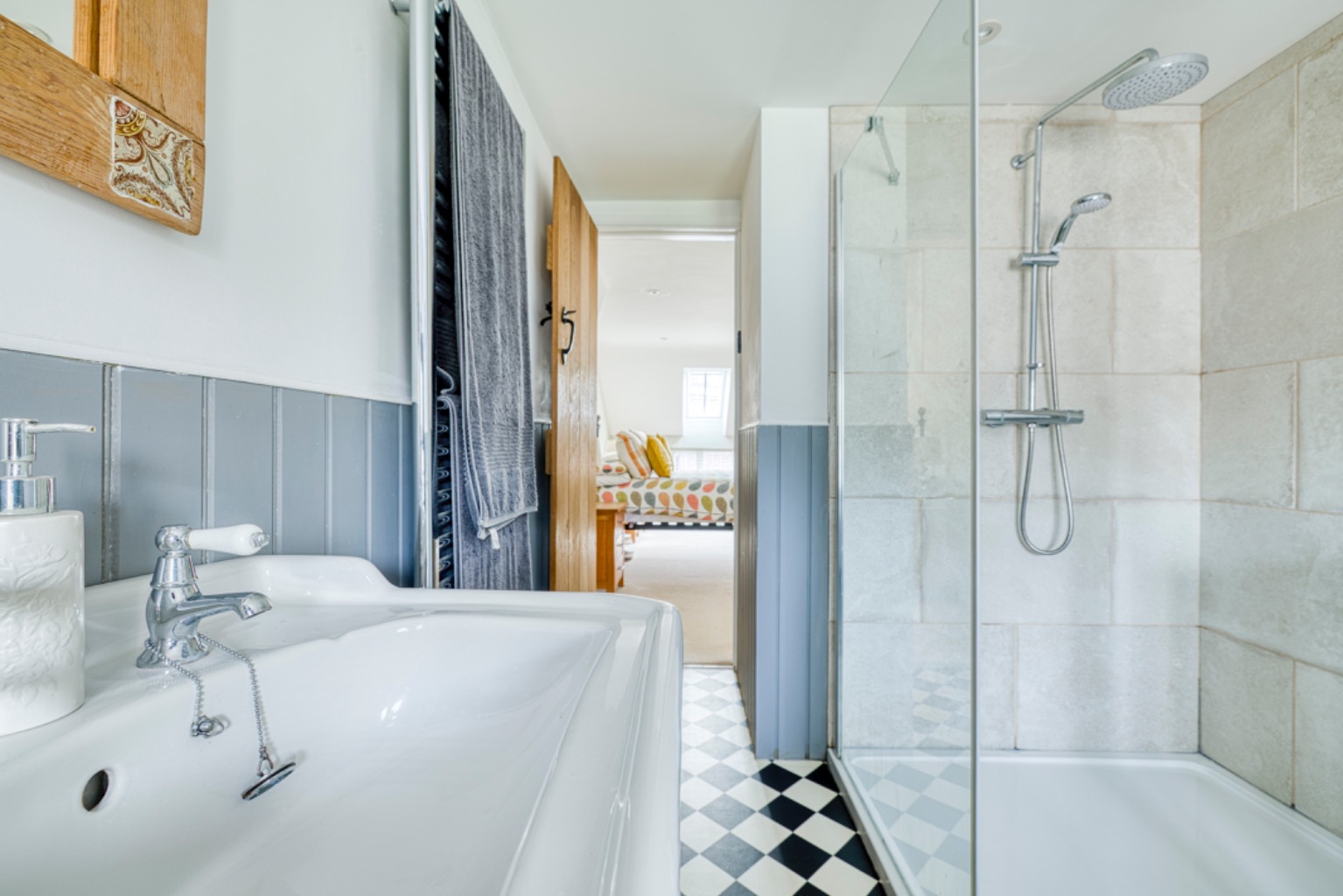 The kitchen is well appointed with shaker-style base and drawer units, solid oak worktops and a double ceramic sink. There is ample space for a large farmhouse table, seating and a sofa, creating a relaxed and sociable atmosphere. Appliances include a Rangemaster cooker, as well as space for a dishwasher and an American-style fridge/freezer. French doors open onto the terrace, seamlessly extending the living space outdoors.