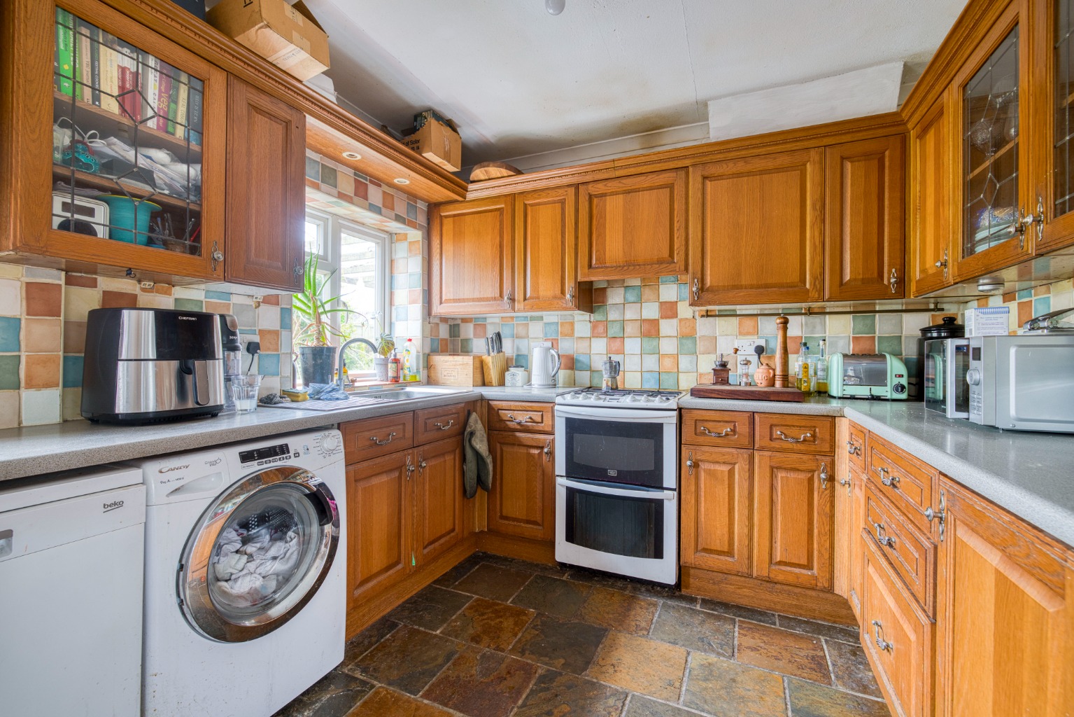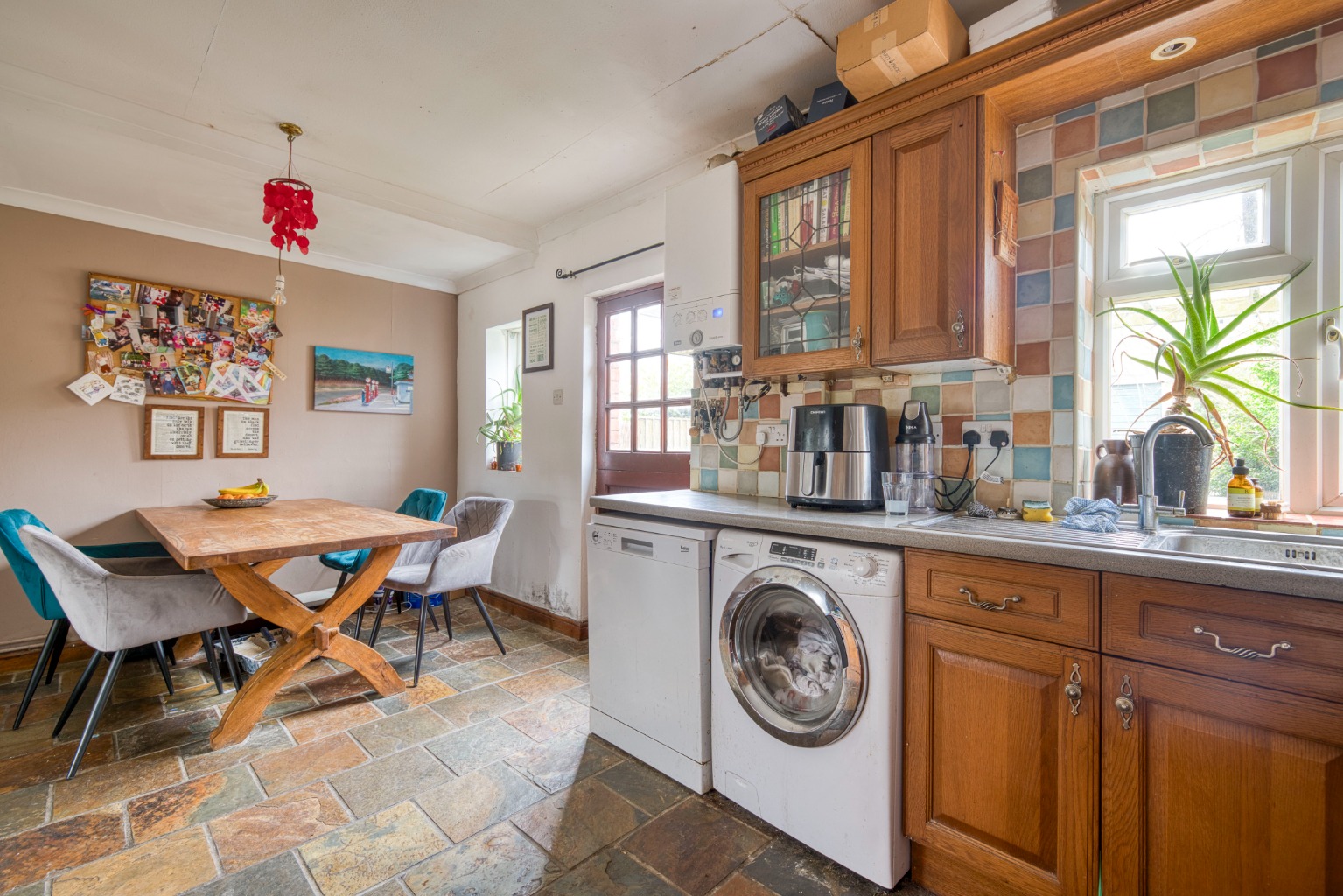 The kitchen-dining room has a stable-style door opening to a rear courtyard, and a stone-tiled floor. There is ample room for a dining table, and the kitchen itself features a range of units, with a free-standing electric cooker. There is room and plumbing within the units for a dishwasher and a washing machine. A brand new boiler has just been installed in the kitchen, too.