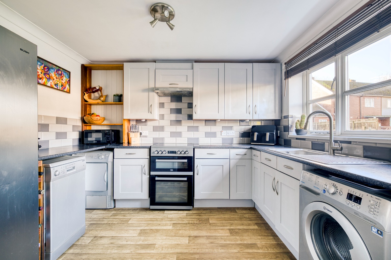 The accommodation is well laid out, with light-filled living spaces flowing naturally from one to another, creating a practical and sociable home suited to modern living. Entering the house, there is a central hallway, with a sitting room directly ahead and a kitchen on the right-hand side. Within the kitchen, there are plenty of units, space and plumbing for both a dishwasher and washing machine, as well as a freestanding electric oven with a hob above which is included in the sale. The kitchen has granite-effect worktops and tiled splashbacks.