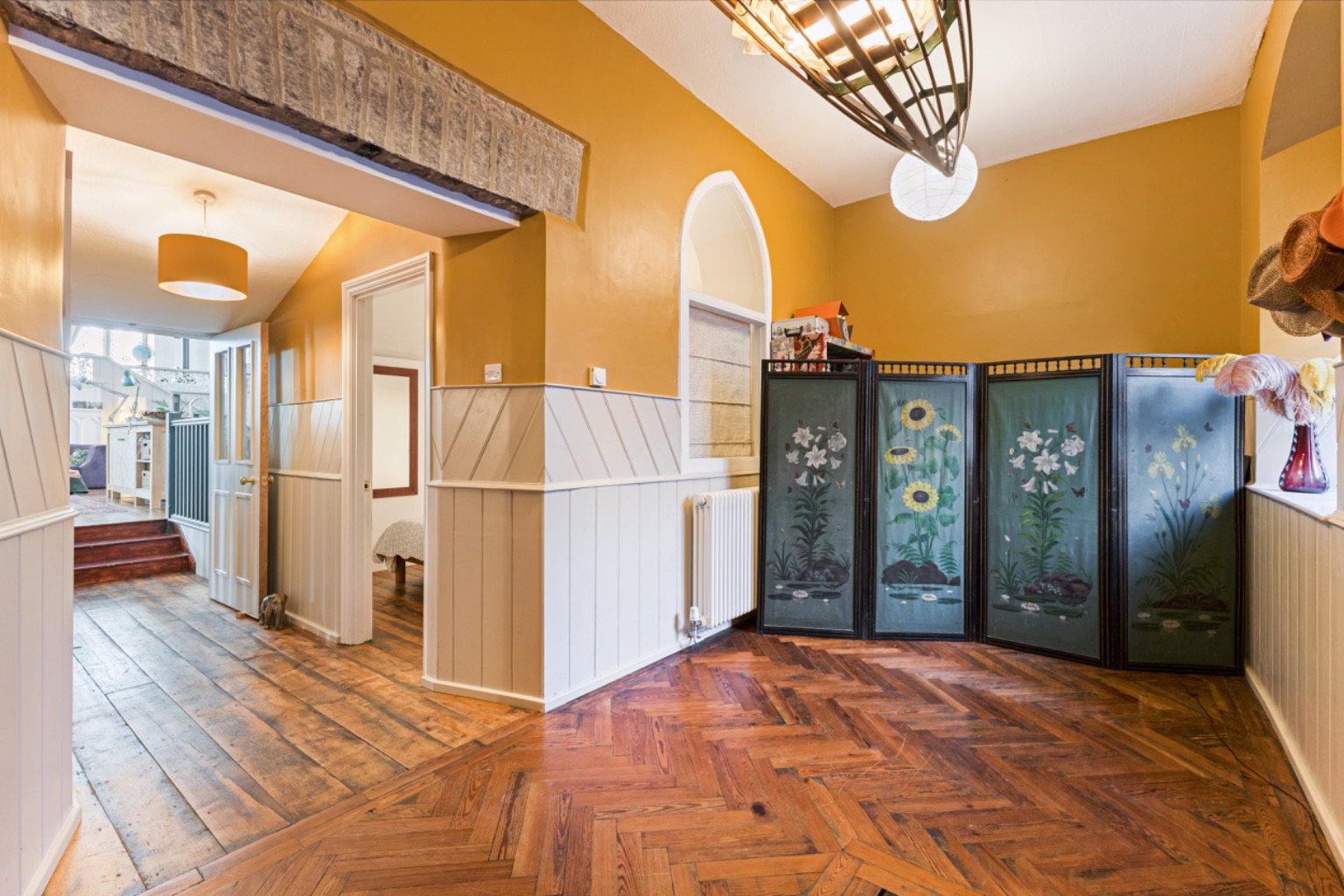 Original ecclesiastical features—arched stained-glass windows, exposed stonework and an impressive, vaulted interior