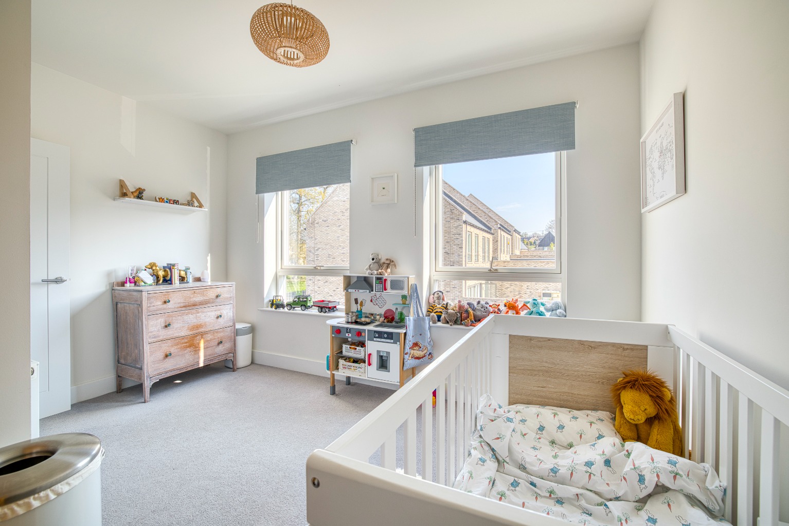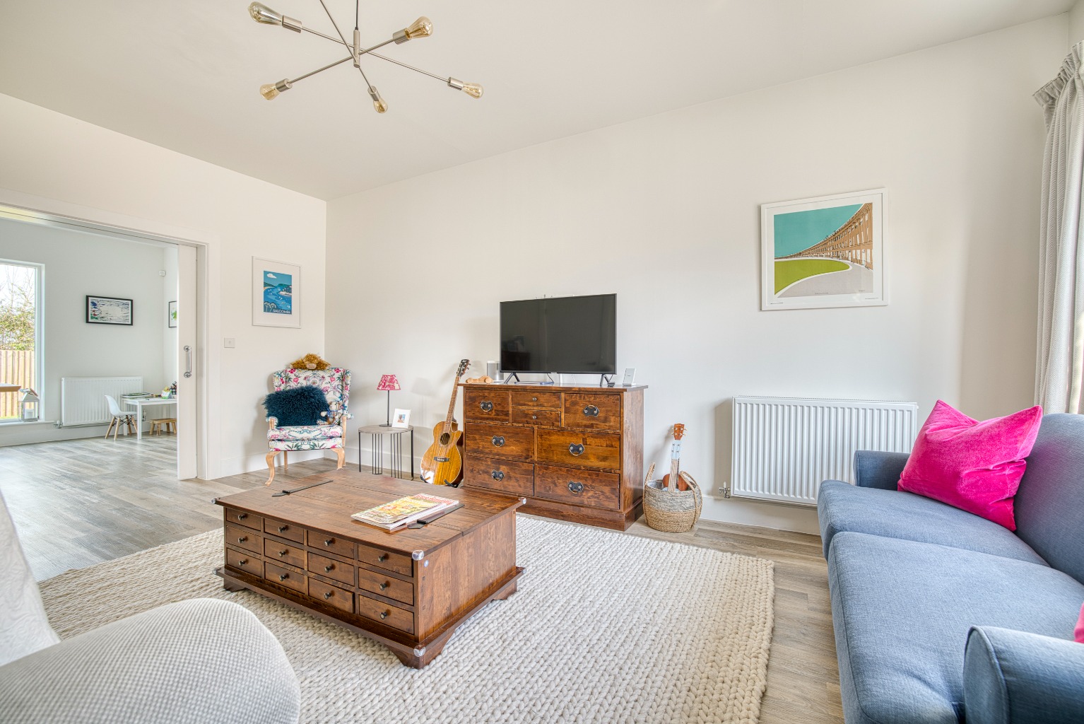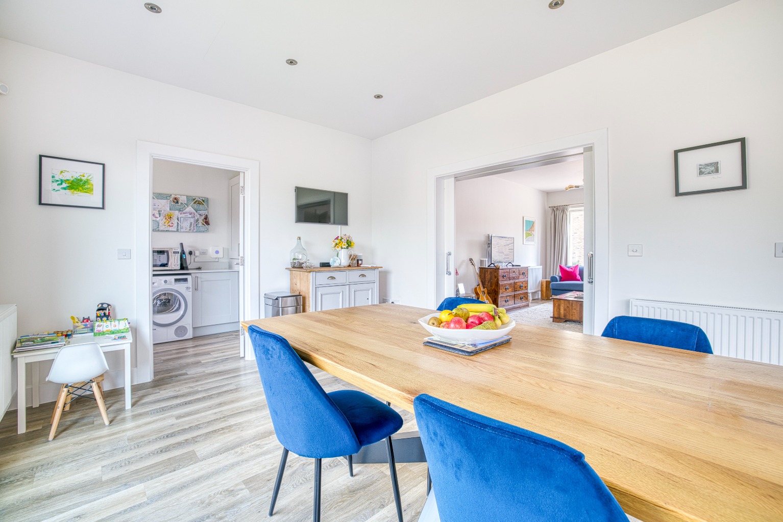 There are two versatile reception rooms, currently arranged as a sitting room and a playroom. The sitting room has a large front-facing window, and internal double doors which open into the kitchen dining room.
