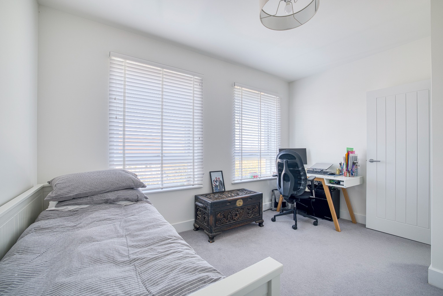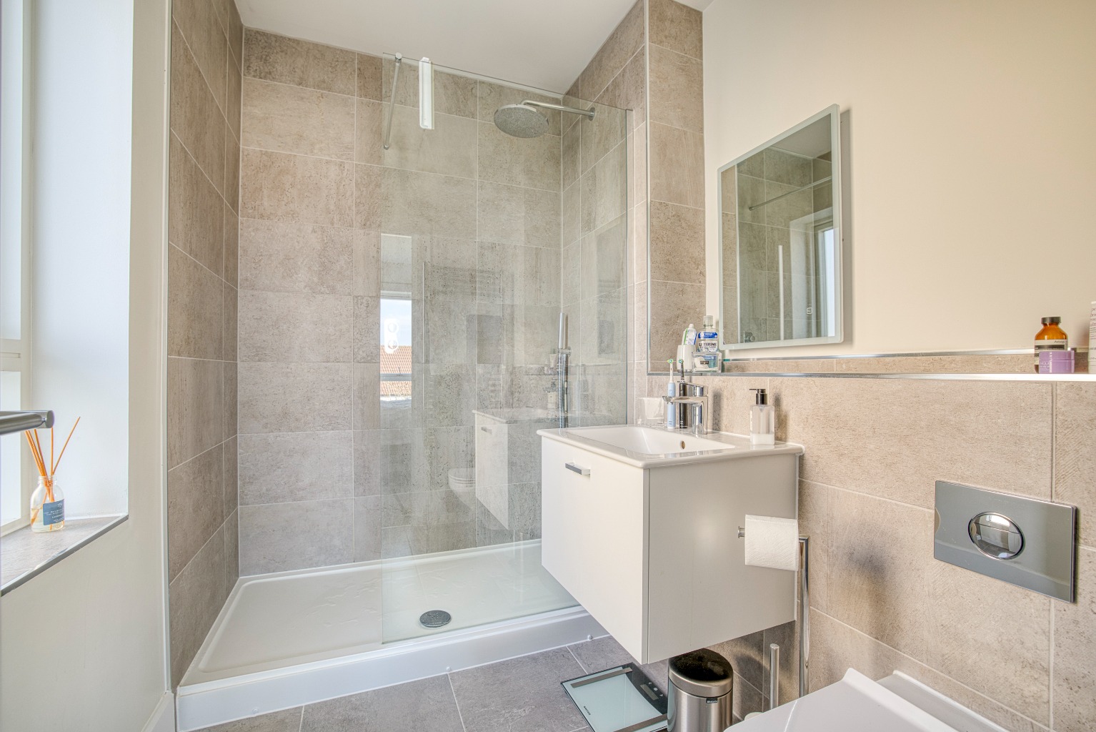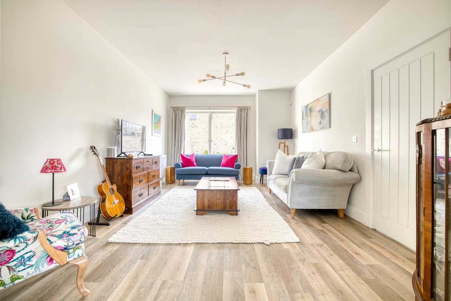 There are two versatile reception rooms, currently arranged as a sitting room and a playroom. The sitting room has a large front-facing window, and internal double doors which open into the kitchen dining room.
