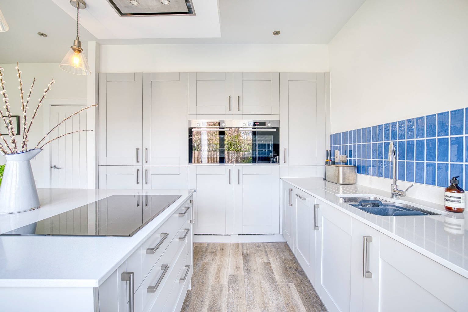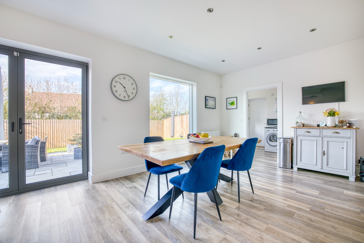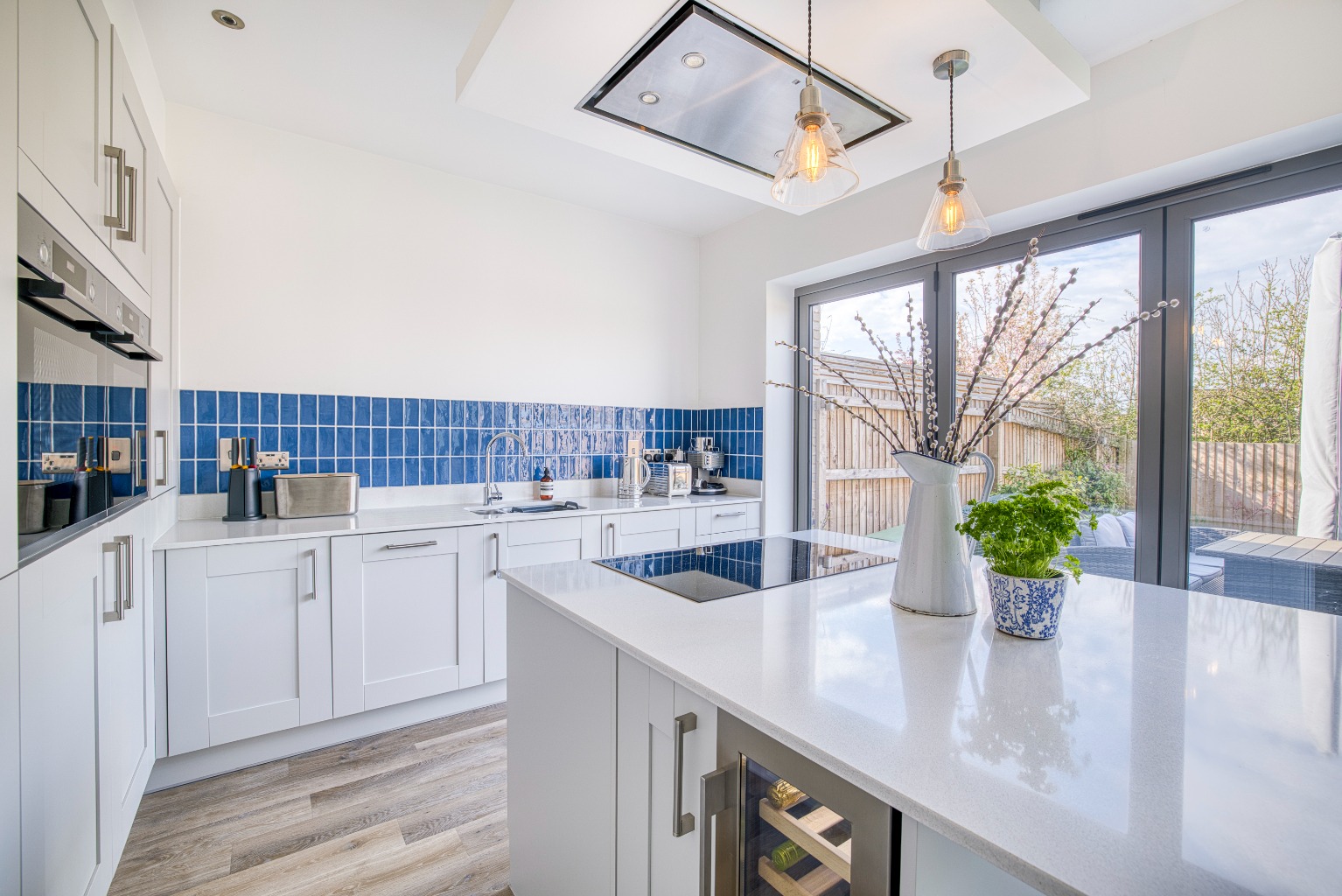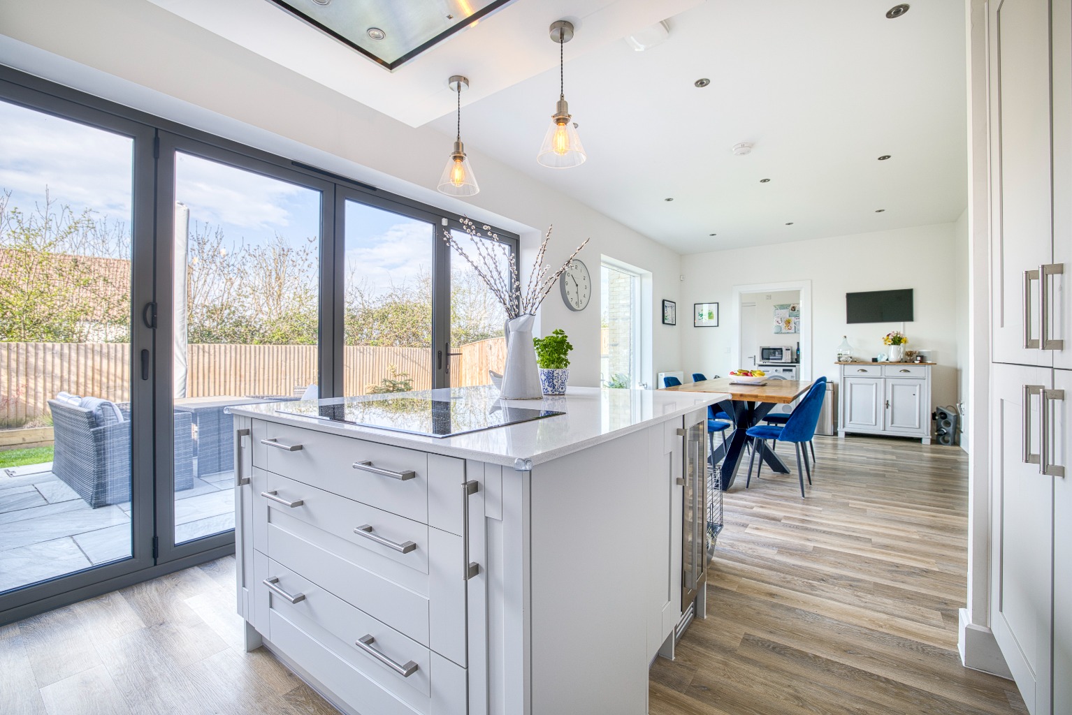 The kitchen/diner, is a spacious and contemporary area fitted with an array of modern units, a central island with an induction hob, and high-end integrated appliances including a double fridge-freezer, a wine cooler, two eye-level ovens, and a dishwasher. Bi-folding doors open onto the rear garden, flooding the space with natural light and providing seamless indoor-outdoor living.