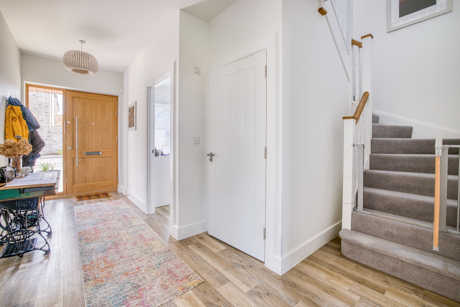 Upon entering, a bright and airy reception hall welcomes you, with stairs rising to the first floor, a cloakroom, and access to the principal ground-floor accommodation.
