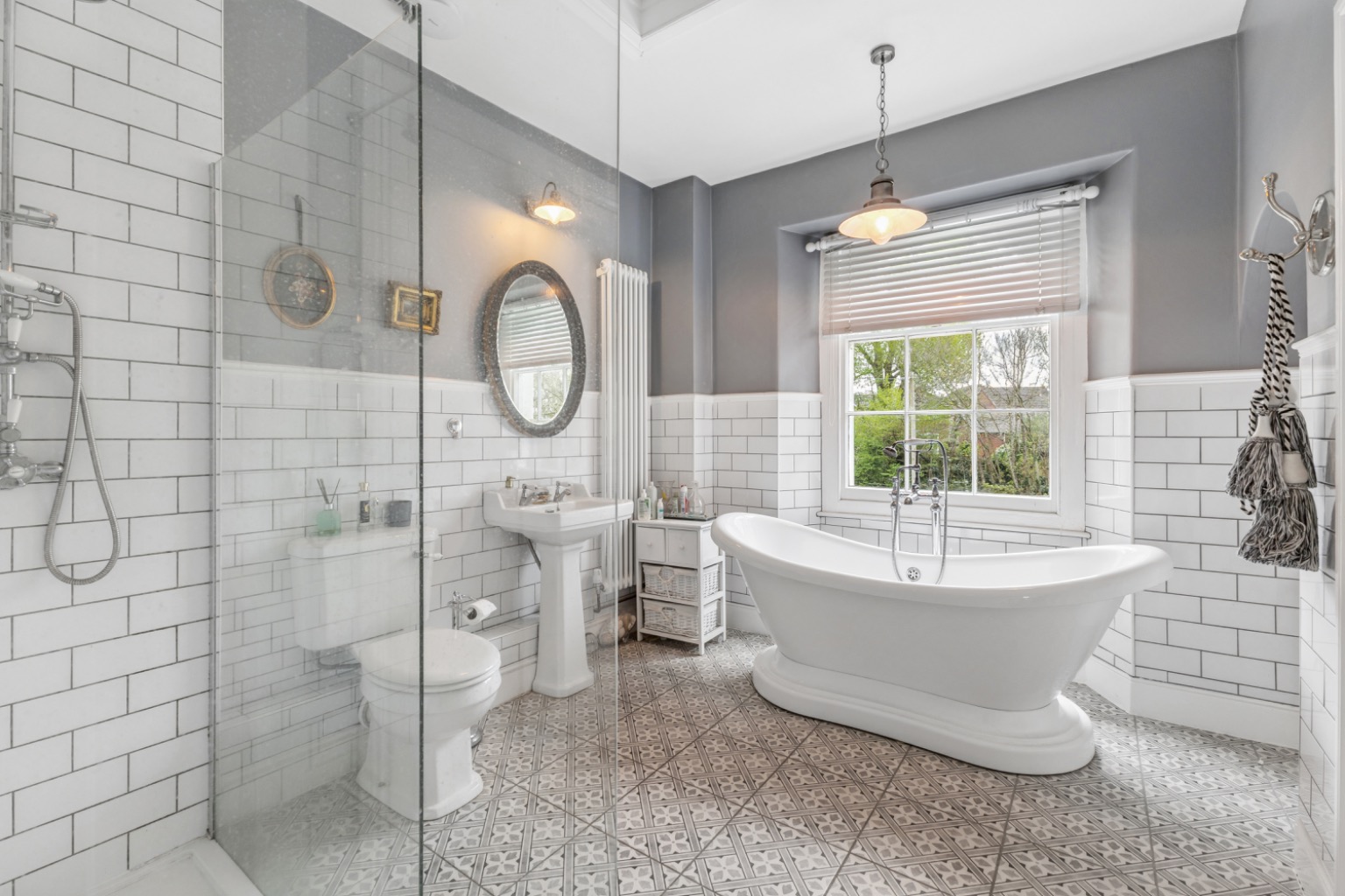 The accommodation retains a wealth of original features, including stained glass, sash windows, ornate plasterwork and impressive Corinthian columns within the principal reception room. The ground floor provides a spacious reception hall, four reception rooms, a well-appointed kitchen/breakfast room, utility room, cloakroom and shower room.