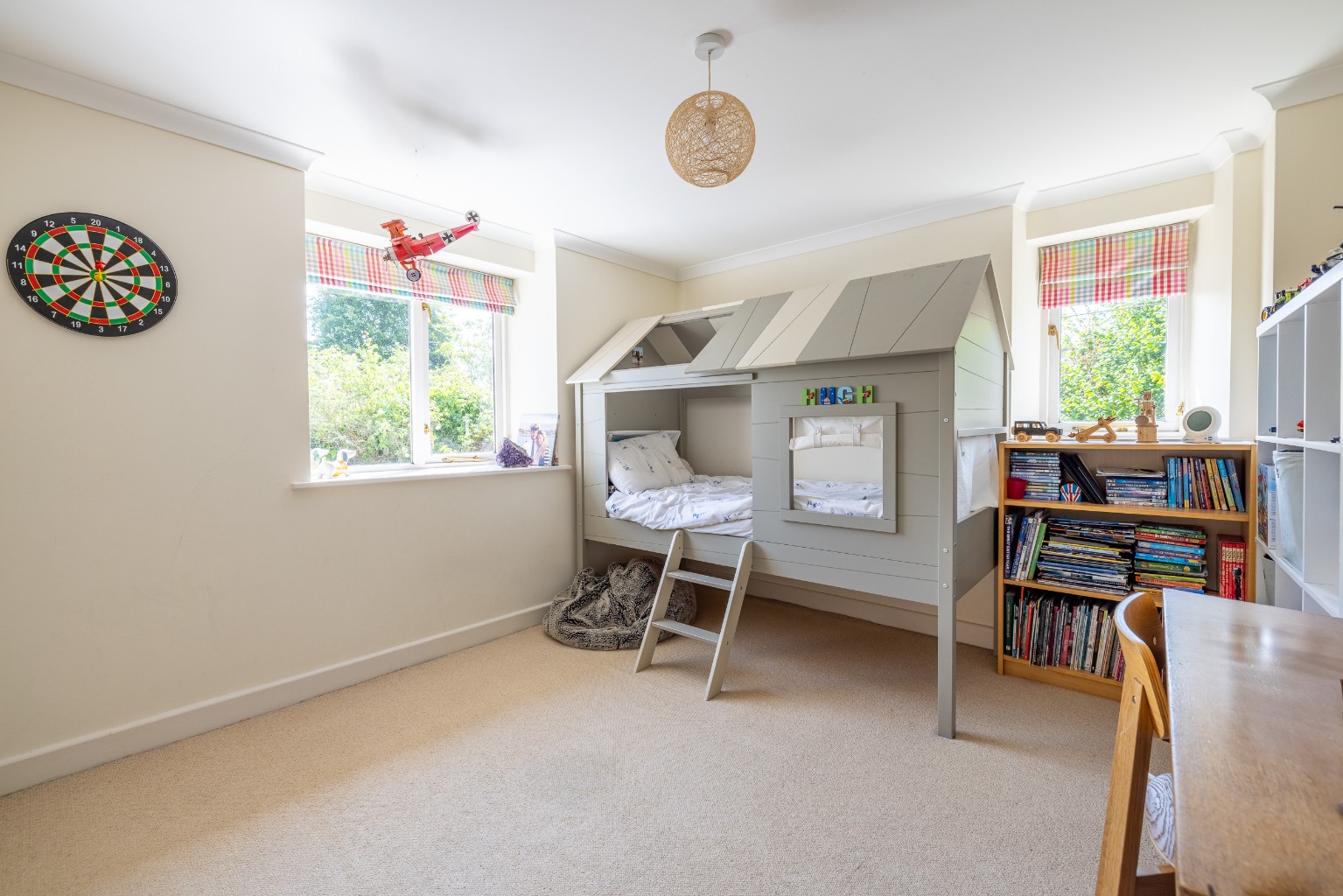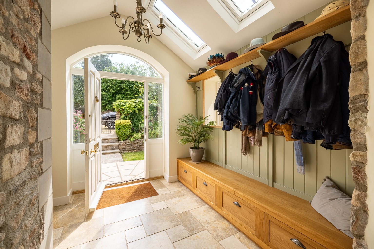 The front door opens to a bright and cheery entrance hall with quality polished limestone floor, a bespoke well-crafted oak bench with storage, the staircase and a cloakroom.