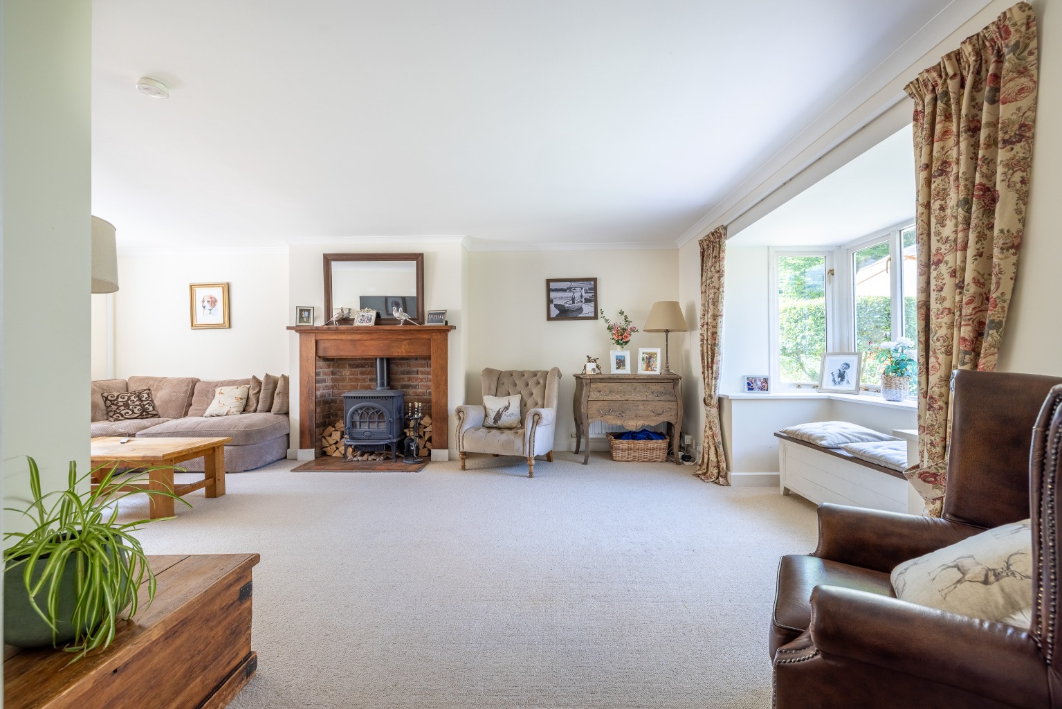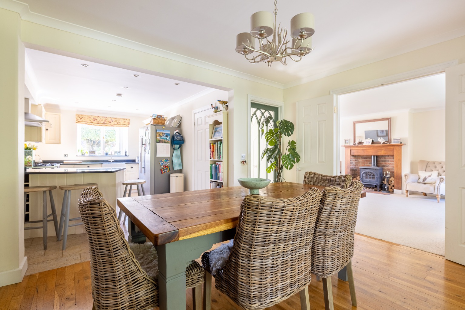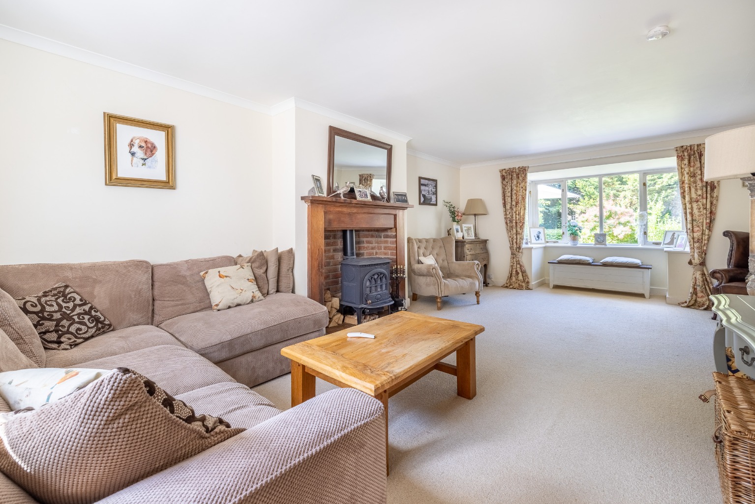 The spacious sitting room has an attractive fireplace with a wood burning stove, a large bay window looking into the garden and double doors into the dining room with solid oak flooring.