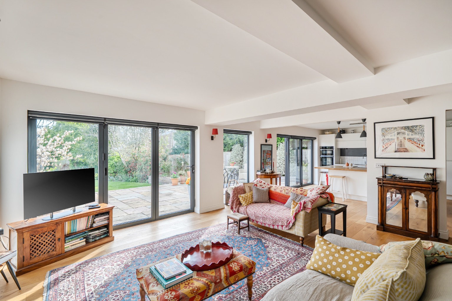 The generous accommodation is thoughtfully arranged, from the entrance hall the fabulous open plan living spaces which incorporate the kitchen, dining and sitting room with two sets of bifold doors all fitted with electric blinds as well as a useful additional study area – an impressive and sociable heart to the house. In addition, there is a further reception room offering a more formal sitting room to the front of the house. There is a downstairs cloakroom with loo and shower, a well planned utility room with a door to the outside and a generous larder cupboard.