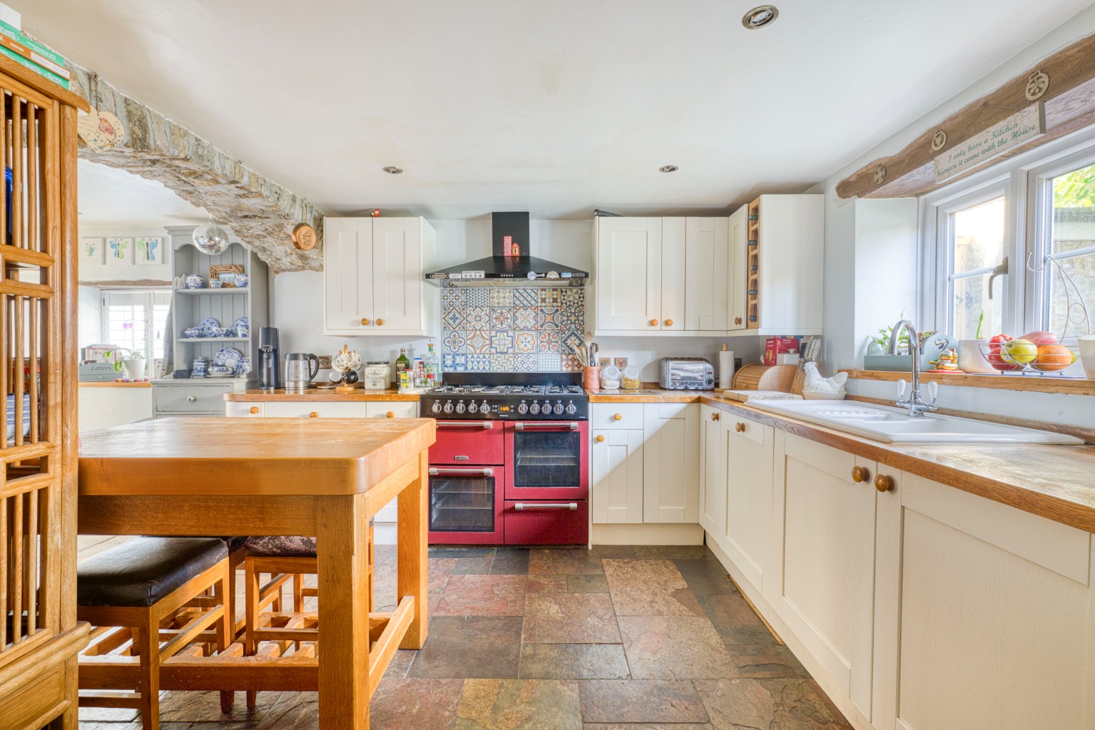 The dining room flows easily into the kitchen adjacent, which has room for a breakfast table, making it another sociable family-oriented space. There are a number of features, including a stone archway, a stable-style door into the garden, and stone floor tiles which continue in from the dining room. The kitchen itself has a good range of fitted units with oak worktops and a gas-fired range cooker. Adjacent to the kitchen, there is a utility room with a butler's sink, a toilet and plumbing for white goods.