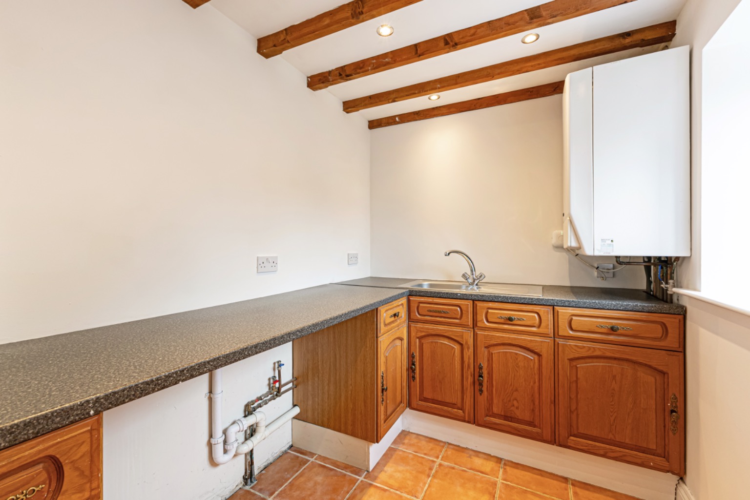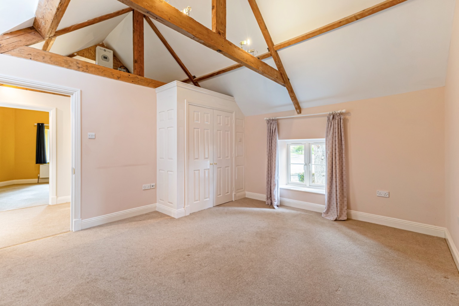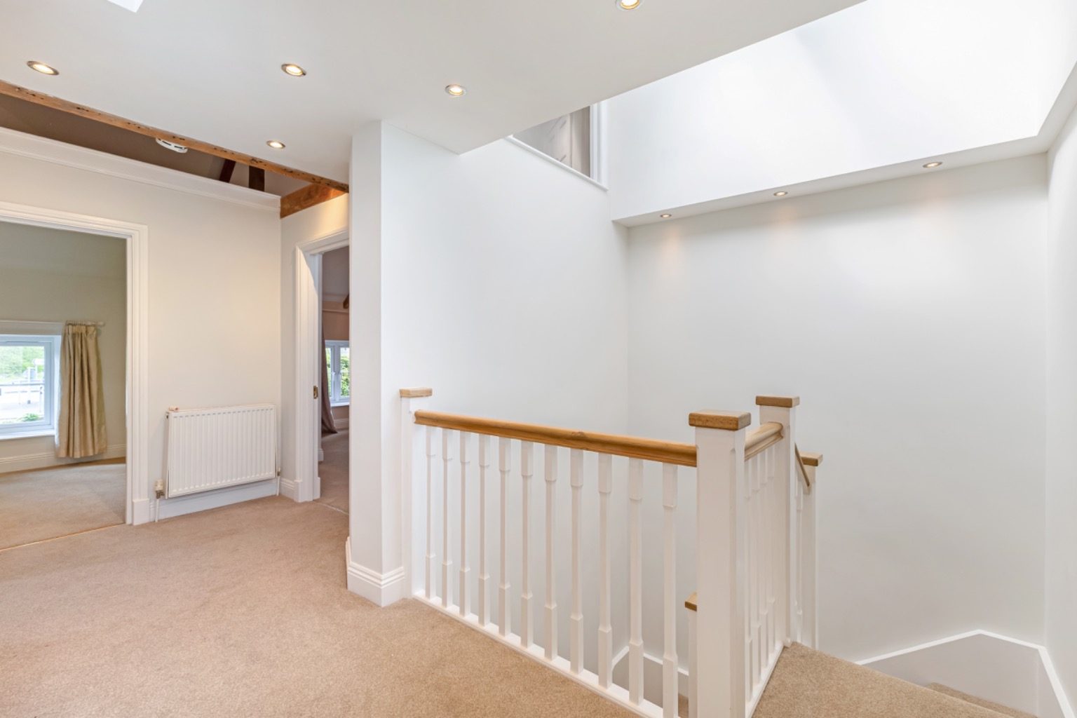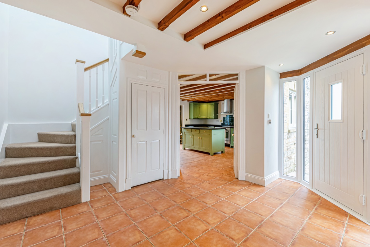 Entering via a solid wooden door which opens into a spacious reception hall with tiled flooring, there are exposed ceiling timbers and a staircase rising to the first floor, with useful under-stairs storage.