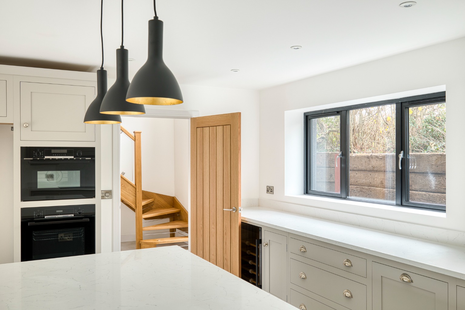 Bespoke kitchen with quartz worktops, central island and high-quality appliances.