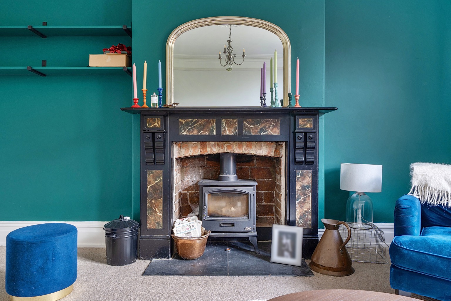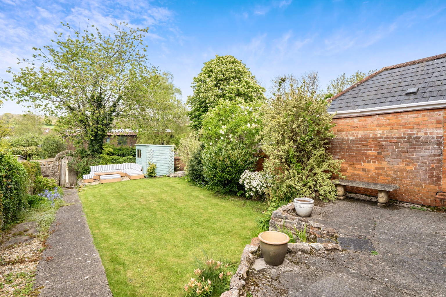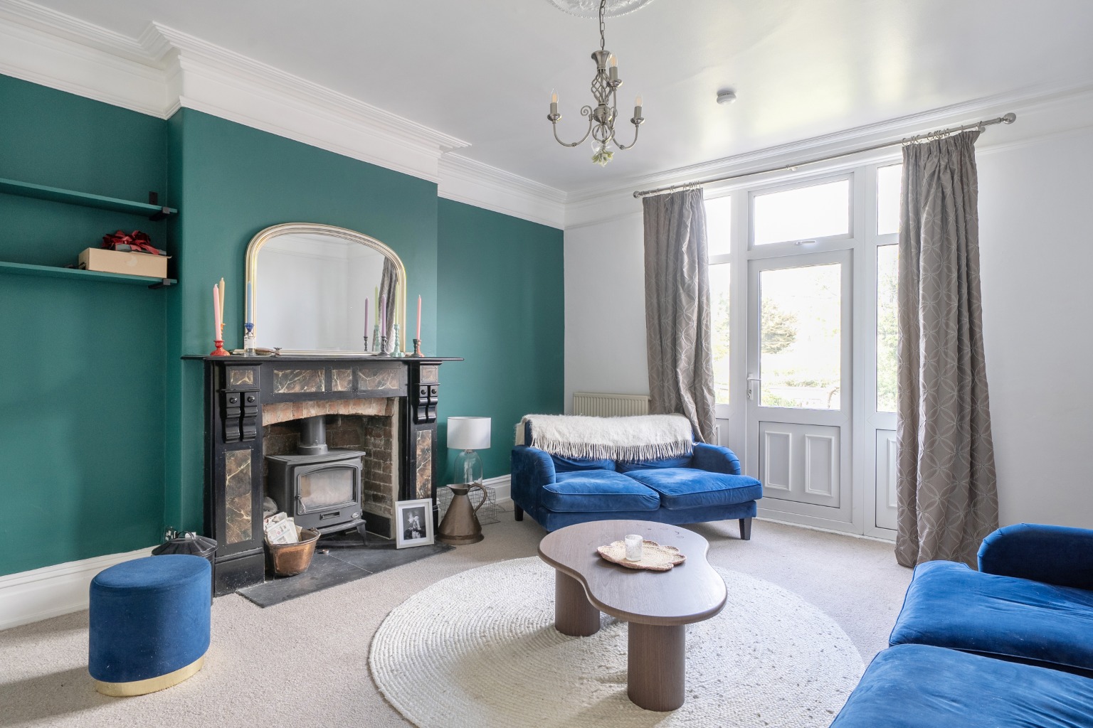 To the rear of the house, the sitting room overlooks the pretty walled garden and features a fireplace with a multi-fuel stove, creating a comfortable and relaxed living space.