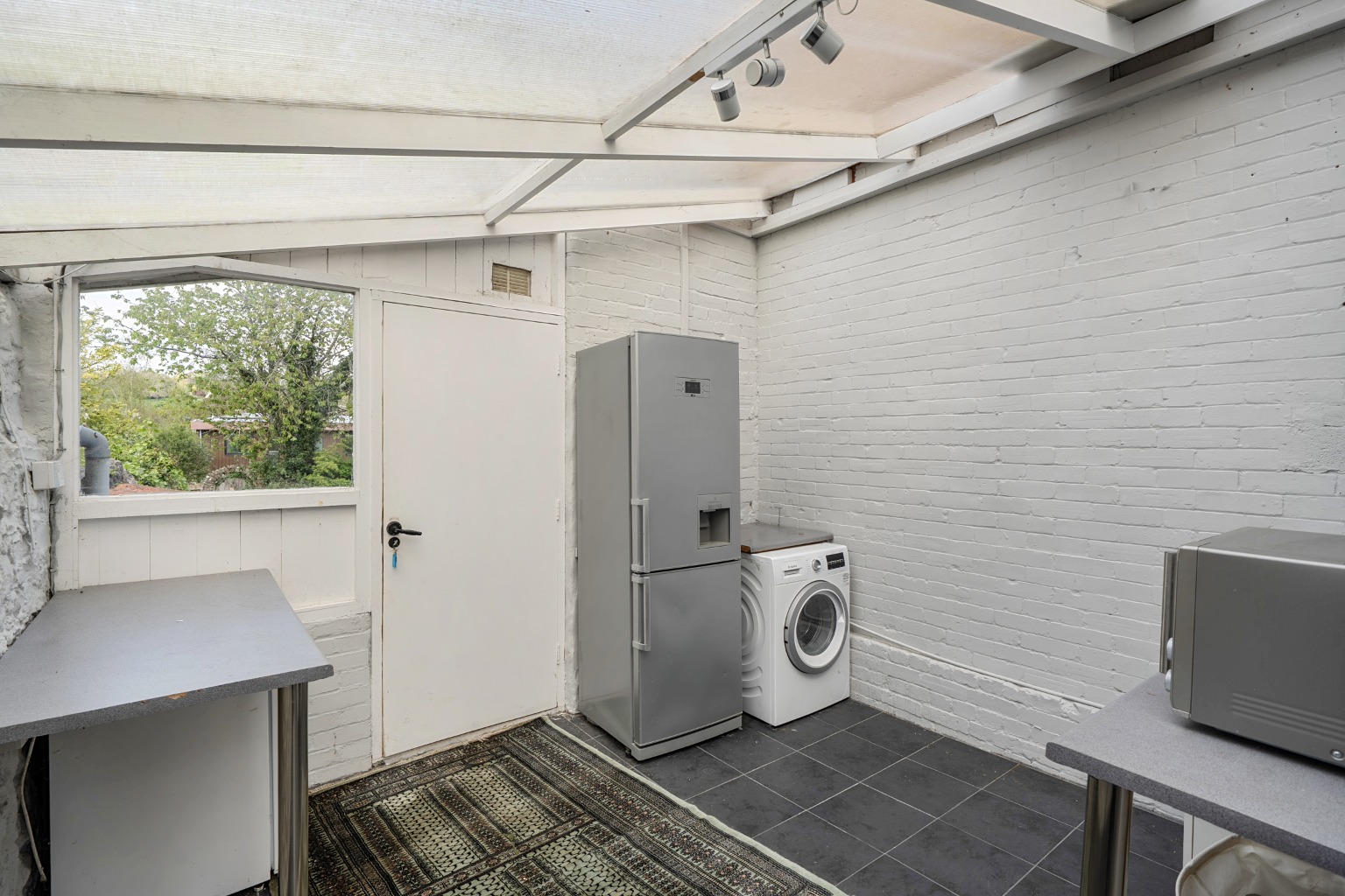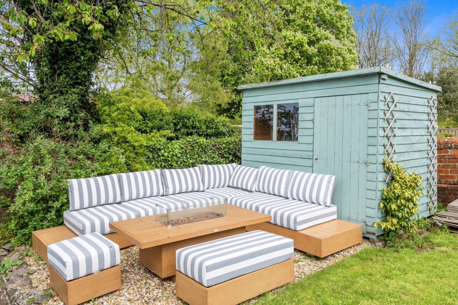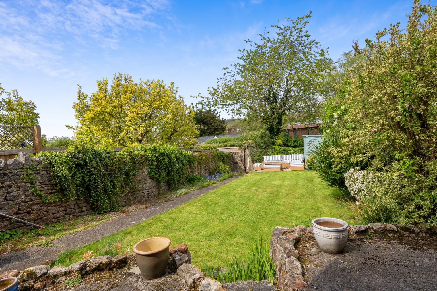 To the rear of the house, the sitting room overlooks the pretty walled garden and features a fireplace with a multi-fuel stove, creating a comfortable and relaxed living space.