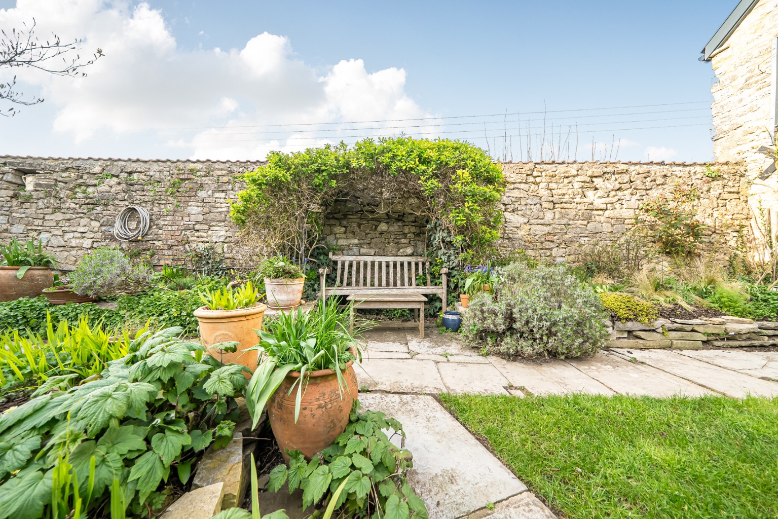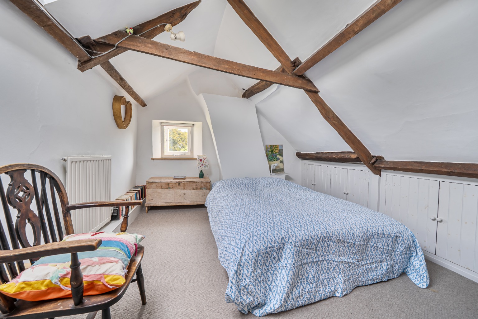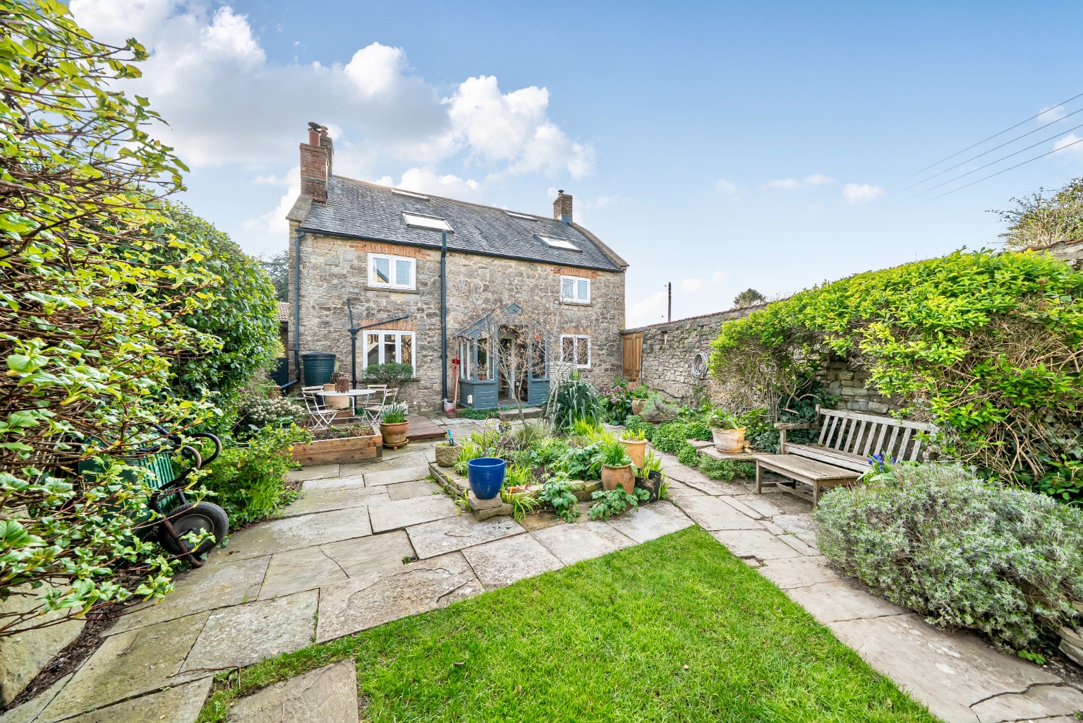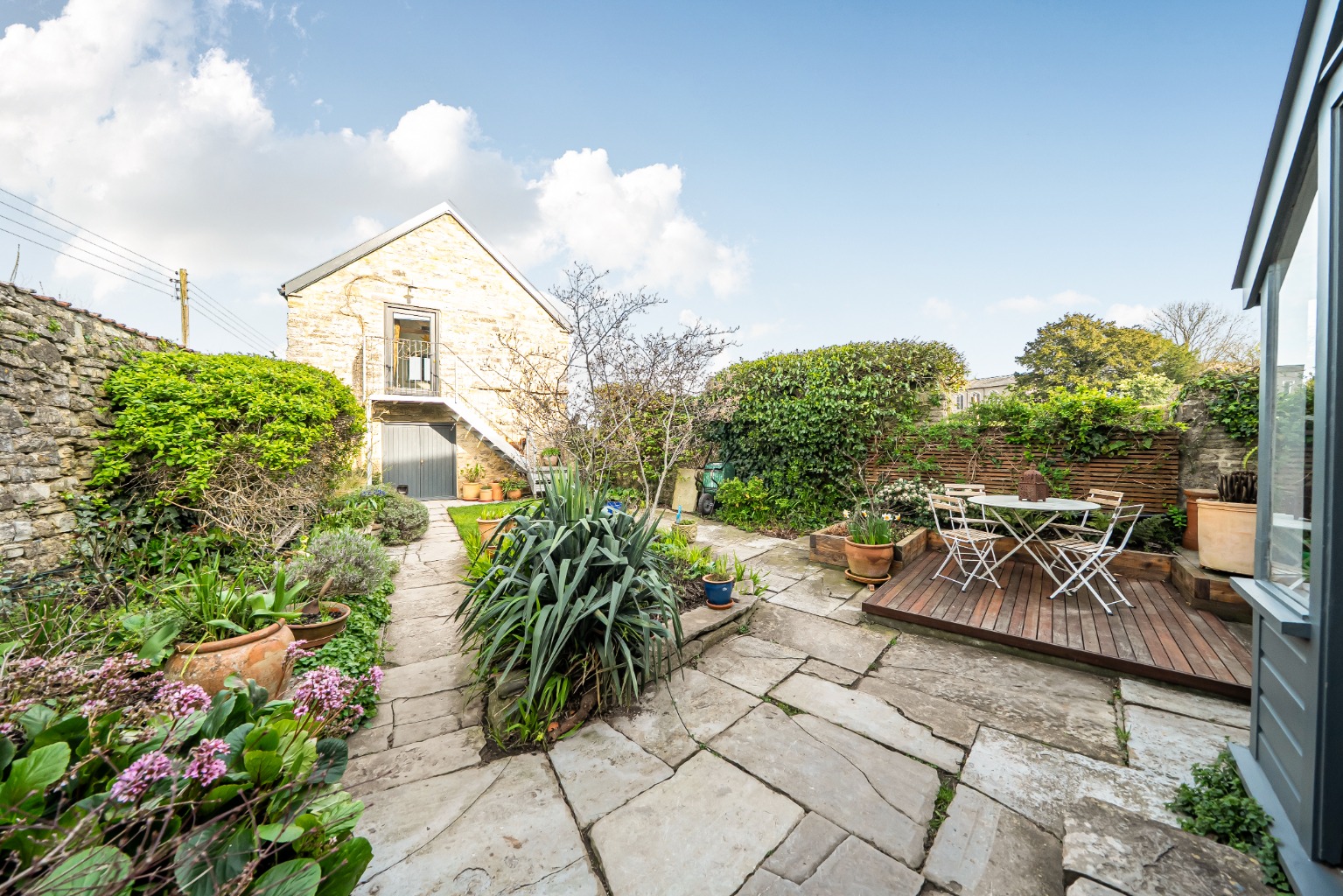 Outside at the front there’s a garage and compact front garden. At the rear, an enclosed, very private walled garden with fabulous variety and appeal. At the end of the garden there’s a renovated barn with three storage rooms below and a studio, with vaulted ceiling above and additional parking beyond the barn.