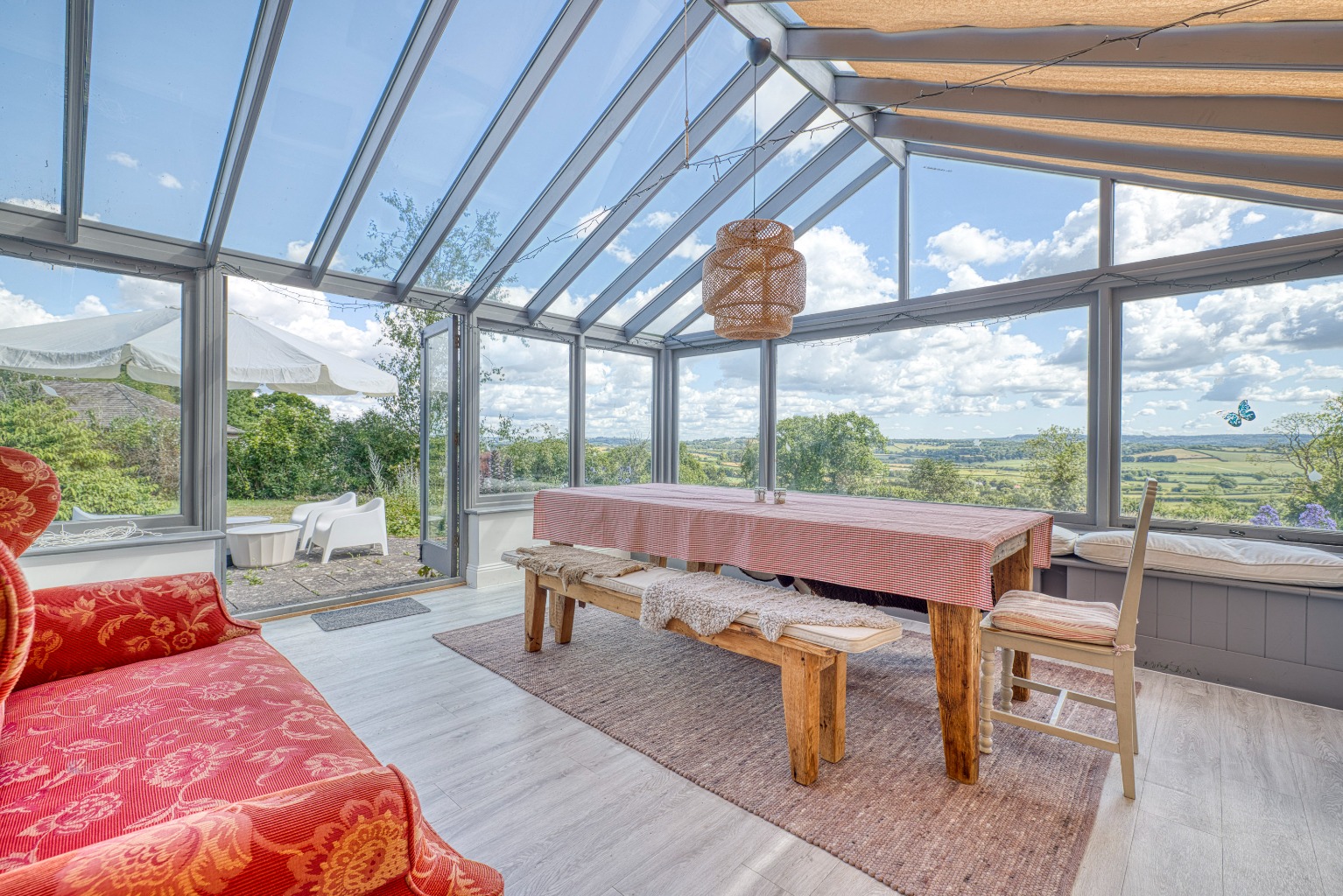From the parking area, a useful boot room with adjoining cloakroom and utility leads through to the newly fitted kitchen and breakfast room, centred around an AGA and opening into a bright conservatory-style dining room with panoramic garden views.