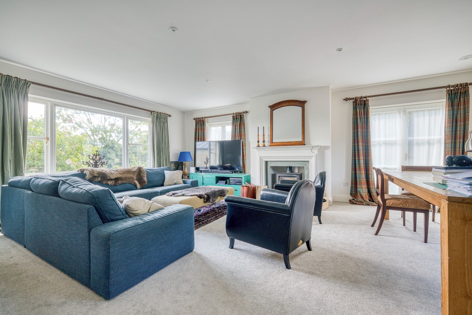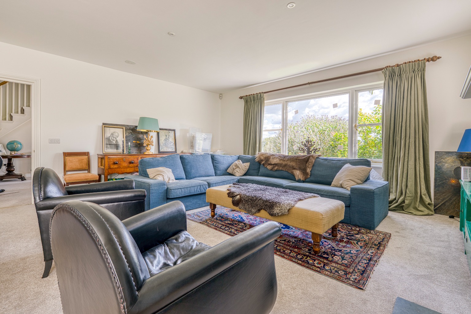The triple-aspect sitting room features a wood-burning stove and French doors out to the garden terrace.