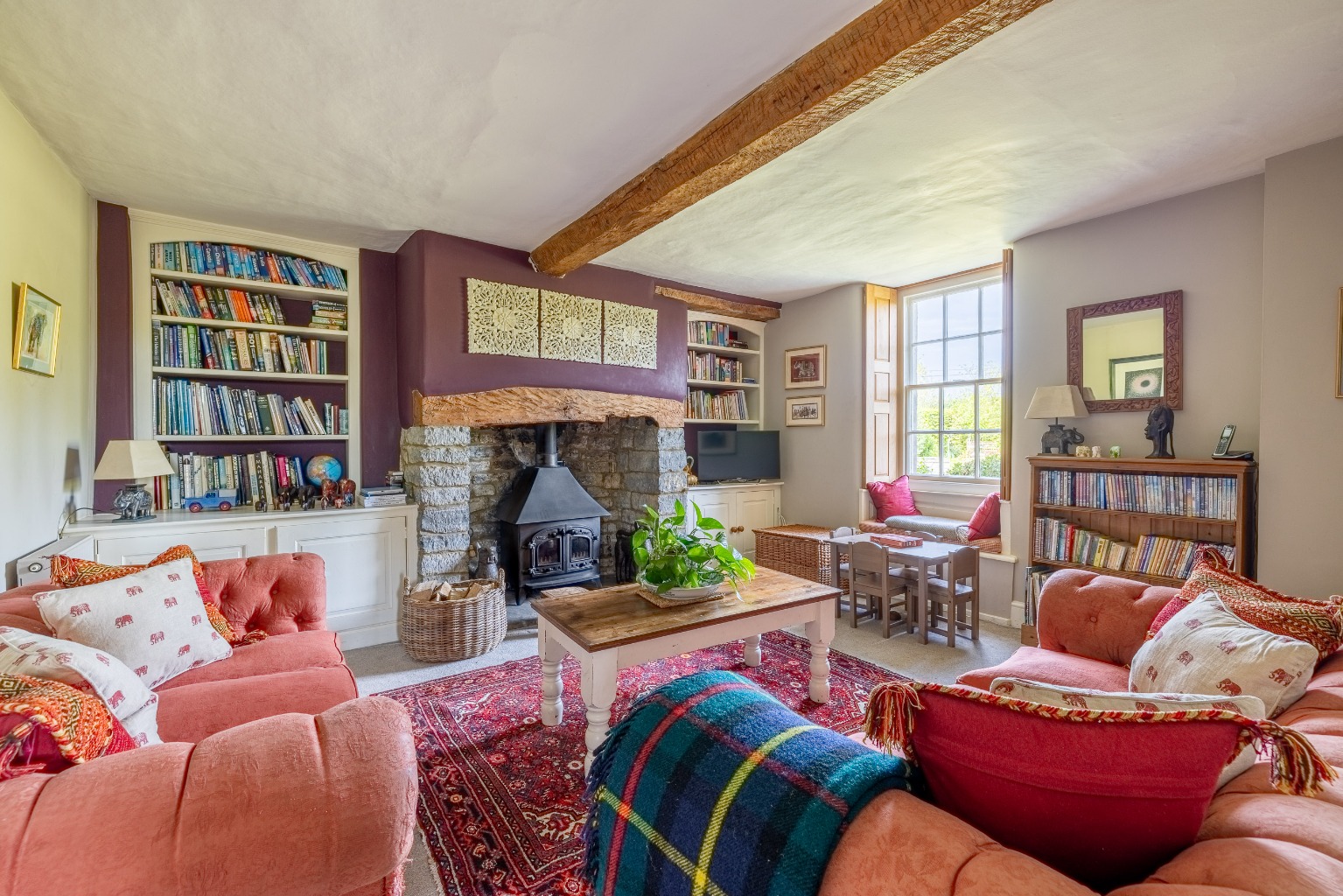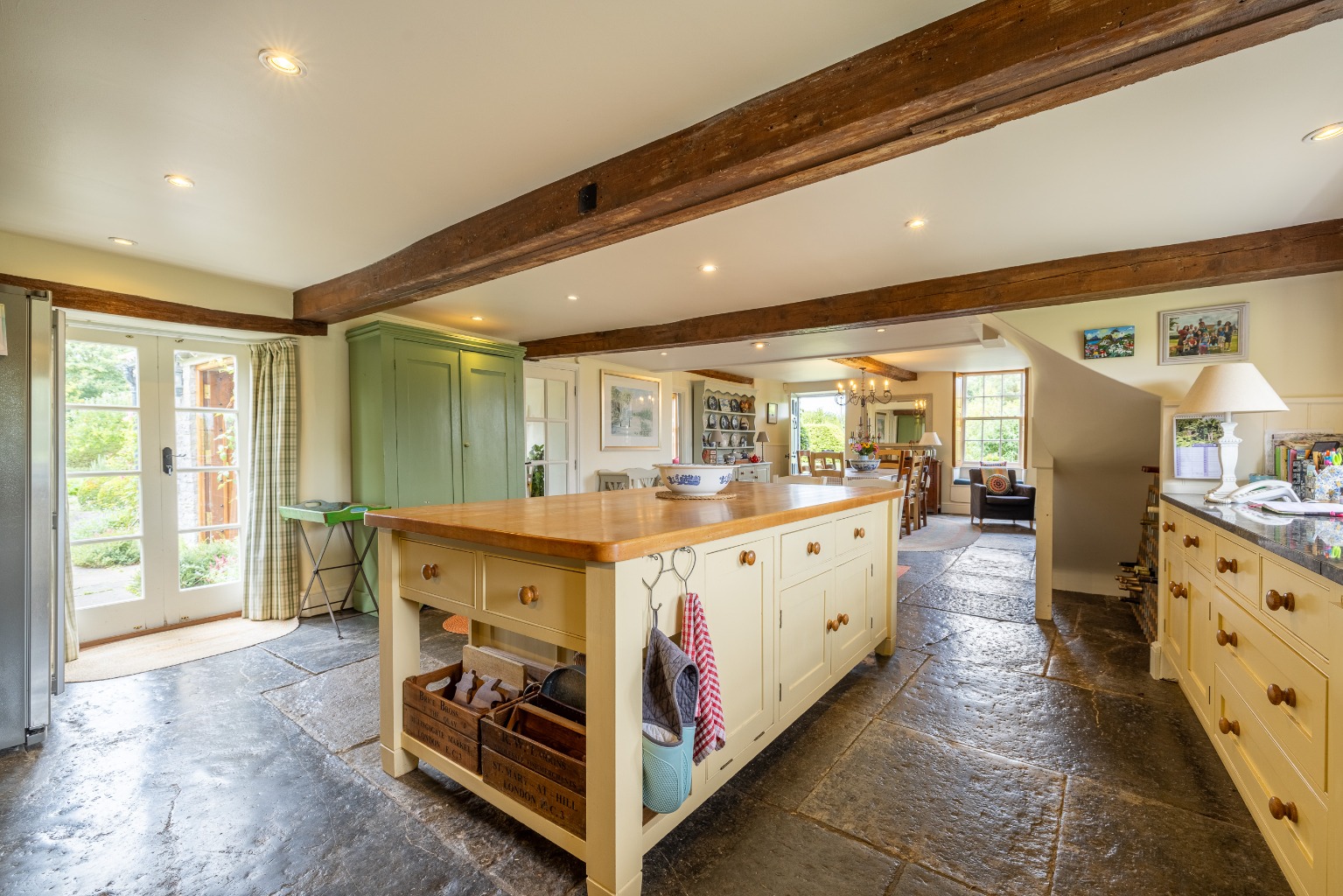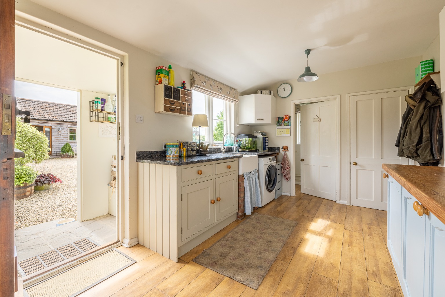 The kitchen dining room is a wonderful rustic living space with the original front door leading out to the front garden. Internally there are ceiling beams, flagstones, window seats beneath the sash windows, and a lovely inglenook fireplace with an inset wood-burning stove by the dining area. The kitchen itself has a good range of fitted solid wood cabinets with granite worktops above, a central island with a breakfast bar and an electric dual control Aga. Adjoining the kitchen, there is a most useful utility room with additional storage, plumbing for utilities, a cloakroom and a rear do...