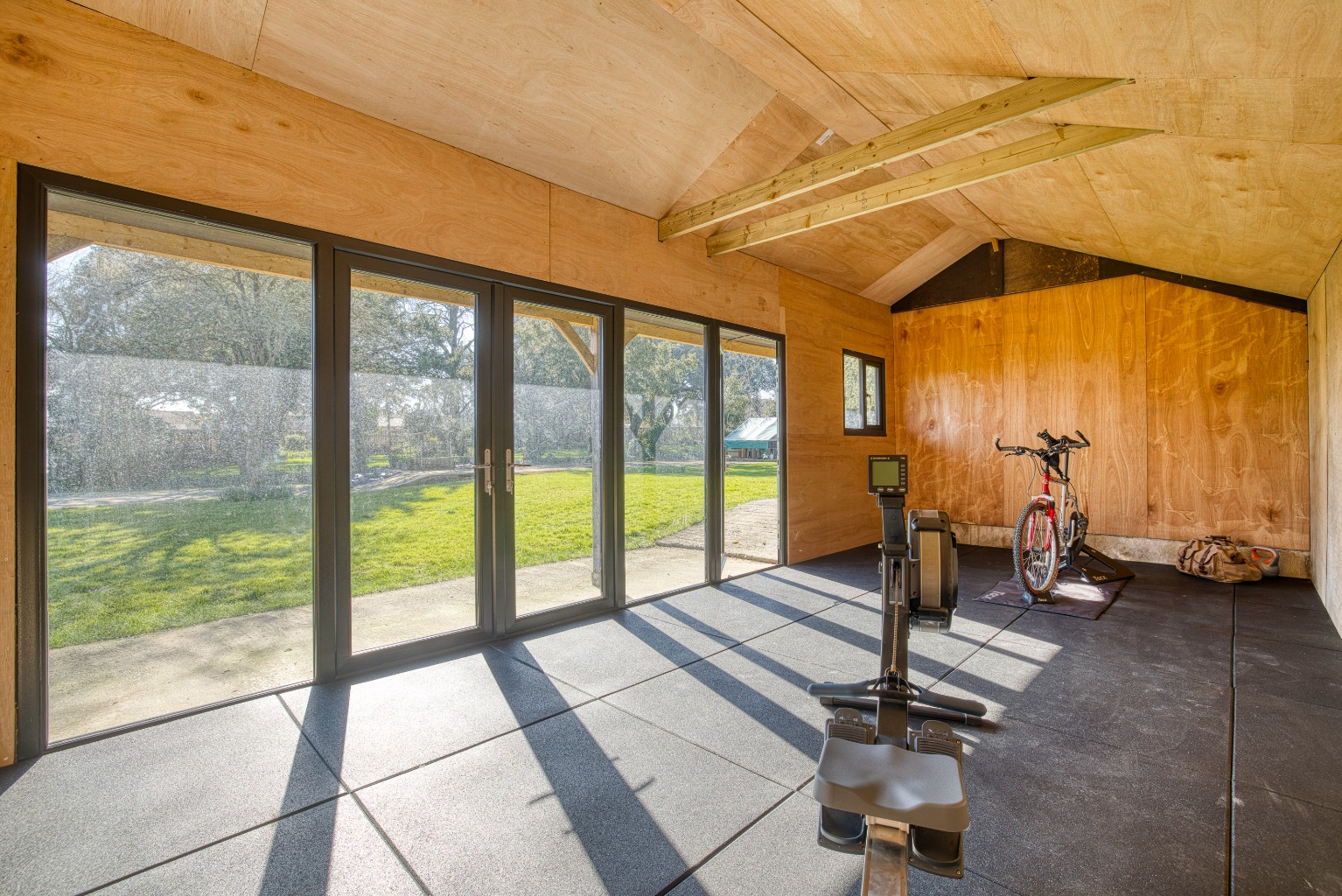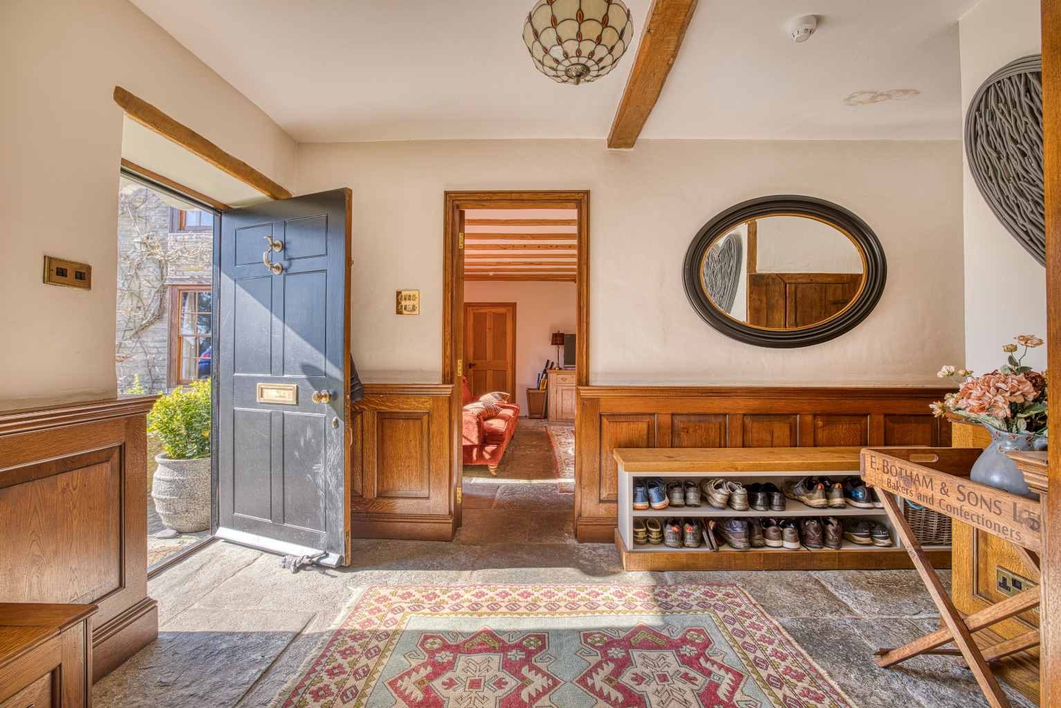 A stone entranceway with a driveway leading through opens to the parking area (with an 11 kWh electric car charger) in front of the house. A storm porch shelters the main entrance and opens into the impressive reception hall with oak fixtures, leaded windows, and a cloakroom set within the impressive oak joinery beneath the staircase. The hall provides access to the principal ground floor rooms, including the elegant sitting room with exposed ceiling beams, a wood-burning stove set within an inglenook fireplace, and a bay window with sash windows overlooking the front gardens.