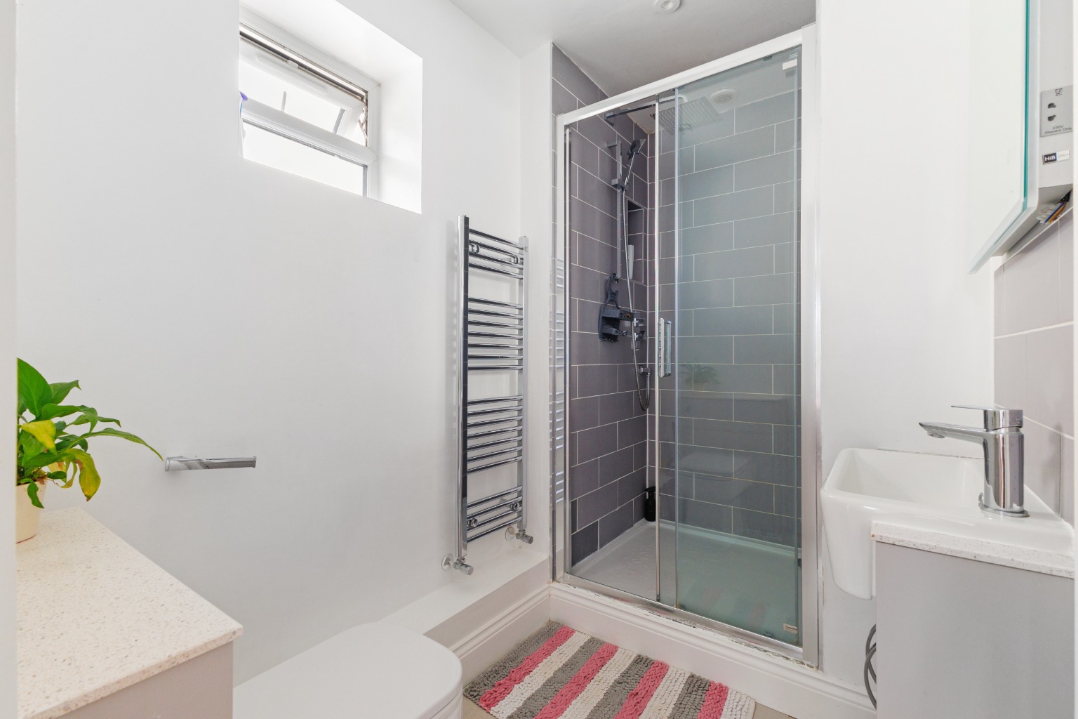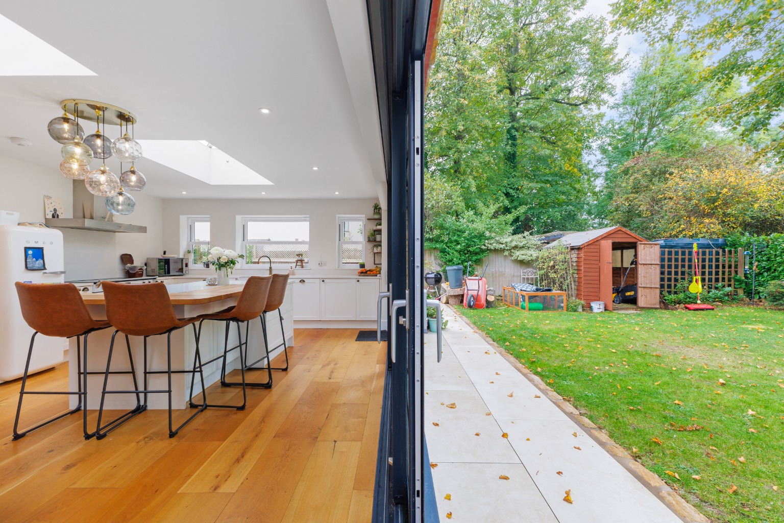 The contemporary kitchen extension backs onto the garden with floor-to-ceiling glass sliding doors leading out. Internally, there are beautifully appointed modern kitchen units with quartz worktops above. There is a large central island with a breakfast bar that has an oak worktop, and further room to relax or dine at the far end of the room. The dual aspect and sky lantern above the kitchen make this a lovely, light living space. Integral appliances include an electric range cooker and a dishwasher. The kitchen has a door leading into a large pantry with further storage cabinets.