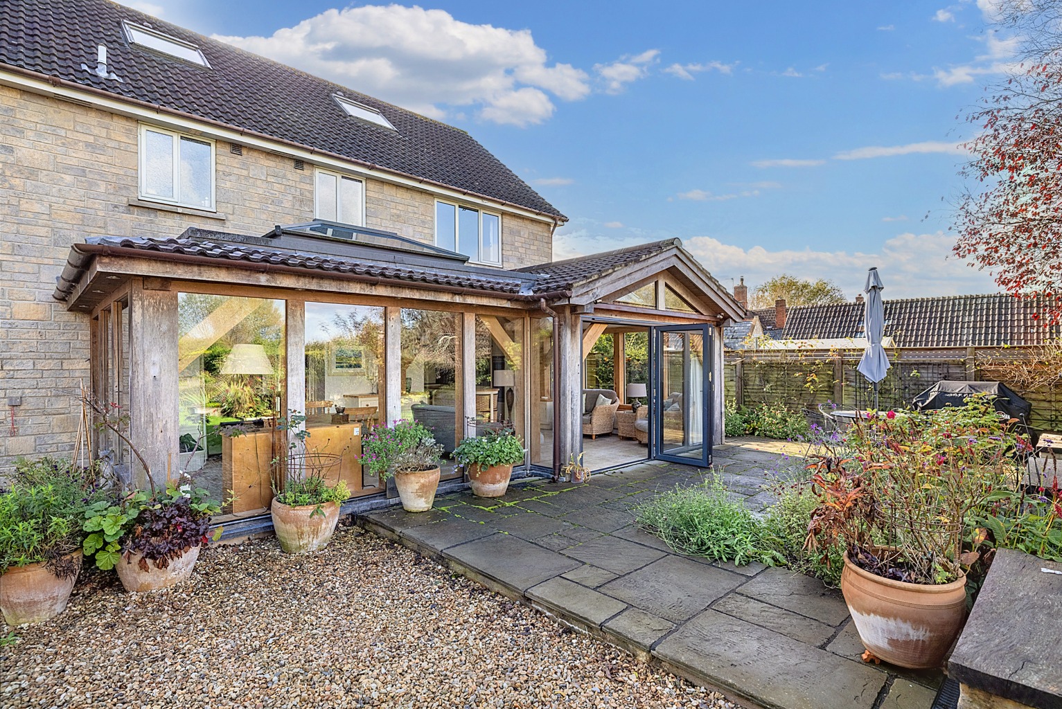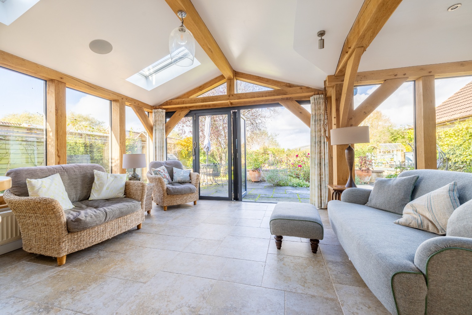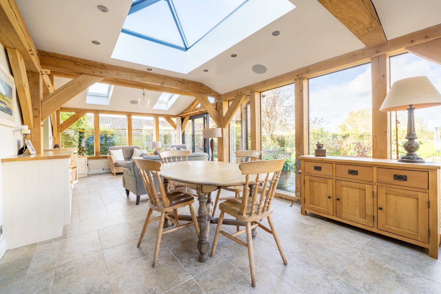 Internally, it's very well designed and has a spacious atmosphere created by the large rooms and the garden room which links through wide open archways with both the kitchen and the dining room. Other attractive details are the oak and pine floors in the reception rooms and the sandstone tiled floors in the kitchen and garden room.