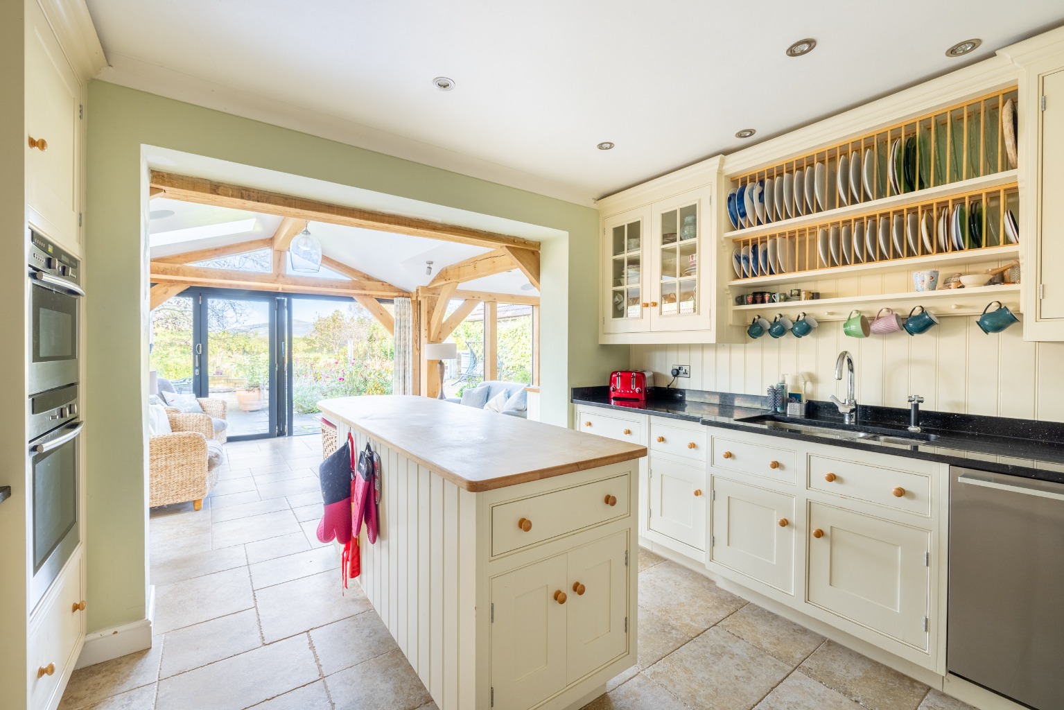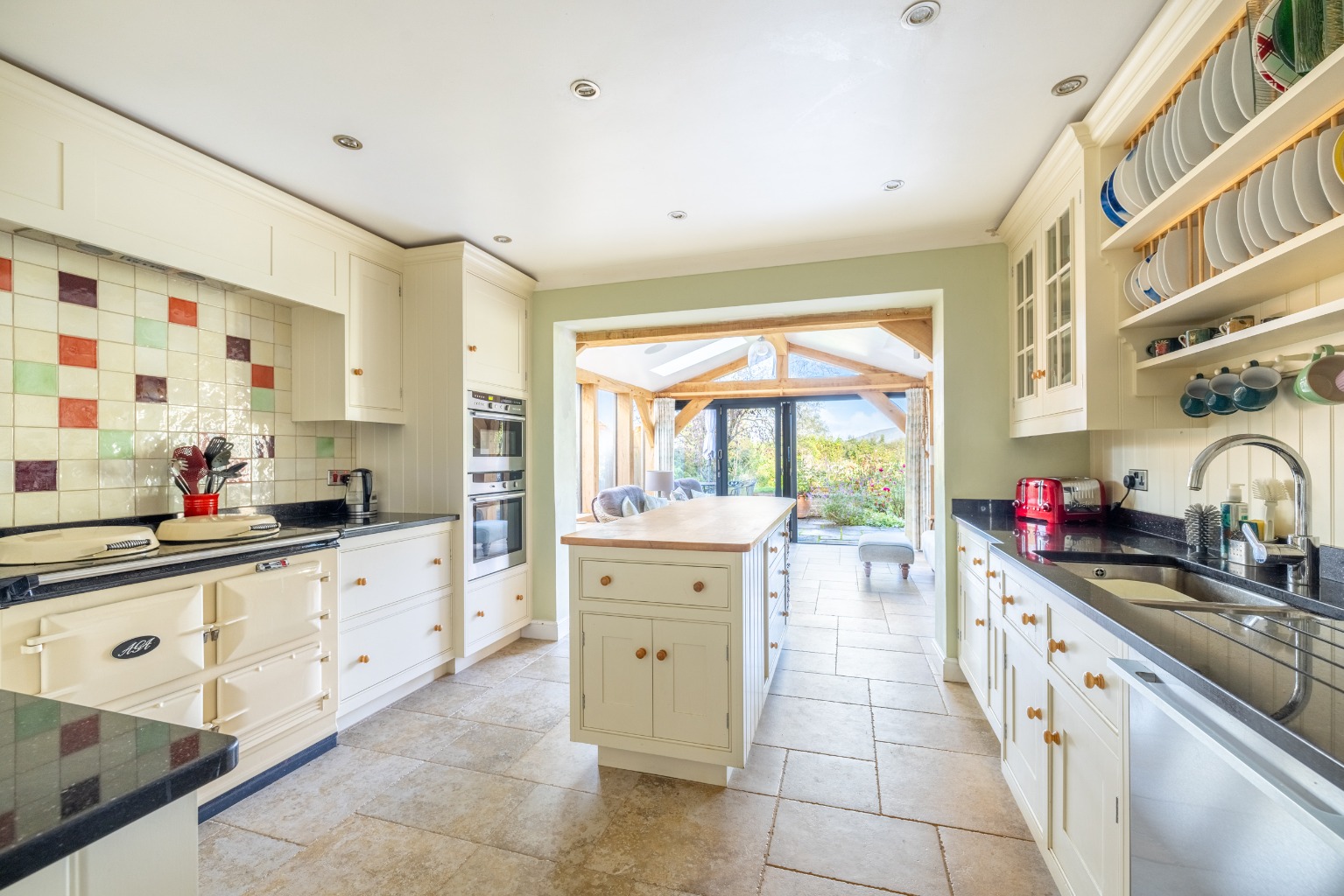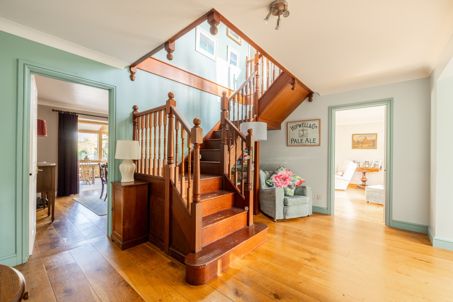 Internally, it's very well designed and has a spacious atmosphere created by the large rooms and the garden room which links through wide open archways with both the kitchen and the dining room. Other attractive details are the oak and pine floors in the reception rooms and the sandstone tiled floors in the kitchen and garden room.