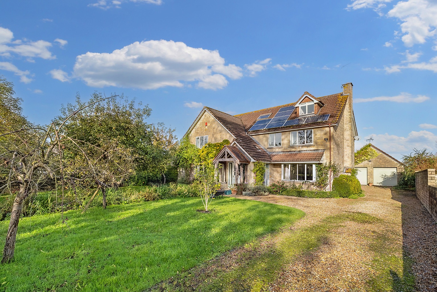 A great feature of the house is a large, oak framed garden room, and other accommodation includes a reception hall, cloakroom, a 25 ft. sitting room, separate dining room, study, kitchen (with an Aga) and a utility room.