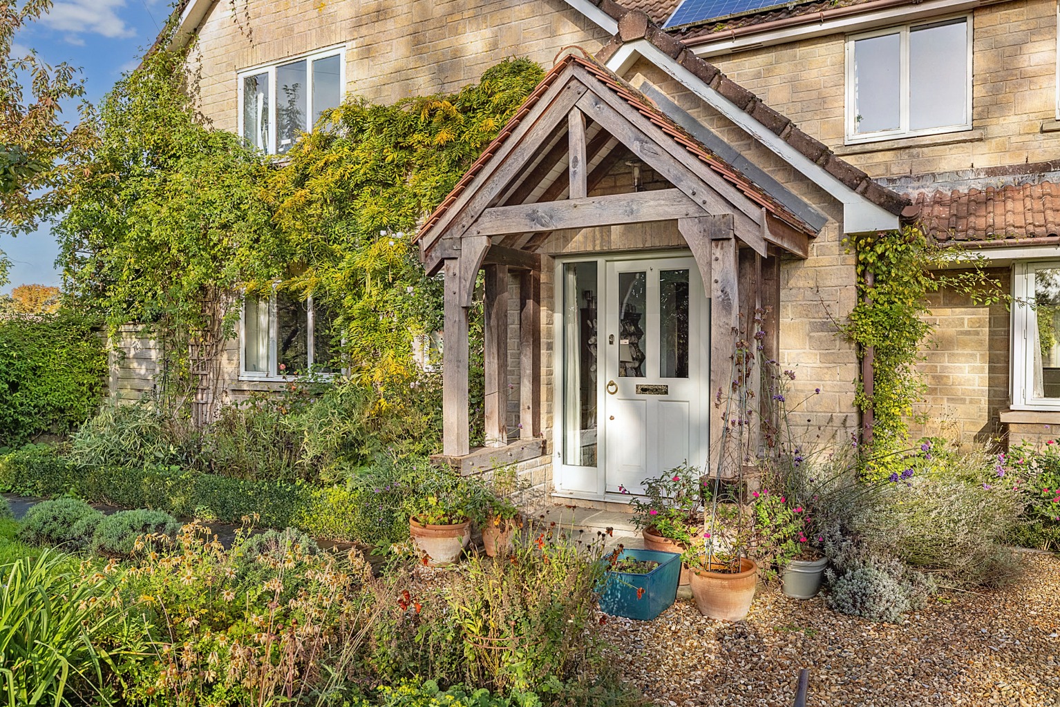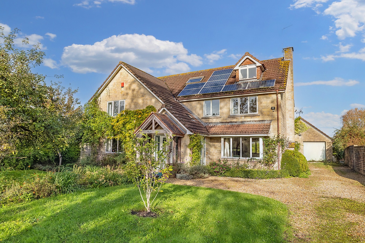The house stands with a southerly aspect within its own beautiful gardens. It's a handsome building with an oak framed porch, tiled and gabled roofs and a front elevation with climbing roses and wisteria.