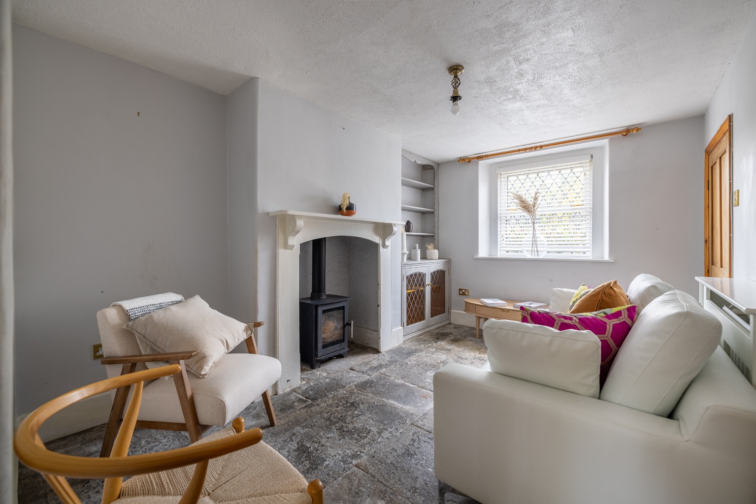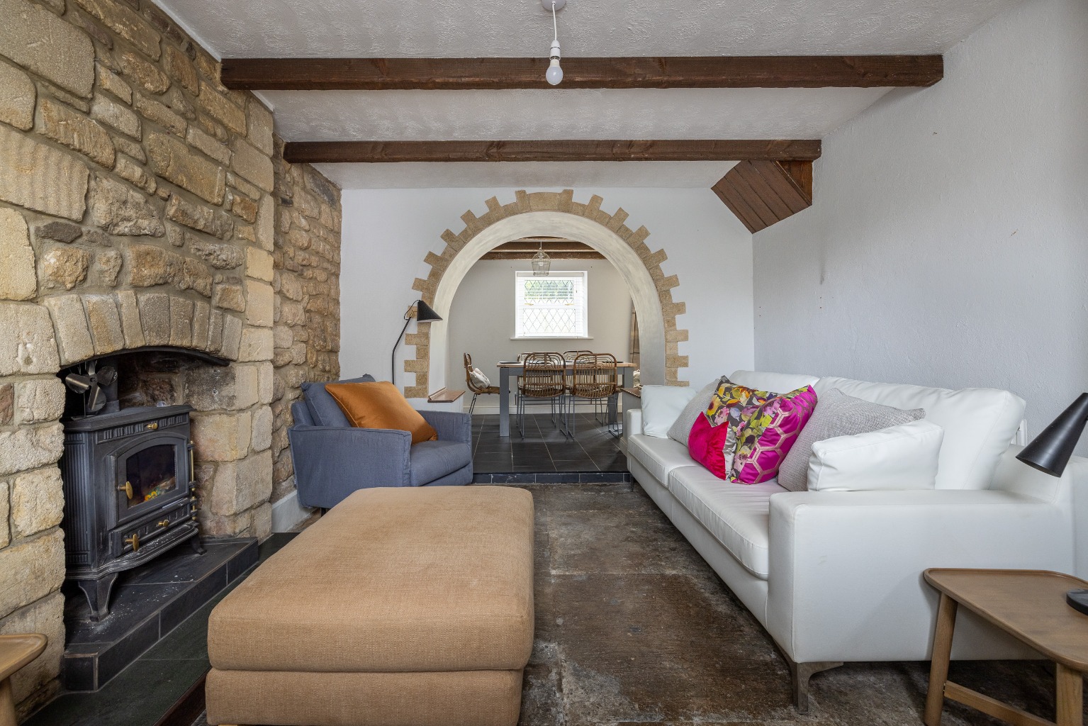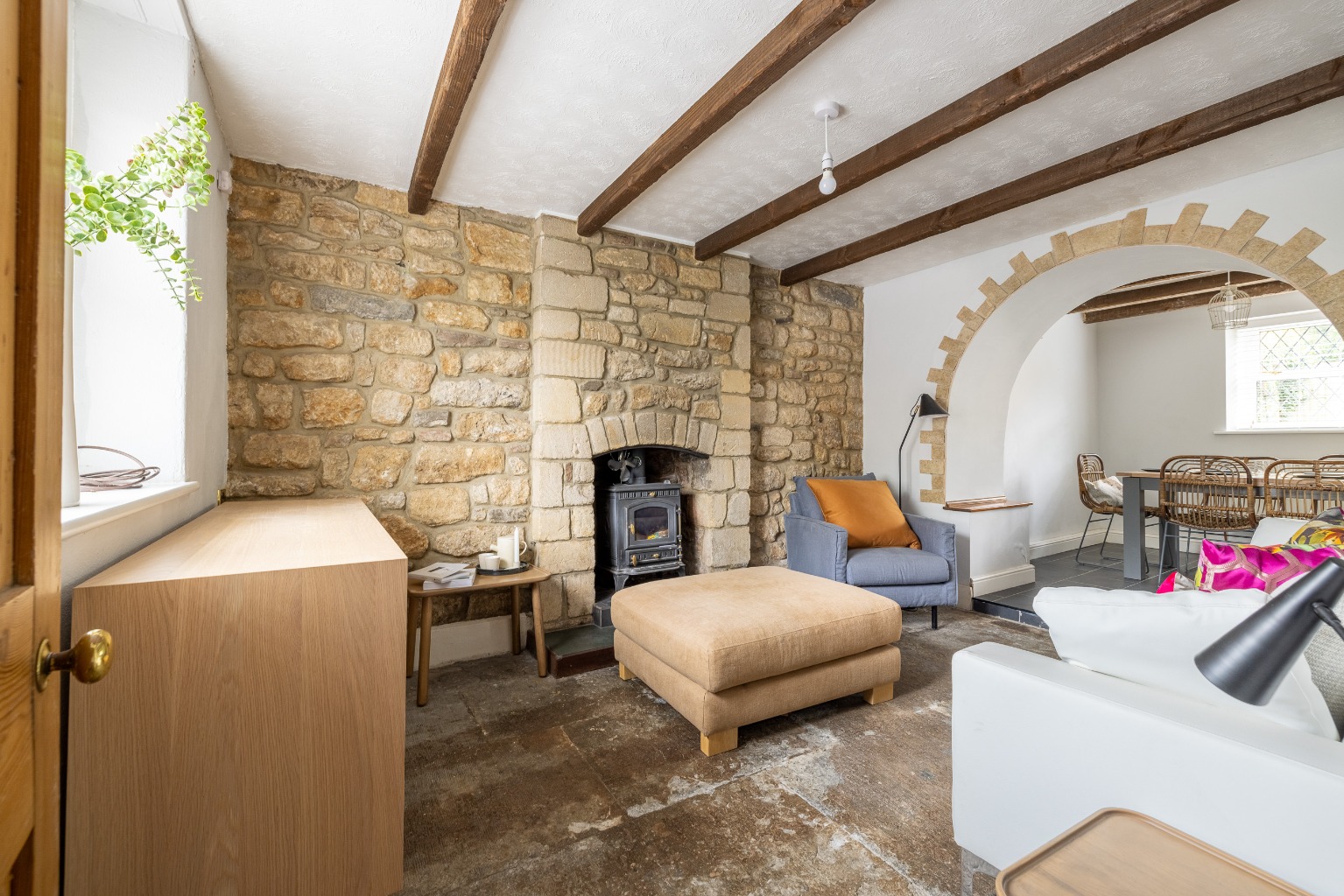 The front door opens to a central entrance hall. To the right is a living room and to the left a sitting room. Both have log burning stoves as focal points and windows to the east to catch the morning sun. The sitting room connects with the dining area through an attractive archway, which allows light to flood in from the windows on the west in the evening. The kitchen/dining room is spacious and bright, with painted, fitted units at the kitchen end, a double Belfast sink, and wooden worksurfaces. There is an integrated slimline dishwasher and electric oven, hob and extractor, with space for a washing machine and fridge/freezer and two large windows overlook the garden and a glazed door opens to the terrace at the rear. Glazed, double internal doors take you back into the living room.