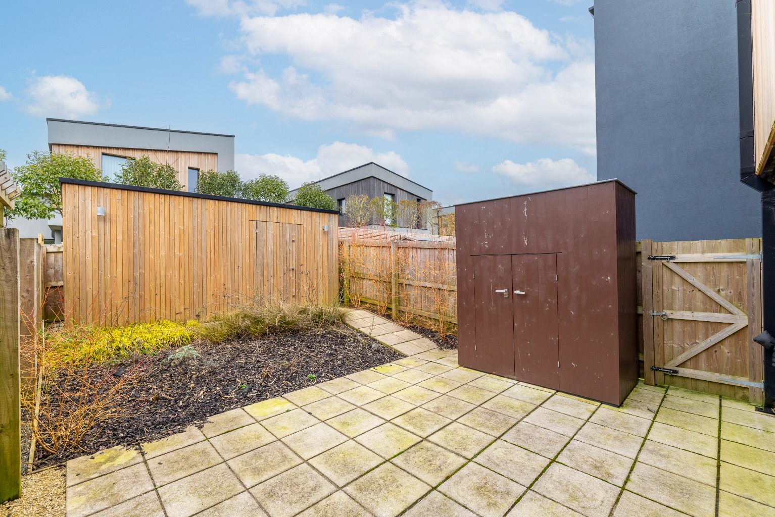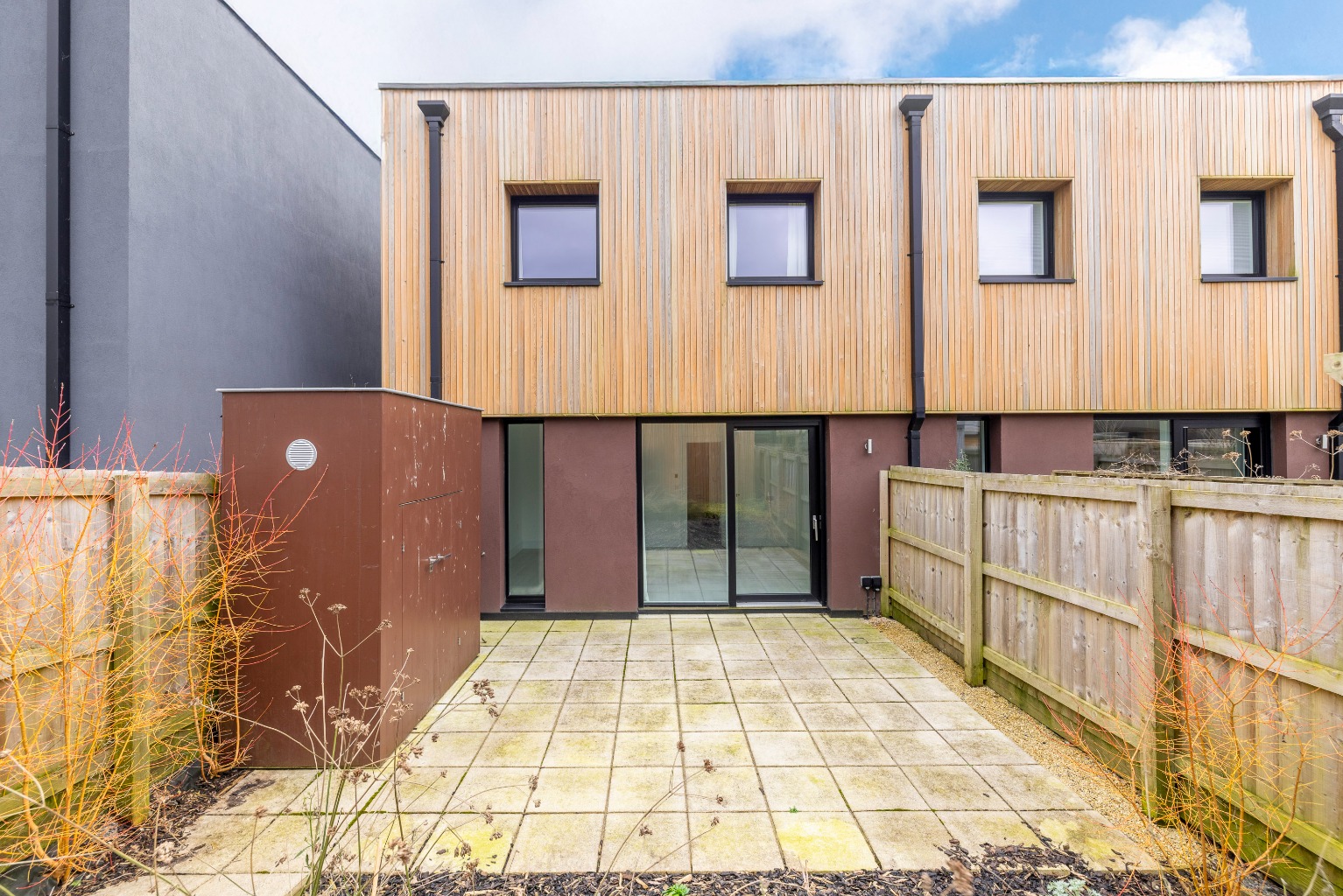 There is a small rear garden (with a large storage shed) and 3 allocated parking spaces.