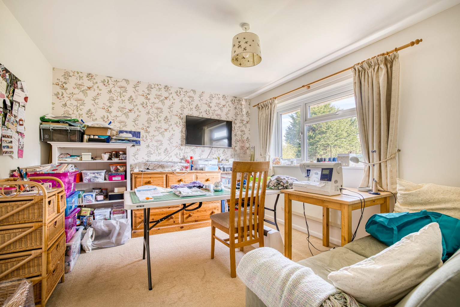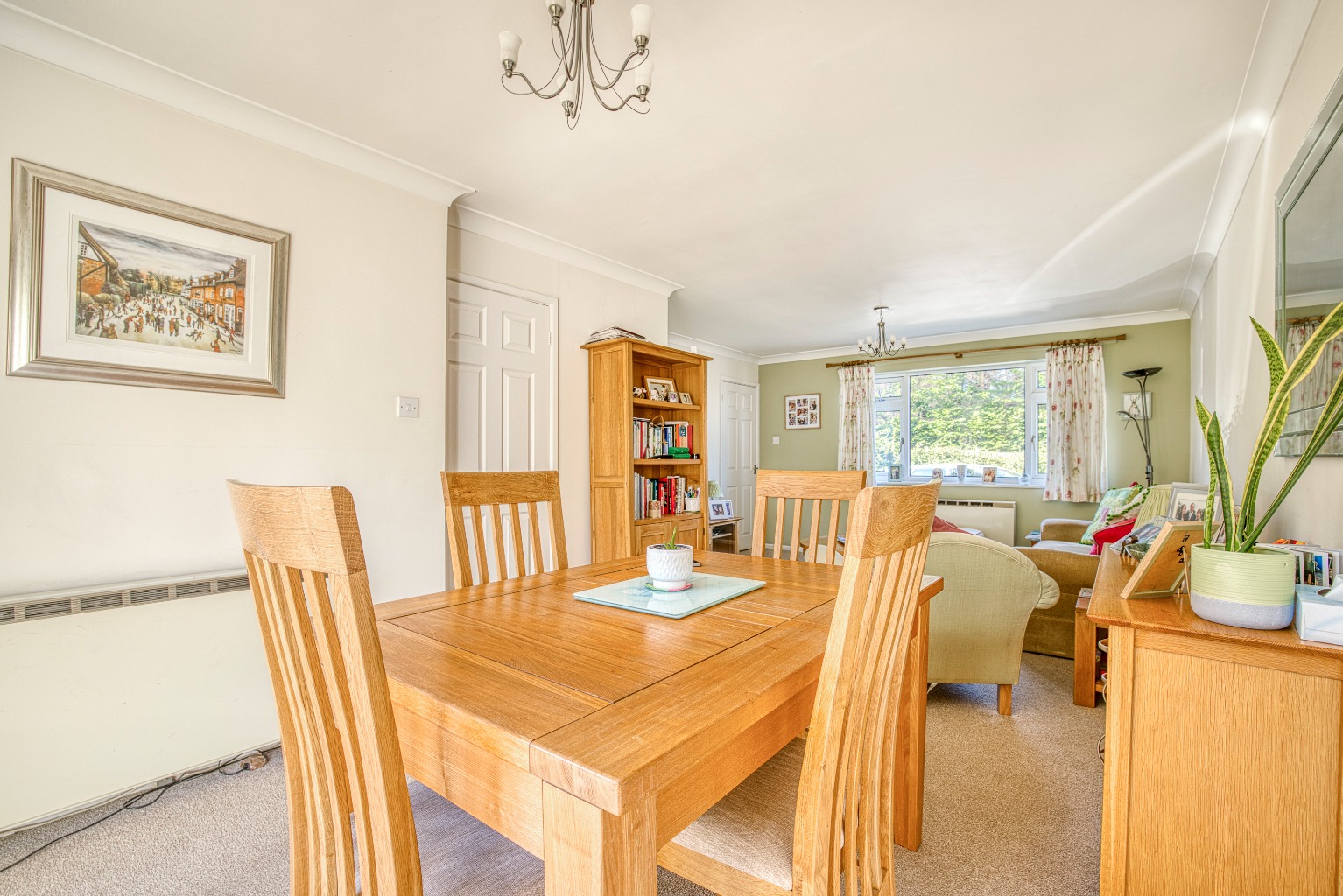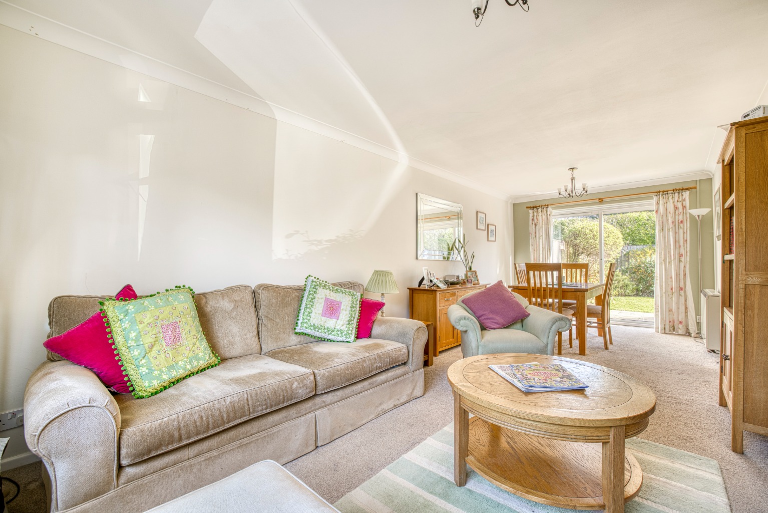 To the left of the hall, a bright sitting room features a large double-glazed window to the front and opens into a dining area with sliding doors to a paved terrace – the perfect space for entertaining or relaxed outdoor dining. The kitchen is well-equipped with a range of fitted units and enjoys an outlook over the rear garden. Adjoining the kitchen is a utility room providing access to both the garden and garage, with a conveniently located cloakroom.