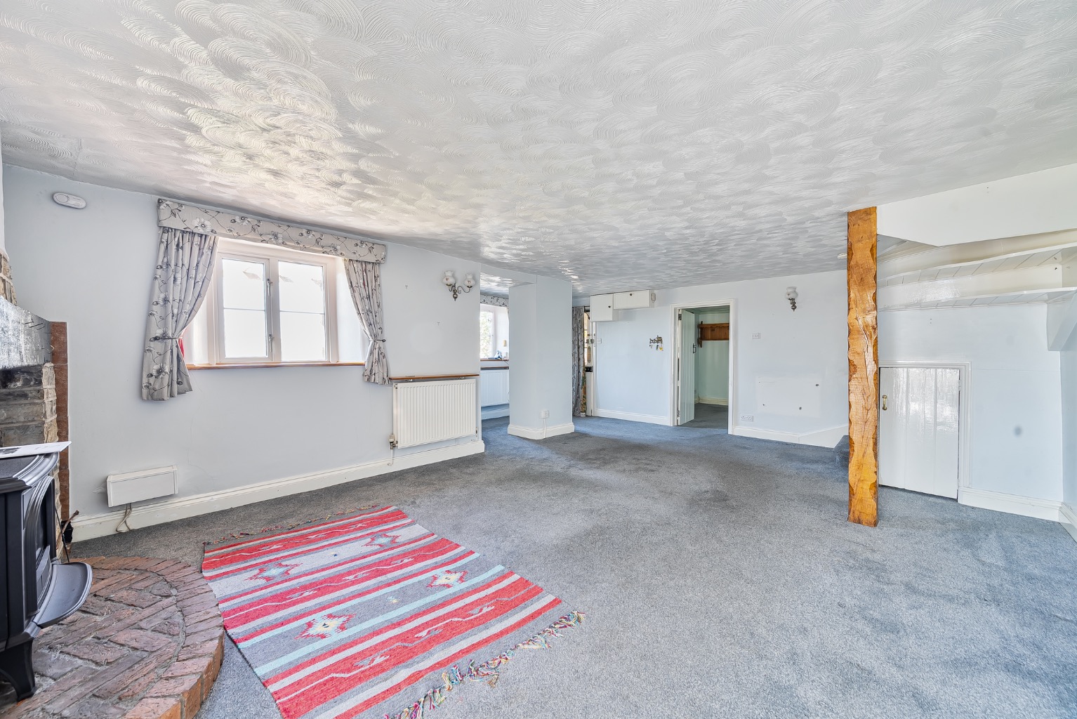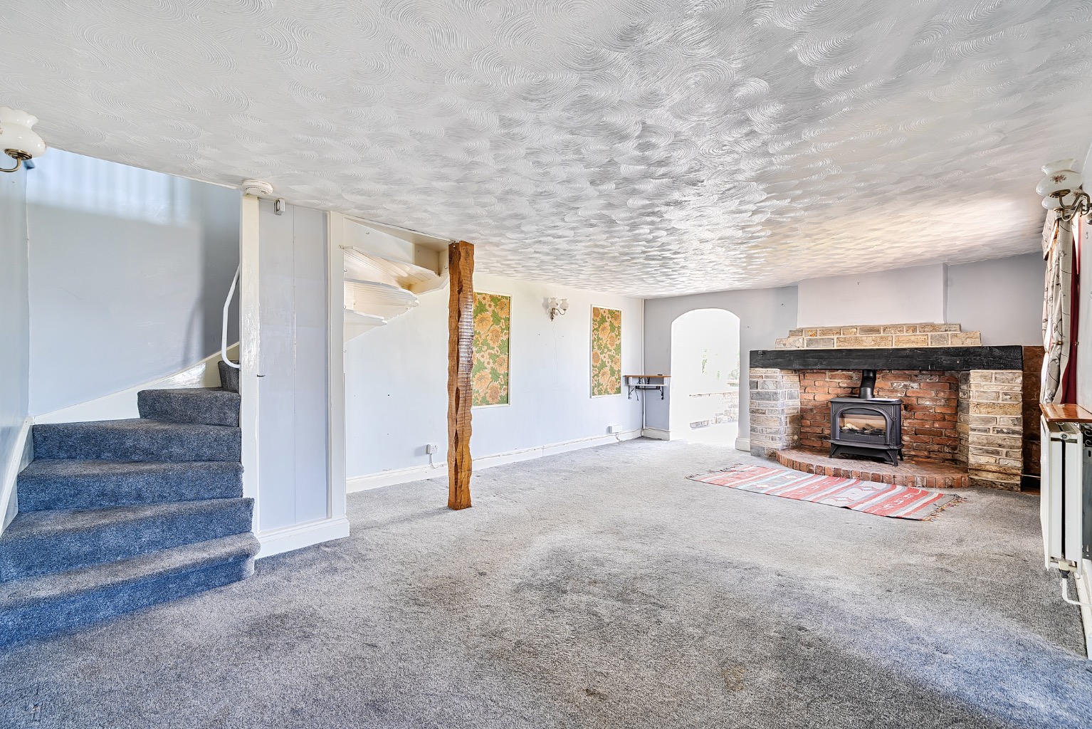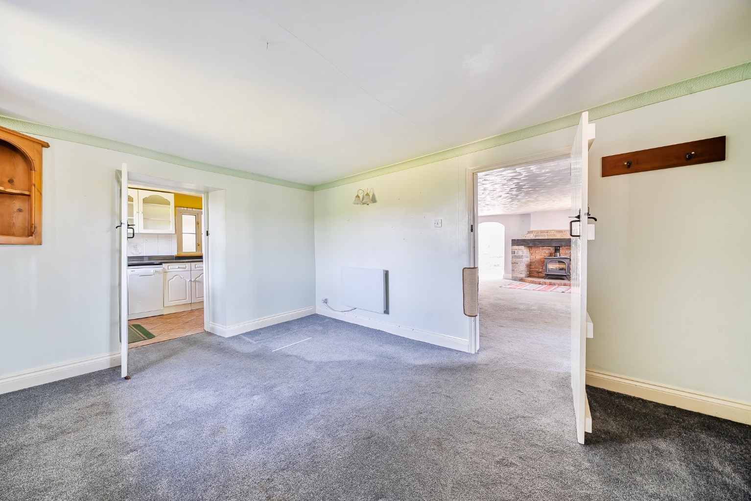 Entry is through a covered storm porch which leads into a welcoming entrance hall and sitting room. The sitting room is of an excellent size and features a striking lias stone and brick fireplace with a gas-fired stove inset—an ideal focal point. Stairs rise from this room to the first floor, while an archway leads to the garden-facing conservatory and a further door opens into the formal dining room.