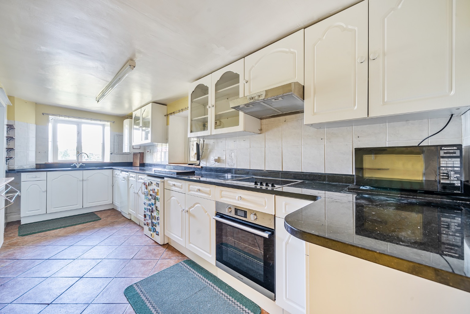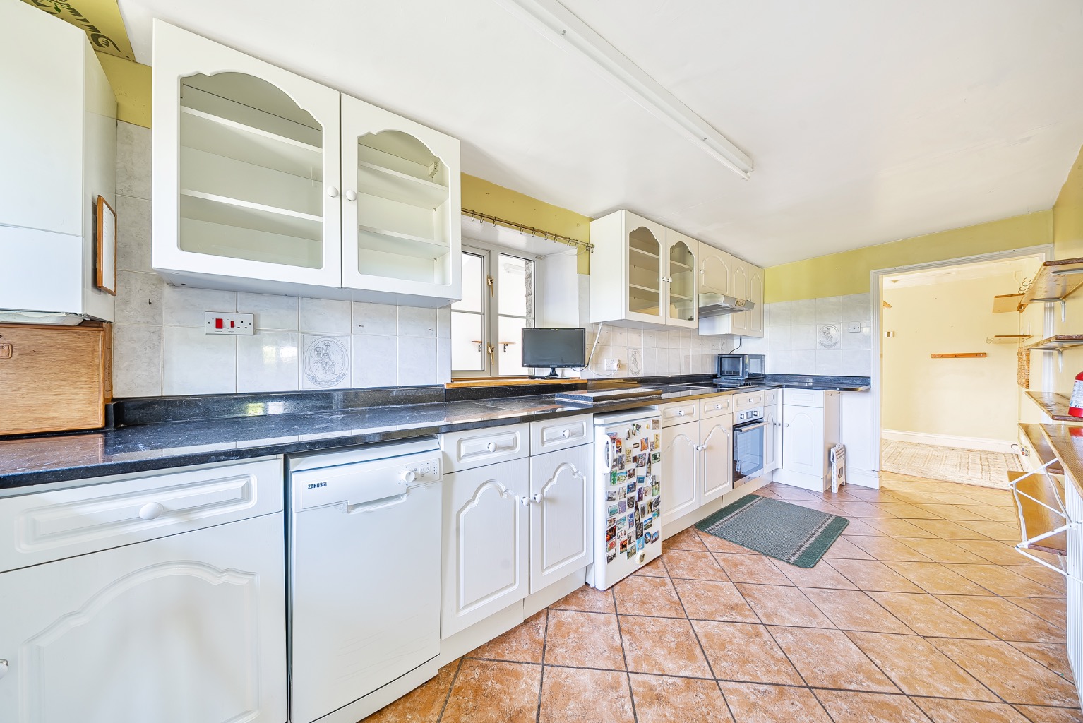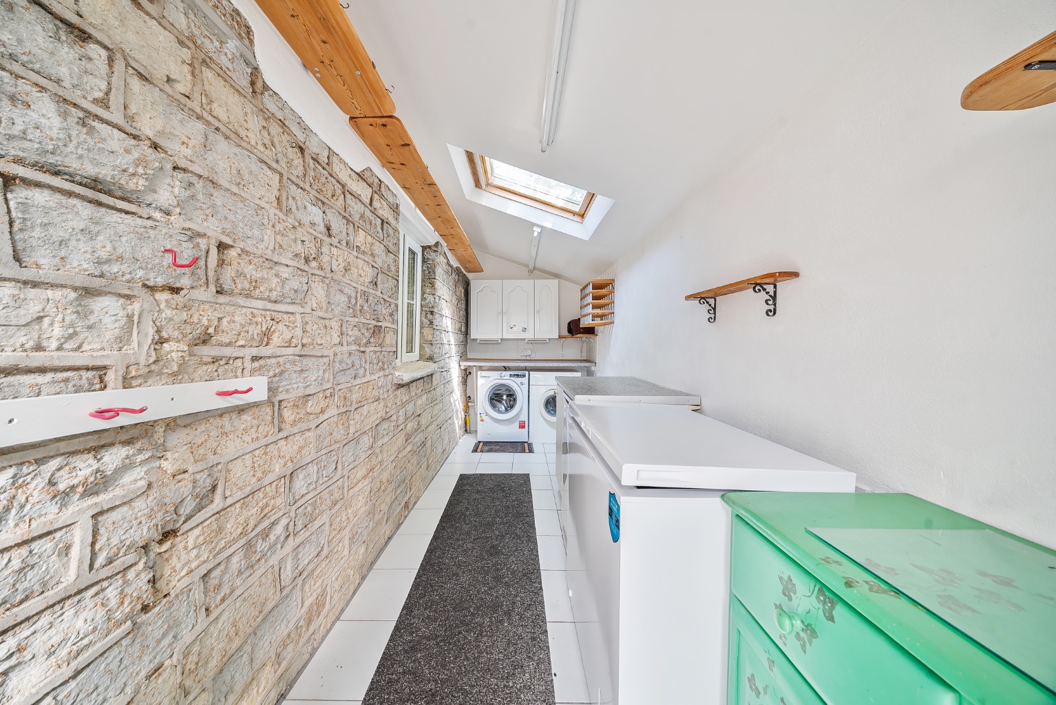 The conservatory provides a wonderful vantage point for enjoying the gardens and surrounding landscape, benefitting from a southerly and westerly aspect. The dining room connects easily with a thoughtfully designed galley kitchen, fitted with comprehensive range of cabinetry, granite worktops, and quarry-tiled flooring. A separate laundry room and ground floor shower room/WC offer additional convenience.