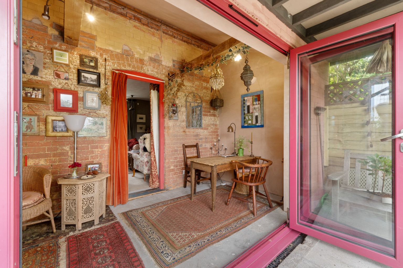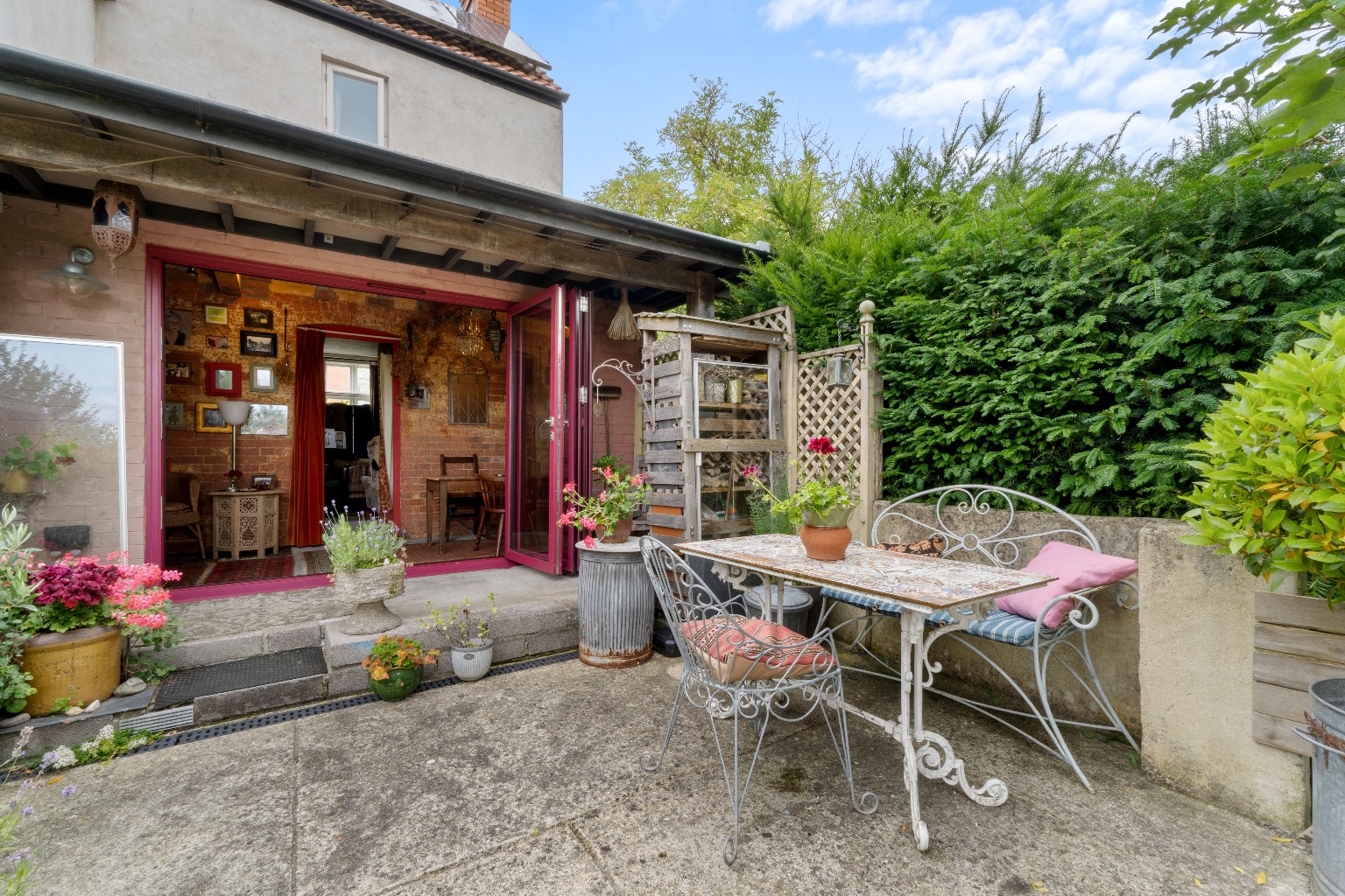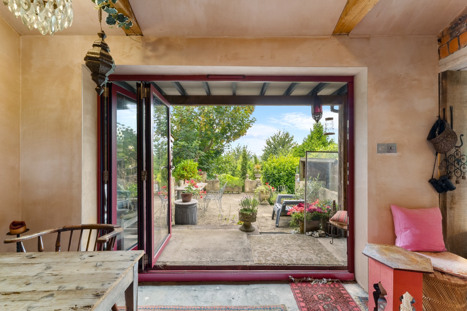On the left hand side there is a sitting room which has a front facing window and a fireplace with inset Jetmaster fire. Adjoining the sitting room, there is a fabulous, rustic garden room with bi-folding doors leading out to the garden. The garden room very easily becomes one with the terrace it connects to making it the ideal space in which to enjoy the summer and take in the southerly views. In addition, given the proximity to the kitchen this is the perfect place for a dining table too.