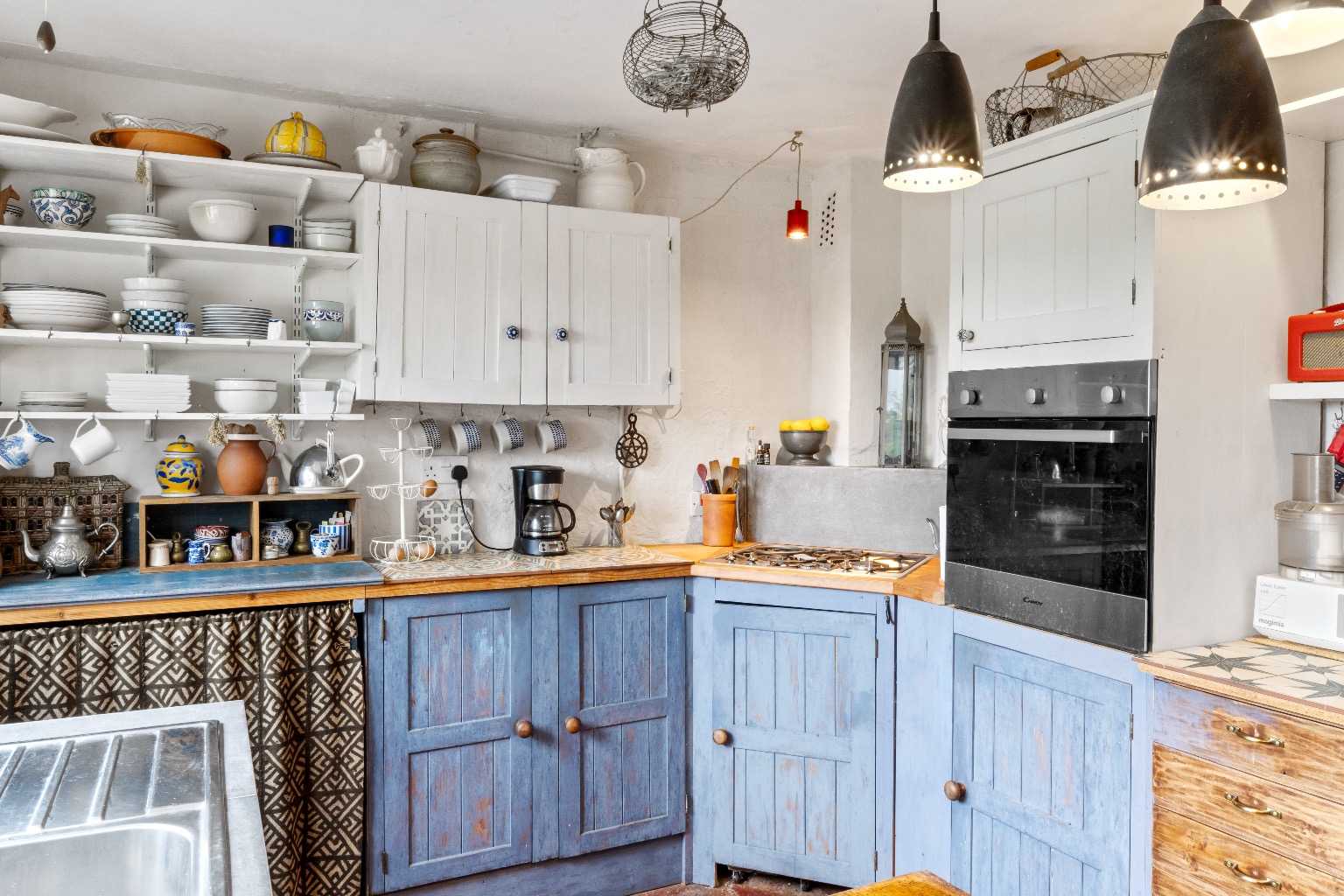 The kitchen has room for a breakfast table, and there are plenty of hand-painted units with a mixture of tiled, laminate and wooden worktops. There is additional shelving, a mid-level electric oven, and a gas hob.